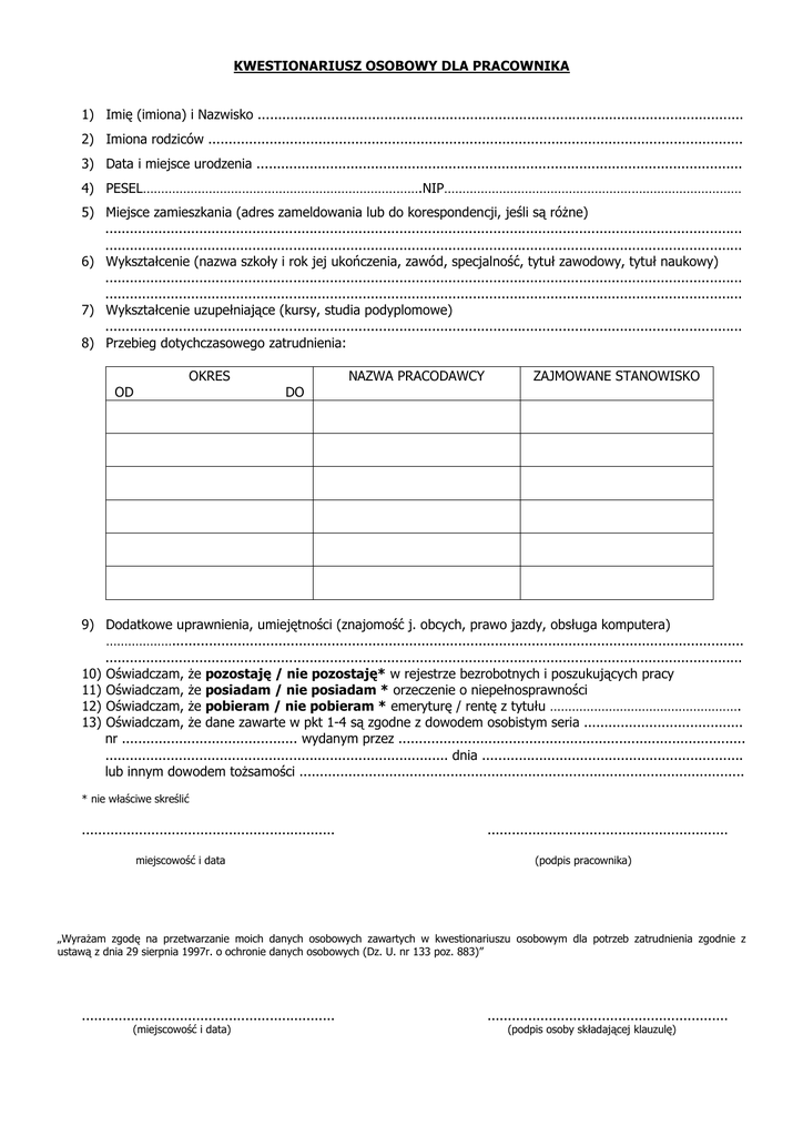 KWESTIONARIUSZ OSOBOWY DLA PRACOWNIKA 1) Imię (imiona) i Nazwisko ....................................................................................................................... 2) Imiona rodziców ................................................................................................................................... 3) Data i miejsce urodzenia ....................................................................................................................... 4) PESEL………………………………………………………………….NIP……………………………………………………………………… 5) Miejsce zamieszkania (adres zameldowania lub do korespondencji, jeśli są róŜne) ............................................................................................................................................................ ............................................................................................................................................................ 6) Wykształcenie (nazwa szkoły i rok jej ukończenia, zawód, specjalność, tytuł zawodowy, tytuł naukowy) ............................................................................................................................................................ ............................................................................................................................................................ 7) Wykształcenie uzupełniające (kursy, studia podyplomowe) ............................................................................................................................................................ 8) Przebieg dotychczasowego zatrudnienia: OKRES OD NAZWA PRACODAWCY ZAJMOWANE STANOWISKO DO 9) Dodatkowe uprawnienia, umiejętności (znajomość j. obcych, prawo jazdy, obsługa komputera) ………………............................................................................................................................................ ............................................................................................................................................................ 10) Oświadczam, Ŝe pozostaję / nie pozostaję* w rejestrze bezrobotnych i poszukujących pracy 11) Oświadczam, Ŝe posiadam / nie posiadam * orzeczenie o niepełnosprawności 12) Oświadczam, Ŝe pobieram / nie pobieram * emeryturę / rentę z tytułu ……………………………………………. 13) Oświadczam, Ŝe dane zawarte w pkt 1-4 są zgodne z dowodem osobistym seria ....................................... nr ........................................... wydanym przez ..................................................................................... .................................................................................... dnia ................................................................ lub innym dowodem toŜsamości ............................................................................................................. * nie właściwe skreślić .............................................................. miejscowość i data ........................................................... (podpis pracownika) „WyraŜam zgodę na przetwarzanie moich danych osobowych zawartych w kwestionariuszu osobowym dla potrzeb zatrudnienia zgodnie z ustawą z dnia 29 sierpnia 1997r. o ochronie danych osobowych (Dz. U. nr 133 poz. 883)” .............................................................. (miejscowość i data) ........................................................... (podpis osoby składającej klauzulę)