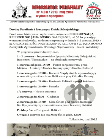 INFORMATOR PARAFIALNY maj 2013 nr 4(61) / 2013, maj 2013 wydanie specjalne parafii kościoła rzymsko-katolickiego p.w. św. Jakuba Apostoła w Tolkmicku (Salezjanie) strona 1 Informator Parafialny nr 4(61)/2013 ŚW. JAN BOSKO Ks. Bosko należy do grona świętych, którzy na stałe weszli do historii Kościoła i świata. Zasłynął jako genialny wychowawca, „Ojciec i Nauczyciel” młodzieży, pisarz i publicysta, założyciel zgromadzeń zakonnych. Stworzył styl wychowania nazywany systemem prewencyjnym bądź uprzedzającym. Urodził się 16 sierpnia 1815 roku w ubogiej wiejskiej rodzinie w Becchi niedaleko Turynu. Jego rodzicami byli Franciszek Bosko i Małgorzata Occhiena, którzy na chrzcie dali mu dwa imiona: Jan Melchior. Kiedy Janek miał dwa lata, umarł ojciec. Wychowaniem dzieci zajęła się wówczas ich mama, Małgorzata. Z domu rodzinnego Jan wyniósł pobożność i chęć do nauki. Jednak aby móc zdobywać wiedzę, musiał ciężko pracować. Dzięki inteligencji i wytrwałości oraz przy pomocy życzliwych ludzi ukończył szkołę, a następnie w 1835 roku wstąpił do seminarium duchownego w Chieri i sześć lat później otrzymał święcenia kapłańskie. strona 2 Rok 2013 Po święceniach ks. Bosko poznawał sytuację młodzieży żyjącej w Turynie. Postanowił stworzyć warunki, które pomogą przygotować chłopców do godnego dorosłego życia. W dzielnicy Valdocco założył więc oratorium, miejsce, w którym chłopcy mogli się uczyć pisać i czytać, gdzie mogli coś zjeść i bawić się, gdzie mogli czuć się jak w domu. Ks. Bosko, mając głębokie przeświadczenie, że został posłany przez Boga po to, by prowadzić młodych do świętości, pomagał im nie tylko w wymiarze materialnym, ale również duchowym. Uczył ich modlitwy i zachęcał do częstego przystępowania do sakramentów spowiedzi i Komunii świętej. W 1859 roku powołał do życia Towarzystwo św. Franciszka Salezego - nowe zgromadzenie zakonne nazywane potocznie Salezjanami Księdza Bosko. Odszedł do wieczności 31 stycznia 1888 roku w wieku 73 lat. W 1929 roku Jan Bosko został beatyfikowany przez Piusa XI, a pięć lat później kanonizowany. www.salezjanie.pl maj 2013 Niestety, kiedy zastosowali formułę chemiczną, którą wymyślili, nastąpiła reakcja, jakiej się nie spodziewali. Ciało zostało zniszczone na ich oczach. Aby uroczystości beatyfikacyjne mogły się odbyć, zachowane szczątki umieszczono w wykonanej z wosku replice ciała Jana Bosko, a następnie wystawiono do publicznej czci. Kolejny raz wyjęto relikwie na kanonizację w 1934 r. Potem relikwie świętego złożono na stałe w szklanym sarkofagu, który do dziś znajduje się nad bocznym ołtarzem w Bazylice Maryi Wspomożycielki Wiernych w Turynie. HISTORIA RELIKWII ŚW. JANA BOSKO Jan Bosko W 1929 r., tuż przed beatyfikacją św. Jana Bosko, został otworzony Jego grób, znajdujący się w Turynie. Po otwarciu grobowca, stwierdzono, że ciało zmarłego jest nienaruszone. Jednak po 41 latach od śmierci, skóra trochę pociemniała. Ponieważ ciało Księdza Bosko planowano przenieść w szklanej urnie z Valsalice na Valdocco, na uroczystości beatyfikacyjne, naukowcy i lekarze omówili sposób rozjaśnienia skóry. W 2006 r., podczas renowacji Bazyliki została wykonana replika figury św. Jana Bosko. W jej wnętrzu umieszczono cenną relikwię – prawą dłoń świętego. Kości dłoni ułożono na bawełnianym materiale w metalowej kasetce, która została przykryta przezroczystym, hartowanym szkłem, a następnie odpowiednio zabezpieczona. Później relikwie umieszczono w posrebrzanym pudełku i zaplombowano pieczęcią watykańską. Do relikwii dołączony jest dokument potwierdzający jej prawdziwość. strona 3 Informator Parafialny nr 4(61)/2013 Pudełko z relikwiami prawej dłoni umieszczone jest w klatce piersiowej repliki figury, przedstawiającej św. Jana Bosko w spoczynku. Od 2009 r. niezwykła urna z relikwią św. Jana Bosko przemierza kraje, w których są obecni Salezjanie. Peregrynacja urny przez pięć kontynentów, odbywa się w ramach przygotowania strona 4 Rok 2013 do obchodów dwusetnej rocznicy urodzin Jana Bosko, która nastąpi 16 sierpnia 2015 r. 1 czerwca br. o godz. 21:00 Relikwie przybędą do naszej wspólnoty. Jest to dla nas ogromne wyróżnienie. Postarajmy się o przygotowanie duchowe i godne przeżycie tego niezwykłego wydarzenia. www.salezjanie.pl maj 2013 RELIKWIE ŚW. JANA BOSKO W POLSCE Do Polski przybywają relikwie św. Jana Bosko, wielkiego wychowawcy oraz patrona dzieci i młodzieży. W dniach od 27 maja do 17 sierpnia 2013 r. odwiedzą one ponad 50 miast i miejscowości na terenie całego kraju. Jest to wydarzenie bez precedensu dla Zgromadzenia Salezjańskiego i całej Rodziny Salezjańskiej. Obecność relikwii w Polsce jest częścią peregrynacji relikwii św. Jana Bosko po całym świecie. Swoje światowe tournée relikwiarz rozpoczął 25 kwietnia 2009 r. na 150-lecie powstania Zgromadzenia Salezjańskiego. Zakończy się natomiast w jubileuszowym 2015 roku, na dwusetlecie urodzin Księdza Bosko. W tym czasie urna dotrze do 130 krajów na 5 kontynentach, odwiedzając wszystkie te miejsca, gdzie obecny jest charyzmat salezjański. Jednym z takich miejsc jest Polska, gdzie Salezjanie prowadzą swoją działalność wychowawczą i duszpasterską od 1898 roku. W każdym miejscu, gdzie się pojawią relikwie będą one wystawione do publicznego kultu, najczęściej w kościołach. Dlatego do spotkania ze św. Janem Bosko w jego relikwiach zaproszeni są wszyscy ludzie. strona 5 Informator Parafialny nr 4(61)/2013 Zaproszeni są nie tylko ci, którzy znają Świętego Wychowawcę Młodzieży lub są związani z Rodziną Salezjańską, jak i ci, którzy chcieliby go poznać, a zwłaszcza rodzice, wychowawcy i nauczyciele. Grupą szczególnie zaproszoną są ludzie młodzi, którym św. Jan Bosko poświęcił swoje życie i których najbardziej ukoch