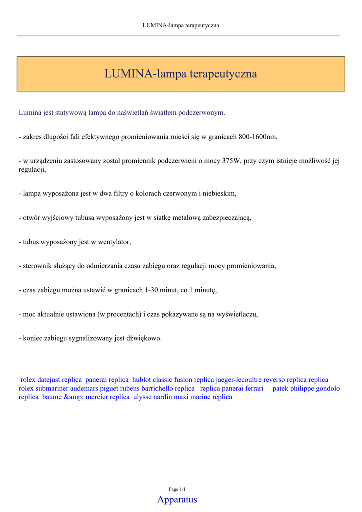 LUMINA-lampa terapeutyczna LUMINA-lampa terapeutyczna Lumina jest statywową lampą do naświetlań światłem podczerwonym. - zakres długości fali efektywnego promieniowania mieści się w granicach 800-1600nm, - w urządzeniu zastosowany został promiennik podczerwieni o mocy 375W, przy czym istnieje możliwość jej regulacji, - lampa wyposażona jest w dwa filtry o kolorach czerwonym i niebieskim, - otwór wyjściowy tubusa wyposażony jest w siatkę metalową zabezpieczającą, - tubus wyposażony jest w wentylator, - sterownik służący do odmierzania czasu zabiegu oraz regulacji mocy promieniowania, - czas zabiegu można ustawić w granicach 1-30 minut, co 1 minutę, - moc aktualnie ustawiona (w procentach) i czas pokazywane są na wyświetlaczu, - koniec zabiegu sygnalizowany jest dźwiękowo. rolex datejust replica panerai replica hublot classic fusion replica jaeger-lecoultre reverso replica replica rolex submariner audemars piguet rubens barrichello replica replica panerai ferrari patek philippe gondolo replica baume & mercier replica ulysse nardin maxi marine replica Page 1/1 Apparatus