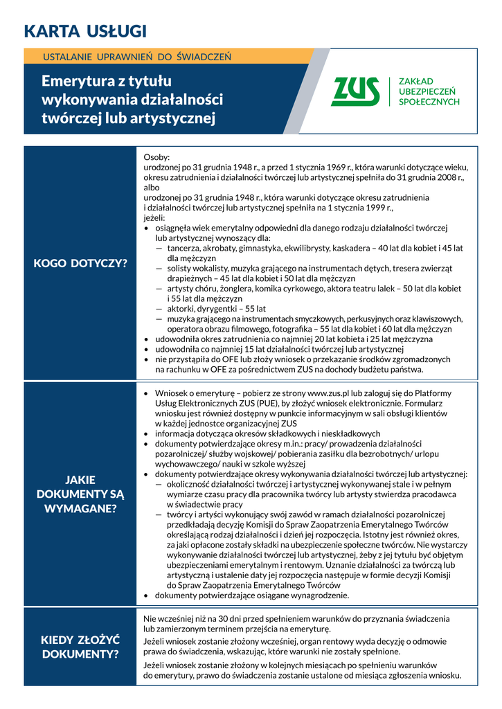 KARTA USŁUGI USTALANIE UPRAWNIEŃ DO ŚWIADCZEŃ Emerytura z tytułu wykonywania działalności twórczej lub artystycznej KOGO DOTYCZY? Osoby: urodzonej po 31 grudnia 1948 r., a przed 1 stycznia 1969 r., która warunki dotyczące wieku, okresu zatrudnienia i działalności twórczej lub artystycznej spełniła do 31 grudnia 2008 r., albo urodzonej po 31 grudnia 1948 r., która warunki dotyczące okresu zatrudnienia i działalności twórczej lub artystycznej spełniła na 1 stycznia 1999 r., jeżeli: • osiągnęła wiek emerytalny odpowiedni dla danego rodzaju działalności twórczej lub artystycznej wynoszący dla: —— tancerza, akrobaty, gimnastyka, ekwilibrysty, kaskadera – 40 lat dla kobiet i 45 lat dla mężczyzn —— solisty wokalisty, muzyka grającego na instrumentach dętych, tresera zwierząt drapieżnych – 45 lat dla kobiet i 50 lat dla mężczyzn —— artysty chóru, żonglera, komika cyrkowego, aktora teatru lalek – 50 lat dla kobiet i 55 lat dla mężczyzn —— aktorki, dyrygentki – 55 lat —— muzyka grającego na instrumentach smyczkowych, perkusyjnych oraz klawiszowych, operatora obrazu filmowego, fotografika – 55 lat dla kobiet i 60 lat dla mężczyzn • udowodniła okres zatrudnienia co najmniej 20 lat kobieta i 25 lat mężczyzna • udowodniła co najmniej 15 lat działalności twórczej lub artystycznej • nie przystąpiła do OFE lub złoży wniosek o przekazanie środków zgromadzonych na rachunku w OFE za pośrednictwem ZUS na dochody budżetu państwa. JAKIE DOKUMENTY SĄ WYMAGANE? • Wniosek o emeryturę – pobierz ze strony www.zus.pl lub zaloguj się do Platformy Usług Elektronicznych ZUS (PUE), by złożyć wniosek elektronicznie. Formularz wniosku jest również dostępny w punkcie informacyjnym w sali obsługi klientów w każdej jednostce organizacyjnej ZUS • informacja dotycząca okresów składkowych i nieskładkowych • dokumenty potwierdzające okresy m.in.: pracy/ prowadzenia działalności pozarolniczej/ służby wojskowej/ pobierania zasiłku dla bezrobotnych/ urlopu wychowawczego/ nauki w szkole wyższej • dokumenty potwierdzające okresy wykonywania działalności twórczej lub artystycznej: —— okoliczność działalności twórczej i artystycznej wykonywanej stale i w pełnym wymiarze czasu pracy dla pracownika twórcy lub artysty stwierdza pracodawca w świadectwie pracy —— twórcy i artyści wykonujący swój zawód w ramach działalności pozarolniczej przedkładają decyzję Komisji do Spraw Zaopatrzenia Emerytalnego Twórców określającą rodzaj działalności i dzień jej rozpoczęcia. Istotny jest również okres, za jaki opłacone zostały składki na ubezpieczenie społeczne twórców. Nie wystarczy wykonywanie działalności twórczej lub artystycznej, żeby z jej tytułu być objętym ubezpieczeniami emerytalnym i rentowym. Uznanie działalności za twórczą lub artystyczną i ustalenie daty jej rozpoczęcia następuje w formie decyzji Komisji do Spraw Zaopatrzenia Emerytalnego Twórców • dokumenty potwierdzające osiągane wynagrodzenie. KIEDY ZŁOŻYĆ DOKUMENTY? Nie wcześniej niż na 30 dni przed spełnieniem warunków do przyznania świadczenia lub zamierzonym terminem przejścia na emeryturę. Jeżeli wniosek zostanie złożony wcześniej, organ rentowy wyda decyzję o odmowie prawa do świadczenia, wskazując, które warunki nie zostały spełnione. Jeżeli wniosek zostanie złożony w kolejnych miesiącach po spełnieniu warunków do emerytury, prawo do świadczenia zostanie ustalone od miesiąca zgłoszenia wniosku. GDZIE I W JAKI SPOSÓB ZŁOŻYĆ DOKUMENTY? Wniosek można złożyć: • osobiście lub przez pełnomocnika w dowolnej jednostce organizacyjnej ZUS (pisemnie lub ustnie do protokołu) • za pośrednictwem: operatora pocztowego, polskiego urzędu konsularnego • w formie dokumentu elektronicznego przez PUE. JAK I KIEDY ZUS ZAŁATWI SPRAWĘ? Wniosek rozpatruje organ rentowy właściwy ze względu na miejsce zamieszkania osoby zainteresowanej lub jednostka organizacyjna Zakładu wyznaczona przez Prezesa ZUS. Po analizie wniosku i załączonej dokumentacji oraz ewentualnym przeprowadzeniu postępowania wyjaśniającego organ rentowy wydaje decyzję w terminie 30 dni od wyjaśnienia ostatniej okoliczności niezbędnej do wydania decyzji. CZY MOŻNA SIĘ ODWOŁAĆ? Od decyzji przysługuje odwołanie, które należy wnieść pisemnie lub ustnie do protokołu, za pośrednictwem jednostki organizacyjnej ZUS, która wydała decyzję, do sądu okręgowego – sądu pracy i ubezpieczeń społecznych, w terminie miesiąca od dnia doręczenia decyzji. Postępowanie odwoławcze jest wolne od opłat. INFORMACJE DODATKOWE Osoby z tej grupy wiekowej mogą wystąpić z wnioskiem o przyznanie emerytury z tytułu działalności twórczej lub artystycznej w dowolnym czasie po spełnieniu warunków, ale najpóźniej w dniu poprzedzającym dzień osiągnięcia powszechnego wieku emerytalnego. Osoba, która udowodniła wykonywanie pracy w szczególnych warunkach lub w szczególnym charakterze przez okres co najmniej 15 lat i nie skorzystała z możliwości nabycia prawa do emerytury wcześniejszej, emerytury pomostowej lub nauczycielskiego świadczenia kompensacyjnego, ma prawo do rekompensaty ustalanej jako dodatek do kapitału początkowego uwzględnianego przy obliczeniu emerytury powszechnej. Aby uzyskać bliższe informacje, przejdź do karty rekompensata z tytułu pracy w szczególnych warunkach lub w szczególnym charakterze. Prawo do emerytury ulega zawieszeniu w przypadku kontynuowania zatrudnienia, bez uprzedniego rozwiązania stosunku pracy u tego samego pracodawcy, na rzecz którego emeryt wykonywał je bezpośrednio przed dniem nabycia prawa do emerytury. Przy ustalaniu prawa do emerytury oraz obliczaniu jej wysokości okresy nieskładkowe uwzględnia się w wymiarze nieprzekraczającym jednej trzeciej udowodnionych okresów składkowych. Wniosek może zostać wycofany, jed