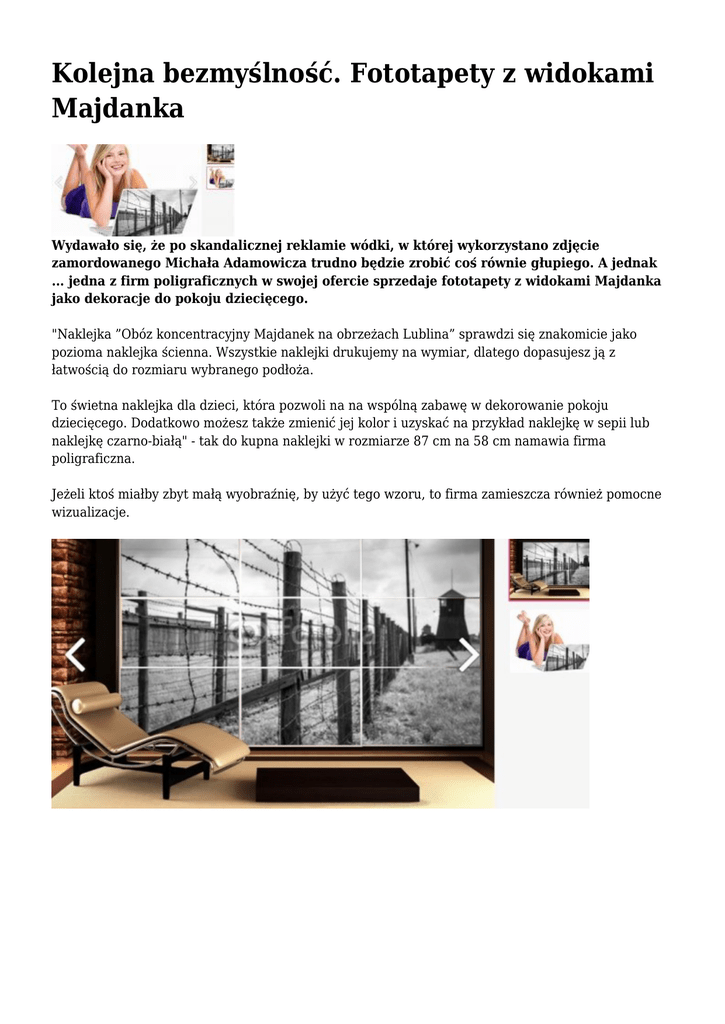 Kolejna bezmyślność. Fototapety z widokami Majdanka Wydawało się, że po skandalicznej reklamie wódki, w której wykorzystano zdjęcie zamordowanego Michała Adamowicza trudno będzie zrobić coś równie głupiego. A jednak ... jedna z firm poligraficznych w swojej ofercie sprzedaje fototapety z widokami Majdanka jako dekoracje do pokoju dziecięcego. "Naklejka ”Obóz koncentracyjny Majdanek na obrzeżach Lublina” sprawdzi się znakomicie jako pozioma naklejka ścienna. Wszystkie naklejki drukujemy na wymiar, dlatego dopasujesz ją z łatwością do rozmiaru wybranego podłoża. To świetna naklejka dla dzieci, która pozwoli na na wspólną zabawę w dekorowanie pokoju dziecięcego. Dodatkowo możesz także zmienić jej kolor i uzyskać na przykład naklejkę w sepii lub naklejkę czarno-białą" - tak do kupna naklejki w rozmiarze 87 cm na 58 cm namawia firma poligraficzna. Jeżeli ktoś miałby zbyt małą wyobraźnię, by użyć tego wzoru, to firma zamieszcza również pomocne wizualizacje.