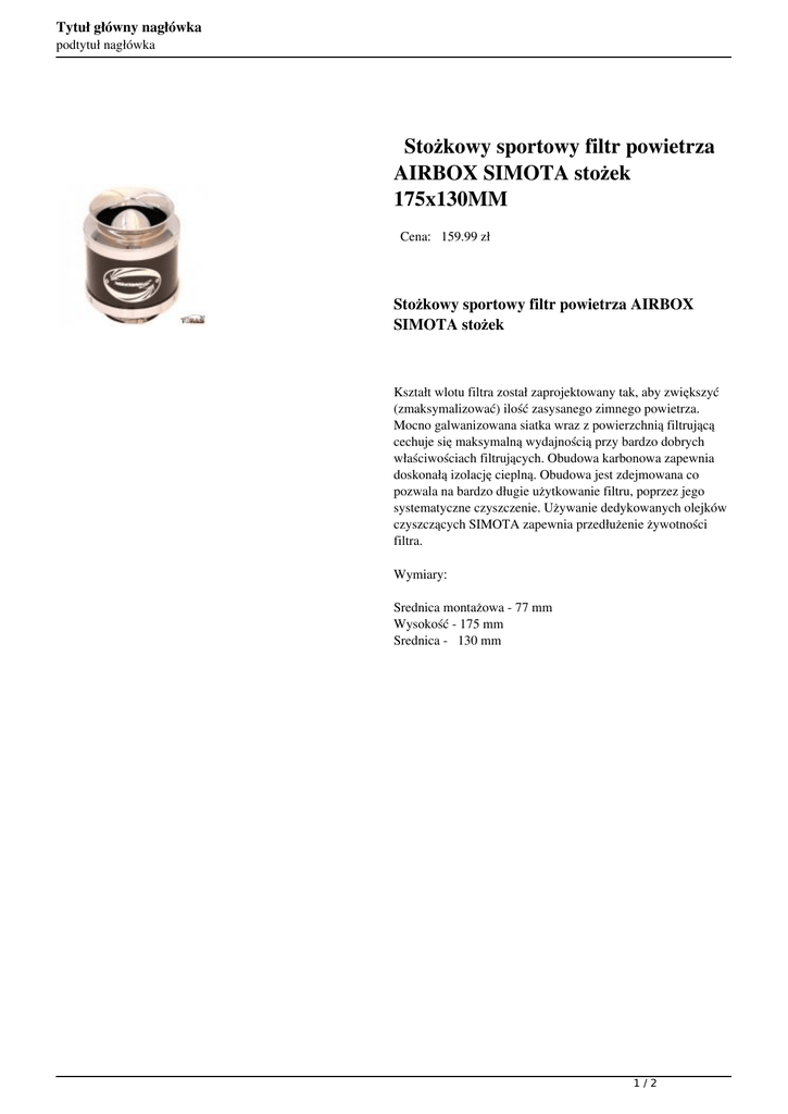 Tytuł główny nagłówka podtytuł nagłówka Stożkowy sportowy filtr powietrza AIRBOX SIMOTA stożek 175x130MM Cena: 159.99 zł Stożkowy sportowy filtr powietrza AIRBOX SIMOTA stożek Kształt wlotu filtra został zaprojektowany tak, aby zwiększyć (zmaksymalizować) ilość zasysanego zimnego powietrza. Mocno galwanizowana siatka wraz z powierzchnią filtrującą cechuje się maksymalną wydajnością przy bardzo dobrych właściwościach filtrujących. Obudowa karbonowa zapewnia doskonałą izolację cieplną. Obudowa jest zdejmowana co pozwala na bardzo długie użytkowanie filtru, poprzez jego systematyczne czyszczenie. Używanie dedykowanych olejków czyszczących SIMOTA zapewnia przedłużenie żywotności filtra. Wymiary: Srednica montażowa - 77 mm Wysokość - 175 mm Srednica - 130 mm 1/2 Tytuł główny nagłówka podtytuł nagłówka 2/2 Powered by TCPDF (www.tcpdf.org)