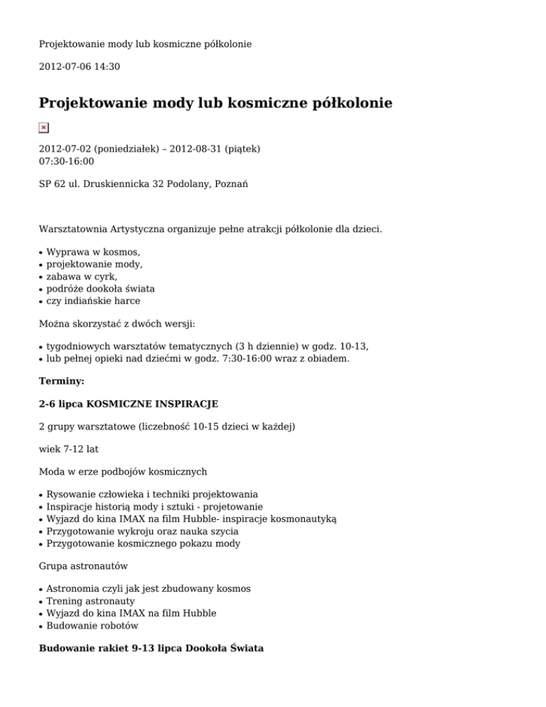 Projektowanie mody lub kosmiczne półkolonie 2012-07-06 14:30 Projektowanie mody lub kosmiczne półkolonie 2012-07-02 (poniedziałek) – 2012-08-31 (piątek) 07:30-16:00 SP 62 ul. Druskiennicka 32 Podolany, Poznań Warsztatownia Artystyczna organizuje pełne atrakcji półkolonie dla dzieci. ● ● ● ● ● Wyprawa w kosmos, projektowanie mody, zabawa w cyrk, podróże dookoła świata czy indiańskie harce Można skorzystać z dwóch wersji: ● ● tygodniowych warsztatów tematycznych (3 h dziennie) w godz. 10-13, lub pełnej opieki nad dziećmi w godz. 7:30-16:00 wraz z obiadem. Terminy: 2-6 lipca KOSMICZNE INSPIRACJE 2 grupy warsztatowe (liczebność 10-15 dzieci w każdej) wiek 7-12 lat Moda w erze podbojów kosmicznych ● ● ● ● ● Rysowanie człowieka i techniki projektowania Inspiracje historią mody i sztuki - projetowanie Wyjazd do kina IMAX na film Hubble- inspiracje kosmonautyką Przygotowanie wykroju oraz nauka szycia Przygotowanie kosmicznego pokazu mody Grupa astronautów ● ● ● ● Astronomia czyli jak jest zbudowany kosmos Trening astronauty Wyjazd do kina IMAX na film Hubble Budowanie robotów Budowanie rakiet 9-13 lipca Dookoła Świata (max 25 dzieci) ● ● ● ● ● Brazylia - dzień taneczny i piłkarski Afryka - wyjazd do ZOO Korea - teatr i sztuki walki Skandynawia- Wikingowie Hiszpania- corrida flamenco i żeglarstwo 27-31 sierpnia Indiańskie harce (max 25 dzieci) ● ● ● ● ● Gdzie żyli Indianie, jak żyli, przygotowanie pióropuszy Zabawa w podchody nad jeziorem Rusałka Wycieczka do Muzeum Arkadego Fiedlera Budowanie tipi Indiańska olimpiada- zawody oparte na indiańskich zabawach Plan dnia: ● ● ● ● ● ● 7:30- 9:30- drzwi wyobraźni- zajęcia kreatywne 9:30-10:00 II śniadanie 10:00-13:00 Warsztaty (wg, harmonogramu grupy) 13:00-13:30 Obiad 13:30-16:00 Gry zespołowe na dworze lub planszowe w przypadku brzydkiej pogody Cena: ● ● 1 tydzień (3hx5dni) 200 złz obiadem - 300 zł 2 tygodnie (3hx10dni) 350 złz obiadem 500 zł Zgłoszenia: [email protected] tel: 535-016-013 Zobacz www.facebook.com/warsztatowniaartystyczna Przeczytano: 23 razy
