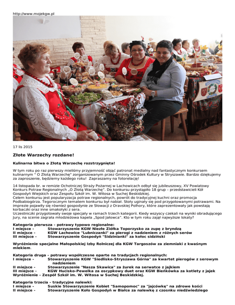 http://www.mojekgw.pl 17 lis 2015 Złote Warzechy rozdane! Kulinarna bitwa o Złotą Warzechę rozstrzygnięta! W tym roku po raz pierwszy mieliśmy przyjemność objąć patronat medialny nad fantastycznym konkursem kulinarnym " O Złotą Warzechę" zorganizowanym przez Gminny Ośrodek Kultury w Stryszawie. Bardzo dziękujemy za zaproszenie, będziemy każdego roku! Zapraszamy na fotorelację! 14 listopada br. w remizie Ochotniczej Straży Pożarnej w Lachowicach odbył się jubileuszowy, XV Powiatowy Konkurs Potraw Regionalnych „O Złotą Warzechę”. Do konkursu przystąpiło 18 grup – przedstawicieli Kół Gospodyń Wiejskich oraz Zespołu Szkół im. W. Witosa w Suchej Beskidzkiej. Celem konkursu jest popularyzacja potraw regionalnych, powrót do tradycyjnej kuchni oraz promocja Podbabiogórza. Tegorocznym tematem konkursu był nabiał. Stoły uginały się pod przygotowanymi potrawami. Na imprezie pojawiły się również gospodynie ze Słowacji z Oravskiej Polhory, które zaprezentowały jak powstają korbaczki oraz inne smakołyki z sera. Uczestniczki przygotowały swoje specjały w ramach trzech kategorii. Kiedy wszyscy czekali na wyniki obradującego Jury, na scenie zagrała młodzieżowa kapela „Spod Jałowca”. Kto w tym roku zajął najwyższe lokaty? Kategoria pierwsza - potrawy typowo regionalne: I miejsce Stowarzyszenie KGW Niezłe Ziółka Toporzysko za zupę z bryndzą II miejsce KGW Lachowice "Lubniczanki" za pierogi z nadzieniem z różnych serów III miejsce Stowarzyszenie Gospodyń "Sidzinianki" za kołoc sidziński Wyróżnienie specjalne Małopolskiej Izby Rolniczej dla KGW Targoszów za ziemniaki z kwaśnym mlekiem. Kategoria druga - potrawy współczesne oparte na tradycjach regionalnych: I miejsce Stowarzyszenie KGW "Siedlisko-Stryszawa Górna" za kwartet pierogów z serowym nadzieniem II miejsce Stowarzyszenie "Nasza Skawica" za żurek na serwatce z jajkiem III miejsce KGW Hucisko-Pewelka za oscypkowy duet oraz KGW Bieńkówka za kotlety z jajek Wyróżnienie - Zespół Szkół im. W. Witosa w Suchej Beskidzkiej. Kategoria trzecia - tradycyjne nalewki: I miejsce Suskie Stowarzyszenie Kobiet "Samopomoc" za "jajcówkę" na zdrowe kości II miejsce Stowarzyszenie Koło Gospodyń w Białce za nalewkę z czosnku niedźwiedziego III miejsce - Zembrzyckiego Koła Gospodyń "Mioduszyna" za monte Wyróżnienie specjalne Stowarzyszenia "Bractwa Zbójników spod Babiej Góry" za nalewkę z owoców czarnego bzu - "Corno baba". Organizator: Gminny Ośrodek Kultury w Stryszawie Współorganizatorzy: Urząd Gminy Stryszawa, OSP Lachowice, Powiat Suski, Powiatowy Zespół Doradztwa Rolniczego w Suchej Beskidzkiej. Patronat medialny: Małopolska Kronika Beskidzka, kwartalnik i portal mojeKGW.pl, Kurier Stryszawski, beskidzka24.pl, sucha24.pl, powiatsuski24.pl Ewa Ł.