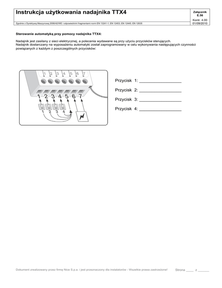 Instrukcja użytkowania nadajnika TTX4 Załącznik E.56 Kontr. 4.00 01/09/2010 Zgodnie z Dyrektywą Maszynową 2006/42/WE i odpowiednimi fragmentami norm EN 13241-1; EN 12453; EN 12445; EN 12635 Sterowanie automatyką przy pomocy nadajnika TTX4: Nadajnik jest zasilany z sieci elektrycznej, a polecenia wydawane są przy użyciu przycisków sterujących. Nadajnik dostarczany na wyposażeniu automatyki został zaprogramowany w celu wykonywania następujących czynności powiązanych z każdym z poszczególnych przycisków: Przycisk 1: _________________ Przycisk 2: _________________ Przycisk 3: _________________ Przycisk 4: _________________ Dokument zrealizowany przez firmę Nice S.p.a. i jest przeznaczony dla instalatorów - Wszelkie prawa zastrzeżone! Strona ____ z ______
