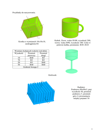 Przykłady do narysowania. Kostka o wymiarach 10x10x10, zaokrąglenia R1 Kubek. Zewn. walec R100, wysokość 200, wewn. walec R90, wysokość 180. Ucho w połowie kubka, promienie: R50 i R10 Wymiary kolejnych walców (od dołu) Wysokość Promień Promień pierwszy drugi 10 R40 R5 70 R5 R5 20 R5 R40 50 R40 R40 Grubość brzegu 2 Kieliszek Radiator. Podstawa 90x90x5, pręt wysokość 50, promień podstawy 5, promień góry 4, przesunięcie między prętami 10 1 Uzwojenie klatkowe wirnika maszyny indukcyjnej składające się ze zwierających pierścieni czołowych i 10 prętów (promień rozmieszczenia prętów R45), wysokość pierścieni 5 Uproszczony silnik. Wysokość 100. Blacha pakietu maszyny indukcyjnej. (grubość 1) 2 Wiatrak. Pierścień środkowy: promień zewnętrzny 20, promień wewnętrzny 5, wysokość 10. Łopatka: Promień całości 100, kąt rozwarcia 30, skręt łopatki 30 stopni Wentylator. Pierścień środkowy: promień zewnętrzny 20, promienie wewnętrzne 15 i 10, wysokość10. Łopatki: 20 sztuk, wymiary 30x10x2, naroŜniki zewnętrzne zaokrąglone-R2, skręt łopatki 60 stopni 3