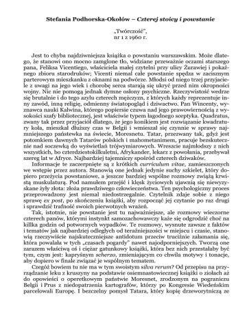 Stefania Podhorska-Okołów – Czterej stoicy i powstanie „Twórczość”, nr 1 z 1960 r. Jest to chyba najdziwniejsza książka o powstaniu warszawskim. Może dlatego, że stanowi ono mocno zamglone tło, widziane przeważnie oczami starszego pana, Feliksa Vicentiego, właściciela małej czytelni przy ulicy Żurawiej i pokaźnego zbioru starodruków; Vicenti niemal całe powstanie spędza w zacisznym parterowym mieszkanku z oknami na podwórze. Młodsi od niego trzej przyjaciele z uwagi na jego wiek i chorobę serca starają się ukryć przed nim okropności wojny. Nic nie pomogą jednak dymne osłony psychiczne. Rzeczywistość wedrze się brutalnie i do tego azylu czterech mężczyzn, z których każdy reprezentuje inny zawód, inną religię, odmienny światopogląd i dziwactwo. Pan Wincenty, wyznawca nauki Kalwina, którego popiersie czuwa nad jego prawowiernością z wysokości szafy bibliotecznej, jest właściwie typem łagodnego sceptyka. Quadratus, zwany tak przez przyjaciół dlatego, że jego konikiem jest rozwiązanie kwadratury koła, mieszkał dłuższy czas w Belgii i wmieszał się czynnie w sprawy najmniejszego państewka na świecie, Moresnetu. Tatar, przezwany tak, gdyż jest potomkiem dawnych Tatarów polskich i mahometanimem, pracuje bezskutecznie nad soczewką do wyświetlań trójwymiarowych. Wreszcie najmłodszy z nich wszystkich, bo czterdziestokilkuletni, Afrykander, lekarz z powołania, przebywał szereg lat w Afryce. Najbardziej tajemniczy spośród czterech dziwaków. Informacje te zaczerpnięte są z krótkich curriculum vitae, zamieszczonych we wstępie przez autora. Stanowią one jednak jedynie suchy szkielet, który dopiero przeżycia powstaniowe, a jeszcze bardziej wspólne rozmowy zwiążą krwistą muskulaturą. Pod namułem przejść i klęsk życiowych ujawnią się niewyzyskane żyły złota: złoża prawdziwego człowieczeństwa. Ten psychologiczny proces przeprowadzony jest niemal niedostrzegalnie. Czytelnik zdaje sobie z niego sprawę ex post, po skończeniu książki, aby rozpocząć jej czytanie po raz drugi i sprawdzić trafność swoich pierwotnych wrażeń. Tak, istotnie, nie powstanie jest tu najważniejsze, ale rozmowy wieczorne czterech panów, którymi instynkt samozachowawczy każe się odgrodzić choć na killka godzin od potwornych wypadków. Te rozmowy, wysnute zawsze z faktów i tematów jak najbardziej odległych od teraźniejszości w miejscu i czasie, stanowią rzeczywiście najskuteczniejsze antidotum przeciw truciźnie załamania się, która powalała w tych „czasach pogardy” nawet najodporniejszych. Tworzą one zarazem właściwą oś i ciężar gatunkowy książki, która bez nich przestałaby być tym, czym jest: kapryśnym scherzo, zmieniającym co chwila motywy i tonacje, aby dopiero w finale związać je wspólnym tematem. Czegóż bowiem tu nie ma w tym swoistym silva rerum? Od przepisu na przyrządzanie leku z kruszyny na podstawie osiemnastowiecznej książki o ziołach aż do opowieści o operetkowym państwie Moresnet, zrodzonym na pograniczu Belgii i Prus z niedopatrzenia kartografów, którzy po Kongresie Wiedeńskim parcelowali Europę. I bezczelny pomysł Tatara, który kopię drzeworytniczą ze znanego portretu Kopernika z konwalią rozpowszechniał na Kurpiach z podpisem: „Alabaster, patron ziemi kurpiowskiej”. Nie koniec na tym! Quadratus pisze i wydaje pracę o nieistniejącym stolarzu wiedeńskim, Jakubie Biedermeierze. Szczęściem wskutek wybuchu wojny nakład spłonął. Te nocne „rodaków rozmowy”, to panopticum niewiarogodnych przygód, dowcipnych falsyfikatów, nieszkodliwych malwersacji i osobliwych odkryć, choćby owego źródła w Wogezach, nad którym widniał napis, wykuty w piaskowcu: „O, gdybym mógł zapłakać, to łzami bym zapłakał po tobie, dobry królu!”. Napis odnosił się do Stanisława Leszczyńskiego, który źródła mineralne Plombières, znane jeszcze w starożytności, kazał odkopać i eksploatować na nowo. Erudycja i inwencja autora w dziedzinie fascynującej anegdoty i intelektualnego dowcipu znajdują tu jeszcze większe pole do popisu niż w Pamiętniku Filipka. Służą one do przyrządzania rzadkich i wymyślnych dań, których wartość ocenić mogą w pełni tylko prawdziwi smakosze. I tu nasuwa się pokrewieństwo z Anatolem France. To samo igranie z inteligencją, pomysłowość, ten sam gatunek ironicznego humoru, ten sam sceptyczny i pobłażliwy uśmiech w podtekście, ta sama bezceremonialność w traktowaniu ustalonych zasad, kanonów i przesądów, wreszcie ten sam filozoficzny spokój. Zarówno autor, jak i jego „pomyleńcy”, nigdy nie wychodzą z siebie, nie tracą równowagi, nie popadają w rozpacz ani nie unoszą się niezwykłym zapałem. To już jest specyficzność stylu Zambrzyckiego, że brakiem patosu wywołuje najsilniejsze wrażenie tam, gdzie ktoś inny nie mógłby się obejść bez grzmiących słów, z których większość okazałaby się niewypałami. Tutaj nawet wybuch bomb i „krów”, nawet przeloty najcięższych pocisków z działa kolejowego nie ogłuszają piekielnym hałasem, chociaż niosą śmierć. Mówi się o nich głosem przyciszonym, jak o sprawach natrętnych, a jednak nieuniknionych. Niezdolne są one zakłócić rozmów „pomyleńców bożych”, zwłaszcza gdy schodzą na tematy metafizyczne, w miarę jak egzystencja czterech przyjaciół staje się coraz cięższa. Niechęć do patosu rozciąga się i na momenty dramatyczne, potraktowane z epickim spokojem i powagą, które im nadają kształt monumentalny. Takim jest epizod o wyprawie pana Wincentego podziemnymi przejściami do szpitala, w którym leży poparzona przez „krowę” Lucynka, pracowniczka jego czytelni, i moment karmienia bezwładnej dziewczyny przyniesioną przez pana Wincentego czekoladą. Wstrząsający w swej realistycznej prostocie jest opis operacji wyjmowania kuli z jelit młodego powstańca, operacji, której podejmuje