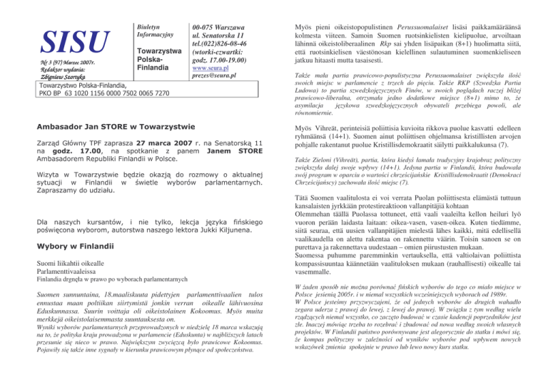 SISU Biuletyn Informacyjny Towarzystwa PolskaFinlandia Nr 3 (97) Marzec 2007 007r. Redaktor wydania: Zbigniew Szortyka 00-075 Warszawa ul. Senatorska 11 tel.(022)826-08-46 (wtorki-czwartki: godz. 17.00-19.00) Myös pieni oikeistopopulistinen Perussuomalaiset lisäsi paikkamääräänsä kolmesta viiteen. Samoin Suomen ruotsinkielisten kielipuolue, arvoiltaan lähinnä oikeistoliberaalinen Rkp sai yhden lisäpaikan (8+1) huolimatta siitä, että ruotsinkielisen väestönosan kielellinen sulautuminen suomenkieliseen jatkuu hitaasti mutta tasaisesti. www.seura.pl [email protected] Tak e mała partia prawicowo-populistyczna Perussuomalaiset zwi kszyła ilo swoich miejsc w parlamencie z trzech do pi ciu. Tak e RKP (Szwedzka Partia Ludowa) to partia szwedzkoj zycznych Finów, w swoich pogl dach raczej bli ej prawicowo-liberalna, otrzymała jedno dodatkowe miejsce (8+1) mimo to, e asymilacja j zykowa szwedzkoj zycznych obywateli przebiega powoli, ale równomiernie. Myös Vihreät, perinteisiä poliittisia kuvioita rikkova puolue kasvatti edelleen ryhmäänsä (14+1). Suomen ainut poliittisen ohjelmansa kristillisten arvojen pohjalle rakentanut puolue Kristillisdemokraatit säilytti paikkalukunsa (7). ! # ! ! " $ "% (! ! "' & $" % & ! ! ! ! ! + ! "% % $ )* , -!% % "' + Suomi liikahtii oikealle Parlamenttivaaleissa Finlandia drgn ła w prawo po wyborach parlamentarnych Suomen sunnuntaina, 18.maaliskuuta pidettyjen parlamenttivaalien tulos ennustaa maan poltiikan siirtymistä jonkin verran oikealle lähivuosina Eduskunnassa. Suurin voittaja oli oikeistolainen Kokoomus. Myös muita merkkejä oikeistolaisemmasta suuntauksesta on. Wyniki wyborów parlamentarnych przeprowadzonych w niedziel 18 marca wskazuj na to, e polityka kraju prowadzona w parlamencie (Eduskunta) w najbli szych latach przesunie si nieco w prawo. Najwi kszym zwyci zc było prawicowe Kokoomus. Pojawiły si tak e inne sygnały w kierunku prawicowym płyn ce od społecze stwa. Tak e Zieloni (Vihreät), partia, która kiedy łamała tradycyjny krajobraz polityczny zwi kszyła dalej swoje wpływy (14+1). Jedyna partia w Finlandii, która budowała swój program w oparciu o warto ci chrze cija skie Kristillisdemokraatit (Demokraci Chrze cija scy) zachowała ilo miejsc (7). Tätä Suomen vaalitulosta ei voi verrata Puolan poliittisesta elämästä tuttuun kansalaisten jyrkkään protestireaktioon vallanpitäjiä kohtaan Olemmehan täällä Puolassa tottuneet, että vaali vaaleilta kellon heiluri lyö vuoron perään laidasta laitaan: oikea-vasen, vasen-oikea. Kuten tiedämme, siitä seuraa, että uusien vallanpitäjien mielestä lähes kaikki, mitä edellisellä vaalikaudella on alettu rakentaa on rakennettu väärin. Toisin sanoen se on purettava ja rakennettava uudestaan – omien piirustusten mukaan. Suomessa puhumme paremminkin vertauksella, että valtiolaivan poliittista kompassisuuntaa käännetään vaalituloksen mukaan (rauhallisesti) oikealle tai vasemmalle. W aden sposób nie mo na porówna fi skich wyborów do tego co miało miejsce w Polsce jesieni 2005r. i w niemal wszystkich wcze niejszych wyborach od 1989r. W Polsce jeste my przyzwyczajeni, e od jednych wyborów do drugich wahadło zegara uderza z prawej do lewej, z lewej do prawej. W zwi zku z tym według wielu rz dz cych niemal wszystko, co zacz to budowa w czasie kadencji poprzedników jest złe. Inaczej mówi c trzeba to rozebra i zbudowa od nowa według swoich własnych projektów. W Finlandii pa stwo porównywane jest alegorycznie do statku i mówi si , e kompas polityczny w zale no ci od wyników wyborów pod wpływem nowych wskazówek zmienia spokojnie w prawo lub lewo nowy kurs statku. Suurin voittaja, oppositiossa ollut Kokoomus sai 200-jäseniseen Eduskuntaan 10 uutta kansanedustajaa. Sillä on nyt tasan neljännes, 50 edustajaa. Edellisten vaalien voittaja, päähallituspuolueeksi sosialidemokraattien jälkeen neljä vuotta sitten noussut keskustalainen Keskustapuolue (Kepu) menetti neljä paikkaa. Silti se säilyi vielä Eduskunnan suurimpana puolueena 51 paikallaan. Suurimman tappion kärsi sosialidemokraattinen SDP, joka menetti 8 paikkaa ja on nyt vasta Suomen kolmanneksi suurin puolue 45 kansanedustajallaan. Myös sosialidemokaateista vasemmalla oleva Vasemmistoliitto (Sojusz Lewicy) menetti kannatustaan (19-2). Najwi kszy zwyci zca - Kokoomus uzyskał w licz cym 200 członków parlamencie dodatkowych 10 miejsc i teraz posiada 50 przedstawicieli. Keskustapuolue (Kepu) Partia Centrowa, która wygrała poprzednie wybory i urosła cztery lata temu do rangi głównej partii w koalicji rz dowej, straciła cztery miejsca. Mimo to pozostała ona najliczniejsz parti w parlamencie z 51 miejscami. Najwi ksze straty (8 miejsc) poniosła socjaldemokratyczna partia SDP i jest trzeci najwi ksz parti z 45 miejscami. Tak e Vasemmistoliitto (Sojusz Lewicy) partia bardziej lewicowa ni socjaldemokraci straciła poparcie (19-2). Ylipäätään on vaikea verrata Suomen ja Puolan poliittista kenttää. Perinteemme ja nykyinen poliittinen kehitystilamme ovat kovin erilaiset. Suomen Eduskunnassa moni oikeistolaisen Kokoomuksen riveissä istuva poliitikko mahtuisi mielipiteiltään hädin tuskin PO:n ideologisten kehyksien vasemman reunan sisäpuolelle. Ne mielipiteet ja ajatukset, joita monet johtavat puolaiset poliitikot esittävät poliittisina ohjelminaan Sejmissä tai jopa televisiossa, löytäisivät ”poliittisen luonnollisen valinnan” kautta Suomessa luontevan fooruminsa pienten piirien nettichattailuryhmissä. Ogólnie trudno jest porównywa fi sk i polsk scen polityczn . Nasze tradycje i obecny stan rozwoju kultury politycznej s do ró ne. Wielu prawicowych polityków z Kokoomus ledwo znalazłoby miejsce po lewej stronie w ramach ideowych PO. A te my li i pogl dy, które wielu rz dz cych polskich polityków prezentuje jako swoje programy polityczne w Sejmie czy nawet w telewizji, znalazłoby miejsce w wyniku „politycznej selekcji naturalnej” w ród małych kr gów 