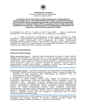 UCHWAŁA Nr 27/2012 Senatu Uniwersytetu Wrocławskiego z dnia 25 kwietnia 2012 r. w sprawie zasad rekrutacji na studia stacjonarne i niestacjonarne rozpoczynające się w roku akademickim 2013/2014 dla obywateli państw członkowskich Unii Europejskiej lub państw członkowskich Europejskiego Porozumienia o Wolnym Handlu (EFTA), posiadaczy Karty Polaka lub prawa osiedlenia na terenie RP, legitymujących się świadectwem dojrzałości lub dyplomem wydanym poza granicami Polski Na podstawie art. 169 ust. 2 ustawy z dnia 27 lipca 2005 r. - Prawo o szkolnictwie wyższym (Dz. U. Nr 164, poz. 1365, z późn. zm.) uchwala się, co następuje: § 1. Senat Uniwersytetu Wrocławskiego określa zasady rekrutacji na studia stacjonarne i niestacjonarne rozpoczynające się w roku akademickim 2013/2014 dla obywateli państw członkowskich Unii Europejskiej lub państw członkowskich Europejskiego Porozumienia o Wolnym Handlu (EFTA), posiadaczy Karty Polaka lub prawa osiedlenia na terenie RP, legitymujących się świadectwem dojrzałości lub dyplomem wydanym poza granicami Polski w poniższym brzmieniu: WYDZIAŁ BIOTECHNOLOGII Kierunek: biotechnologia Studia pierwszego stopnia - kandydaci będą kwalifikowani na studia na takich samych zasadach jak kandydaci ze „starą maturą”, to znaczy na podstawie wyniku rozmowy kwalifikacyjnej z przedmiotów: biologia i chemia ze szczególnym uwzględnieniem biologii molekularnej i chemii organicznej. Rozmowa punktowana jest w skali 0-50 punktów. Za wynik pozytywny uznaje się uzyskanie minimum 20 punktów. Podczas rozmowy kwalifikacyjnej komisja ocenia wiedzę z zagadnień, których lista jest dostępna w dziekanacie oraz na stronie internetowej Wydziału Biotechnologii: http://www.biotech.uni.wroc.pl/uploads/Polski/Rekrutacja/zagadnienia_do_rozmowy_kwalifikacyjnej.pdf. Studia drugiego stopnia - warunkiem przystąpienia do postępowania rekrutacyjnego jest: 1. posiadanie dyplomu ukończenia studiów pierwszego stopnia z tytułem licencjata (do rekrutacji nie mogą przystąpić osoby legitymujące się dyplomem mgr. inż. biotechnologii lub mgr. biotechnologii), 2. przystąpienie do rozmowy kwalifikacyjnej. O przyjęcie na studia drugiego stopnia mogą ubiegać się absolwenci studiów licencjackich: biotechnologii, biochemii, mikrobiologii, ochrony środowiska, chemii lub matematyki, fizyki i informatyki. Kandydaci składają kartę przebiegu studiów lub suplement. Kandydaci zobowiązani są wykazać się znajomością języka angielskiego na poziomie obowiązującym absolwentów studiów licencjackich Wydziału Biotechnologii (poziom B2 według Europejskiego Systemu Opisu Kształcenia Językowego). Potwierdzeniem znajomości języka angielskiego może być dyplom potwierdzający zdanie egzaminu Cambridge First Certificate. Podczas rozmowy kwalifikacyjnej komisja ocenia wiedzę z zagadnień, których lista jest dostępna w dziekanacie oraz na stronie internetowej Wydziału Biotechnologii: http://www.biotech.uni.wroc.pl/uploads/Polski/Rekrutacja/zagadnienia_do_rozmowy_kwalifikacyjnej.pdf. Rozmowa oceniana jest w skali punktowej od 0 do 50 punktów. Do zaliczenia rozmowy wymagane jest uzyskanie minimum 20 punktów. Podstawą przyjęcia będzie lista rankingowa według uzyskanych punktów w ustalonym limicie przyjęć. WYDZIAŁ CHEMII kierunek: chemia Studia pierwszego stopnia - limity przyjęć: podział proporcjonalny do liczby kandydatów z „nową”, „starą” i „zagraniczną” maturą. Przyjęcia odbywają się na podstawie listy rankingowej według średniej ze wszystkich przedmiotów zdawanych na maturze. Zasady obliczania punktów. MATURA. Skala ocen 1-6 lub 2-5: a. skala ocen 1 – 6 bardzo dobry dobry dostateczny dopuszczający b. skala ocen 2 – 5 100 pkt 80 pkt 40 pkt 20 pkt bardzo dobry 100 pkt dobry 70 pkt dostateczny 40 pkt MATURA. Skala punktowa Stosowaną skalę przeliczamy liniowo na skalę 100 punktową wg zasady: punkty na maturze punkty przeliczone 0 pkt 0 pkt maksymalna możliwa liczba punktów za przedmiot 100 pkt Studia drugiego stopnia - limity przyjęć: podział proporcjonalny do liczby kandydatów z Polski i z zagranicy. Przyjęcia odbywają się na podstawie listy rankingowej według końcowej oceny studiów pierwszego stopnia. Zasady obliczania punktów: Skala ocen 1-6 lub 2-5: a. skala ocen 1 – 6 bardzo dobry dobry dostateczny dopuszczający b. skala ocen 2 – 5 100 pkt 80 pkt 40 pkt 20 pkt bardzo dobry 100 pkt dobry 70 pkt dostateczny 40 pkt Skala punktowa Stosowaną skalę przeliczamy liniowo na skalę 100 punktową wg zasady: punkty oceny końcowej punkty przeliczone 0 pkt 0 pkt maksymalna możliwa liczba punktów przy ocenie końcowej studiów pierwszego stopnia 100 pkt Studia drugiego stopnia w języku angielskim (Master’s Program in Chemistry) - kandydat na studia powinien mieć tytuł magistra, licencjata, inżyniera lub równorzędny otrzymany na jednym z następujących kierunków: chemia, biochemia, biotechnologia, farmacja, technologia chemiczna, inżynieria chemiczna i procesowa. 2 Przyjęcie odbywa się na podstawie listy rankingowej według końcowej oceny studiów pierwszego stopnia. Zasady obliczania punktów: Skala ocen 1-6 lub 2-5: a. skala ocen 1 – 6 b. skala ocen 2 – 5 bardzo dobry 100 pkt dobry 80 pkt dostateczny 40 pkt dopuszczający 20 pkt bardzo dobry 100 pkt dobry 70 pkt dostateczny 40 pkt Skala punktowa Stosowaną skalę przeliczamy liniowo na skalę 100 punktową wg zasady: punkty oceny końcowej punkty przeliczone 0 pkt 0 pkt maksymalna możliwa liczba punktów przy ocenie końcowej studiów pierwszego stopnia 100 pkt Wymagania dotyczące znajomości języka angielskiego: certyfikat IELTS , ogólny wynik powyżej 6 pkt., certyfikat TOEFL, ogólny wynik co najmniej 510 pkt., w systemie komputerowym co najmniej 180 pkt., w systemie internetowym co najmniej 64 pkt., Certificate In Advanced English (CAE) Wymagania nie dotyczą kandydatów, dla których język angielski jest językiem o