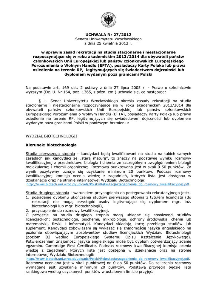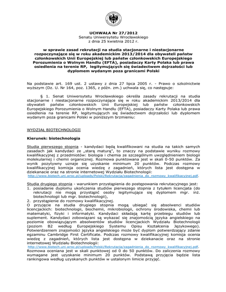 UCHWAŁA Nr 27/2012 Senatu Uniwersytetu Wrocławskiego z dnia