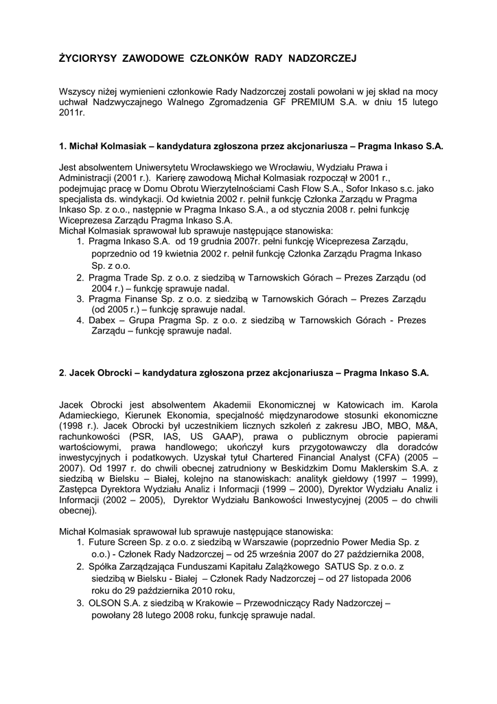 ŻYCIORYSY ZAWODOWE CZŁONKÓW RADY NADZORCZEJ Wszyscy niżej wymienieni członkowie Rady Nadzorczej zostali powołani w jej skład na mocy uchwał Nadzwyczajnego Walnego Zgromadzenia GF PREMIUM S.A. w dniu 15 lutego 2011r. 1. Michał Kolmasiak – kandydatura zgłoszona przez akcjonariusza – Pragma Inkaso S.A. Jest absolwentem Uniwersytetu Wrocławskiego we Wrocławiu, Wydziału Prawa i Administracji (2001 r.). Karierę zawodową Michał Kolmasiak rozpoczął w 2001 r., podejmując pracę w Domu Obrotu Wierzytelnościami Cash Flow S.A., Sofor Inkaso s.c. jako specjalista ds. windykacji. Od kwietnia 2002 r. pełnił funkcję Członka Zarządu w Pragma Inkaso Sp. z o.o., następnie w Pragma Inkaso S.A., a od stycznia 2008 r. pełni funkcję Wiceprezesa Zarządu Pragma Inkaso S.A. Michał Kolmasiak sprawował lub sprawuje następujące stanowiska: 1. Pragma Inkaso S.A. od 19 grudnia 2007r. pełni funkcję Wiceprezesa Zarządu, poprzednio od 19 kwietnia 2002 r. pełnił funkcję Członka Zarządu Pragma Inkaso Sp. z o.o. 2. Pragma Trade Sp. z o.o. z siedzibą w Tarnowskich Górach – Prezes Zarządu (od 2004 r.) – funkcję sprawuje nadal. 3. Pragma Finanse Sp. z o.o. z siedzibą w Tarnowskich Górach – Prezes Zarządu (od 2005 r.) – funkcję sprawuje nadal. 4. Dabex – Grupa Pragma Sp. z o.o. z siedzibą w Tarnowskich Górach - Prezes Zarządu – funkcję sprawuje nadal. 2. Jacek Obrocki – kandydatura zgłoszona przez akcjonariusza – Pragma Inkaso S.A. Jacek Obrocki jest absolwentem Akademii Ekonomicznej w Katowicach im. Karola Adamieckiego, Kierunek Ekonomia, specjalność międzynarodowe stosunki ekonomiczne (1998 r.). Jacek Obrocki był uczestnikiem licznych szkoleń z zakresu JBO, MBO, M&A, rachunkowości (PSR, IAS, US GAAP), prawa o publicznym obrocie papierami wartościowymi, prawa handlowego; ukończył kurs przygotowawczy dla doradców inwestycyjnych i podatkowych. Uzyskał tytuł Chartered Financial Analyst (CFA) (2005 – 2007). Od 1997 r. do chwili obecnej zatrudniony w Beskidzkim Domu Maklerskim S.A. z siedzibą w Bielsku – Białej, kolejno na stanowiskach: analityk giełdowy (1997 – 1999), Zastępca Dyrektora Wydziału Analiz i Informacji (1999 – 2000), Dyrektor Wydziału Analiz i Informacji (2002 – 2005), Dyrektor Wydziału Bankowości Inwestycyjnej (2005 – do chwili obecnej). Michał Kolmasiak sprawował lub sprawuje następujące stanowiska: 1. Future Screen Sp. z o.o. z siedzibą w Warszawie (poprzednio Power Media Sp. z o.o.) - Członek Rady Nadzorczej – od 25 września 2007 do 27 października 2008, 2. Spółka Zarządzająca Funduszami Kapitału Zalążkowego SATUS Sp. z o.o. z siedzibą w Bielsku - Białej – Członek Rady Nadzorczej – od 27 listopada 2006 roku do 29 października 2010 roku, 3. OLSON S.A. z siedzibą w Krakowie – Przewodniczący Rady Nadzorczej – powołany 28 lutego 2008 roku, funkcję sprawuje nadal. 4. MergersNet Sp. z o.o. – Członek Rady Nadzorczej – od 28 stycznia 2010 roku do 30 września 2010 roku 5. MergersNet Sp. z o.o. – Członek Zarządu – powołany 30 września 2010 roku, funkcję sprawuje nadal 6. MergersNet Sp. z o.o. – wspólnik od 5 marca 2009 7. Pragma Inakso S.A. – Członek Rady Nadzorczej – powołany 9 stycznia 2008 roku, funkcję sprawuje nadal 3. Rafał Witek – kandydatura zgłoszona przez akcjonariusza – Pragma Inkaso S.A. Rafał Witek ukończył liceum ogólnokształcące w Tarnowskich Górach. Sprawował lub sprawuje następujące stanowiska: 1. Inpol Papier Sp. z o.o. z siedzibą w Tarnowskich Górach – Wiceprezes Zarządu – do 3 czerwca 2004 r., 2. Inpol Papier Sp. z o.o. z siedzibą w Tarnowskich Górach - Prezes Zarządu – funkcję sprawuje nadal, 3. Profi Link Sp. z o.o. z siedzibą w Tarnowskich Górach – Prokurent - funkcję sprawuje nadal, 4. Pragma Finanse Sp. z o.o. z siedzibą w Tarnowskich Górach – Prokurent funkcję sprawuje nadal, 5. Pragam Inkaso S.A. z siedzibą w Tarnowskich Górach – Przewodniczący Rady Nadzorczej. 4. Dariusz Piasecki – kandydatura zgłoszona przez akcjonariusza mniejszościowego. Dariusz Piasecki posiada wykształcenie średnie, studiował na Wydziale Prawa i Administracji Uniwersytetu Śląskiego. W roku 1995 r. organizował na Śląsku Oddział spółki Inkasso Reform, a następnie był zatrudniony jako Dyrektor tegoż Oddziału. Od roku 1996 wspólnie z Michałem Nawrotem prowadził działalność gospodarczą pod nazwą Grupa Finansowa Premium. W roku 2001 nastąpiło przekształcenie działalności prowadzonej w ramach spółki cywilnej w spółkę jawną: Grupa Finansowa „Premium” M. Nawrot, D. Piasecki Spółka Jawna. Od grudnia 2000 r. do 15 listopada 2007r. sprawował funkcję Wiceprezesa Zarządu w spółce Grupa Finansowa Premium Sp. z o.o., przekształconej w spółkę Grupa Finansowa Premium S.A, w której od 16 listopada 2007r. sprawował funkcję Prezesa Zarządu, a od 1 kwietnia 2009r. do 1 lutego 2011r. Wiceprezesa Zarządu. Ponadto począwszy od września 2004 r. jest Wiceprezesem Zarządu w spółce Premium Development Sp. z o.o. z siedzibą w Gliwicach. Dariusz Piasecki prowadzi też od marca 2006 r. działalność gospodarczą pod firmą Przedsiębiorstwo Usługowo Handlowe Piasecki Dariusz. Przedmiotem tej działalności jest najem nieruchomości. Dariusz Piasecki sprawował funkcję Prezesa Zarządu GF PREMIUM S.A. od 16 listopada 2006 r. do 30 marca 2009r., a od dnia 1 kwietnia 2009r. do 1 lutego 2011r. sprawował funkcję Wiceprezesa tej spółki. 5. Ireneusz Rymaszewski – kandydatura zgłoszona przez akcjonariusza mniejszościowego. Ireneusz Rymaszewski posiada wykształcenie wyższe, medyczne. Jest prywatnym inwestorem, akcjonariuszem spółek publicznych i niepublicznych. Aktualnie jest członkiem Rady Nadzorczej spółki publicznej Eurotax S.A. Był członkiem Rady Nadzorczej spółki publicznej Suntech S.A. Posiada ponad 5% akcji spółki publicznej Grupa Finansowa Premium S.A. ponadto jest z