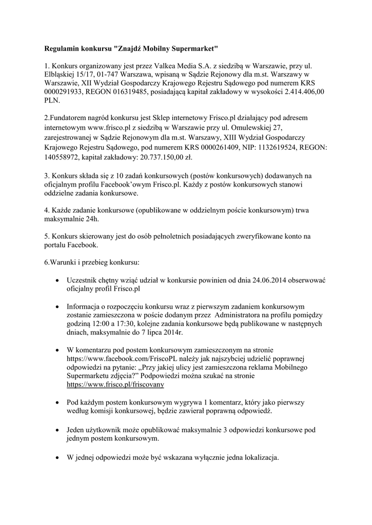 Regulamin konkursu "Znajdź Mobilny Supermarket" 1. Konkurs organizowany jest przez Valkea Media S.A. z siedzibą w Warszawie, przy ul. Elbląskiej 15/17, 01-747 Warszawa, wpisaną w Sądzie Rejonowy dla m.st. Warszawy w Warszawie, XII Wydział Gospodarczy Krajowego Rejestru Sądowego pod numerem KRS 0000291933, REGON 016319485, posiadającą kapitał zakładowy w wysokości 2.414.406,00 PLN. 2.Fundatorem nagród konkursu jest Sklep internetowy Frisco.pl działający pod adresem internetowym www.frisco.pl z siedzibą w Warszawie przy ul. Omulewskiej 27, zarejestrowanej w Sądzie Rejonowym dla m.st. Warszawy, XIII Wydział Gospodarczy Krajowego Rejestru Sądowego, pod numerem KRS 0000261409, NIP: 1132619524, REGON: 140558972, kapitał zakładowy: 20.737.150,00 zł. 3. Konkurs składa się z 10 zadań konkursowych (postów konkursowych) dodawanych na oficjalnym profilu Facebook’owym Frisco.pl. Każdy z postów konkursowych stanowi oddzielne zadania konkursowe. 4. Każde zadanie konkursowe (opublikowane w oddzielnym poście konkursowym) trwa maksymalnie 24h. 5. Konkurs skierowany jest do osób pełnoletnich posiadających zweryfikowane konto na portalu Facebook. 6.Warunki i przebieg konkursu: Uczestnik chętny wziąć udział w konkursie powinien od dnia 24.06.2014 obserwować oficjalny profil Frisco.pl Informacja o rozpoczęciu konkursu wraz z pierwszym zadaniem konkursowym zostanie zamieszczona w poście dodanym przez Administratora na profilu pomiędzy godziną 12:00 a 17:30, kolejne zadania konkursowe będą publikowane w następnych dniach, maksymalnie do 7 lipca 2014r. W komentarzu pod postem konkursowym zamieszczonym na stronie https://www.facebook.com/FriscoPL należy jak najszybciej udzielić poprawnej odpowiedzi na pytanie: „Przy jakiej ulicy jest zamieszczona reklama Mobilnego Supermarketu zdjęcia?” Podpowiedzi można szukać na stronie https://www.frisco.pl/friscovany Pod każdym postem konkursowym wygrywa 1 komentarz, który jako pierwszy według komisji konkursowej, będzie zawierał poprawną odpowiedź. Jeden użytkownik może opublikować maksymalnie 3 odpowiedzi konkursowe pod jednym postem konkursowym. W jednej odpowiedzi może być wskazana wyłącznie jedna lokalizacja. Prawidłowe odpowiedzi to takie, które będą przedstawiały lokalizację z danego zdjęcia oraz będą jedną z nazw ulicy zaprezentowanych na stronie https://www.frisco.pl/stn,friscovany Nowe posty konkursowe z nowymi zdjęciami będą dodawane przez 10 dni, od poniedziałku do piątku. 6. Udział w konkursie jest jednoznaczny z akceptacją warunków regulaminu. 7. Nagrodami w konkursie są: W jednym konkursie (poście konkursowym) można wygrać 1 voucher o wartości 100PLN do wykorzystania na zakupy w e-sklepie Frisco.pl: www.frisco.pl 8. Jedna osoba może wygrać tylko jedną nagrodę, ale może brać udział w zadaniach konkursowych (postach konkursowych) codziennie. 9. Po zakończeniu jednego zadania konkursowego, komisja konkursowa powołana przez Organizatora, w dniu następnym od momentu ogłoszenia zadania konkursowego, ogłasza jednego Zwycięzcę. 10. Wyniki zostaną każdorazowo ogłoszone przez Administratora w komentarzu pod postem konkursowym. 10. Warunkiem odebrania nagrody jest wysłanie w wiadomości prywatnej na profilu Frisco.pl na Facebooku danych osobowych Uczestnika konkursu (imię, nazwisko, adres mailowy) do dnia 10 lipca 2014 r. do godziny 12:00. 11. Warunkiem odbioru nagrody jest podanie prawidłowych danych zwycięzcy, w tym w szczególności poprawnego adresu mailowego. 12. Nagrody będą wysłane na adres mailowy podany przez Zwycięzcę, w ciągu 14 dni od dnia otrzymania danych przez Organizatorów. 14. Udział w Konkursie jest całkowicie dobrowolny. Współorganizator oświadcza, iż dane osobowe zbierane i przetwarzane przez Współorganizatora, jako administratora danych osobowych, w związku z realizacją Konkursu, będą wykorzystywane w ramach i na potrzeby przeprowadzenia Konkursu (w szczególności wyłaniania zwycięzców oraz przyznawania i wysyłania nagród), zgodnie z ustawą z dnia29 sierpnia1997r. o ochronie danych osobowych (Dz. U. z 2002 r. NR. 101,poz.926. zpóźn.zm.). Wyjątek stanowią dane osób, które wyraziły zgodę na przetwarzanie danych osobowych w celach marketingowych. 15. Uczestnik może zrzec się prawa do nagrody, jednakże nie może przenieść prawa do nagrody na osobę trzecią, bądź żądać zamiany nagrody na ekwiwalent pieniężny, ani na żadną inną formę rekompensaty. 16. Organizator w przypadku, gdy zaistnieje taki obowiązek zgodnie z art. 30 ust. 1 pkt 2 ustawy o podatku dochodowym od osób fizycznych z dnia 26 lipca 1991 roku (Dz. U. z 2000 r. Nr 14, poz. 176), przed wydaniem nagrody obliczy, pobierze i odprowadzi do właściwego Urzędu Skarbowego zryczałtowany podatek dochodowy w wysokości 10% wartości Nagrody. 17. Konkurs nie podlega przepisom Ustawy z dnia 29 lipca 1992 roku o grach i zakładach wzajemnych /Dz. U. z 2004 roku Nr 4, poz. 27 z późn. zm./ 18. Organizator zastrzega sobie prawo do zmiany Regulaminu bez podania przyczyny. 19. Informacja o zmianach zostanie opublikowana w taki sposób, w jaki był ogłaszany Regulamin. 20. Organizator nie ponosi odpowiedzialności za wpisanie przez uczestników Konkursu nieprawidłowych danych. 21. W Konkursie nie będą brały udziału zgłoszenia Uczestników, których konto w serwisie Facebook w ocenie Organizatora może być fikcyjne. 22. Organizatorowi przysługuje prawo wykluczenia ze skutkiem natychmiastowym uczestnika z udziału w Konkursie, jak również odmowy przyznania uczestnikowi nagrody w przypadku, gdy uczestnik podał nieprawdziwe lub niekompletne dane wymagane i niezbędne do przyznania nagrody, w przypadku nie spełnienia postanowień Regulaminu, a także w przypadku powzięcia przez Organizatora informacji o działaniach uczestnika sprzecznych z postanowieniami Regulaminu oraz ogólnie przyjętymi zasadami „fair play”. 23. Organizator z