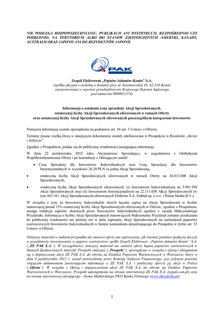 NIE POD DLEGA ROZ ZPOWSZECH HNIANIU, P PUBLIKACJII ANI DYSTR RYBUCJI, BE BEZPOŚREDN NIO CZY POŚRED DNIO, NA TERYTORIUM T UM ALBO D DO STANÓW W ZJEDNOC CZONYCH A AMERYKI, KANADY, K AUSTRA ALII ORAZ JAPONII JA ANII DO REZYDE ENTÓW JAP PONII. Zespół Elektrowni „Pątnów-Ad damów-Konin n” S.A. (spółłka akcyjna z siedzibą s w Kooninie przy ul. Kazimierskiej ej 45, 62-510 K Konin zareejestrowana w rejestrze przzedsiębiorców w Krajowego Rejestru R Sądow wego pod nuumerem 00000 021374) Informacja o ustaleniu cceny sprzedażży Akcji Sprzzedawanych, ostaatecznej liczby Akcji Sprzeedawanych oferowanych o w ramach Offerty oraz ostatecznej liczby l Akcji Sprzedawany S ych oferowan nych poszczeg gólnym kateggoriom inwesttorów Niniejszaa informacja została z sporząd dzona na podsstawie art. 54 ust. 3 Ustawy y o Ofercie. Terminy pisane wielkąą literą w niniejszym dokum mencie zostały y zdefiniowan ne w Prospekccie w Rozdziaale „Skróty i definicjee”. Zgodnie z Prospektem, podaje się do o publicznej w wiadomości naastępującą infformację: W dniuu 22 paźdzziernika 2012 roku Akkcjonariusz Sprzedający, w Współkooordynatorami Oferty i po konsultacji z O Oferującym ustalił: uzgodnnieniu C Cenę Sprzeddaży dla In nwestorów IIndywidualny ych oraz Cenę C Sprzeda daży IInstytucjonalnnych w wysok kości 26,20 PL LN za jedną Akcję A Sprzedaw waną, z Globalnymi G dla In nwestorów oostateczną liiczbę Akcji Sprzedawanyych oferowan nych w ram mach Oferty na 26.013.0 000 Akcji S Sprzedawanycch, oostateczną licczbę Akcji Sp przedawanychh oferowanycch: (i) Inwesttorom Indywiidualnym na 3.901.950 A Akcji Sprzedaawanych orazz (ii) Inwestorrom Instytucjo onalnym na 22.111.050 2 Akkcji Sprzedaw wanych (w ttym 443.101 Akcji A Sprzedaawanych oferoowanych Elek ktrim S.A, Em mbud sp. z o.o. i Polsat Media B.V.). W związzku z tym, że ż Inwestorzy y Indywiduallni złożyli łąącznie zapisy na Akcje SSprzedawane w liczbie stanowiąccej ponad 15% % ostatecznej liczby Akcji S Sprzedawanycch oferowanych w Ofercie,, zgodnie z Prrospektem, nastąpi rredukcja zapiisów złożony ych przez Inw westorów Ind dywidualnych zgodnie z zasadą Makssymalnego Przydziałłu. Informacjaa o liczbie Akccji Sprzedawaanych stanowiiących Maksymalny Przydzział zostanie przekazana p do publiccznej wiadom mości nie późźniej niż w dn dniu zapisaniaa Akcji Sprzeedawanych naa rachunkach papierów wartościoowych Inwestoorów Indywid dualnych w foormie komunik katu aktualizu ującego do Proospektu w trybie art. 52 Ustawy o Ofercie. Niniejszyy materiał w żaadnym przypa adku nie stanoowi oferty ani zaproszenia, z jak j również poodstaw podjęccia decyzji w przedm miocie inwestoowania w pap piery wartoścciowe spółki Zespół Z Elektro owni „Pątnów w-Adamów-Ko onin” S.A. („ZE PA AK S.A.”). W szczególnoścci, niniejszy m materiał nie stanowi s ofertyy kupna papieerów wartoścciowych w Stanach Z Zjednoczonychh Ameryki. Prrospekt emisyjjny („Prospek kt”), sporządzzony w związkku z ofertą i ub bieganiem się o doppuszczenie akccji ZE PAK S.A. S do obrotuu na Giełdzie Papierów Wartościowych W w Warszawiee, który w dniu 8 paaździernika 2012 2 r. został zatwierdzonyy przez Komissję Nadzoru Finansowego, F , jest jedynym m prawnie wiążącym m dokumentem m zawierająccym informacj cje o ZE PAK K S.A. i pub blicznej oferccie jej akcji w Polsce („Oferta”). W związkku z Ofertą i dopuszczenniem akcji ZE Z PAK S.A. do obrotu na Giełdzie Papierów Wartościoowych w Warrszawie, Prosp pekt udostępnniono na stron nie internetow wej ZE PAK SS.A. (zepak.com m.pl) oraz na stroniee internetowejj oferującego - Domu Makllerskiego PKO O Banku Polskkiego (www.dm dm.pkobp.pl). 1 Niniejszy materiał nie stanowi rekomendacji w rozumieniu Rozporządzenia Ministra Finansów z dnia 19 października 2005 r. w sprawie informacji stanowiących rekomendacje dotyczące instrumentów finansowych, ich emitentów lub wystawców. Niniejszy komunikat nie jest przeznaczony do rozpowszechniania, bezpośrednio albo pośrednio, na terytorium albo do Stanów Zjednoczonych Ameryki albo w innych państwach, w których publiczne rozpowszechnianie informacji zawartych w niniejszym komunikacie może podlegać ograniczeniom lub być zakazane przez prawo. Papiery wartościowe, o których mowa w niniejszym komunikacie, nie zostały i nie zostaną zarejestrowane na podstawie Amerykańskiej Ustawy o Papierach Wartościowych z 1933 r. ze zmianami (ang. U.S. Securities Act of 1933) ani przez żaden inny organ regulujący obrót papierami wartościowymi jakiegokolwiek innego stanu lub jurysdykcji w Stanach Zjednoczonych Ameryki, i nie mogą być oferowane ani zbywane na terytorium Stanów Zjednoczonych Ameryki za wyjątkiem transakcji niepodlegających obowiązkowi rejestracyjnemu przewidzianemu w Amerykańskiej Ustawie o Papierach Wartościowych lub na podstawie wyjątku od takiego obowiązku rejestracyjnego. Informacje zawarte w niniejszym komunikacie nie stanowią oferty zakupu ani zaproszenia do nabywania; nie jest również dozwolona sprzedaż papierów wartościowych wskazanych w niniejszym komunikacie w jakiejkolwiek jurysdykcji, w której taka oferta lub zaproszenie do nabywania byłyby nielegalne przed uprzednią rejestracją, zwolnieniem z takiej rejestracji lub innego rodzaju kwalifikację w świetle prawa danej jurysdykcji. Niedozwolona jest dystrybucja niniejszego komunikatu na terytorium albo do Stanów Zjednoczonych Ameryki, Kanady, Australii oraz Japonii ani do rezydentów Japonii. Informacje zawarte w załączonym komunikacie nie stanowią oferty sprzedaży ani zaproszenia do złożenia oferty nabycia papierów wartościowych w Kanadzie lub Japonii. Niniejszy komunikat jest rozpowszechniany i skierowany do osób, których miejsce zamieszkania lub siedziba znajduje się w Polsce oraz znajdujących się na terytorium Polski oraz do osób, które: (A) jeżeli znajdują się na terenie Europejskiego Ob