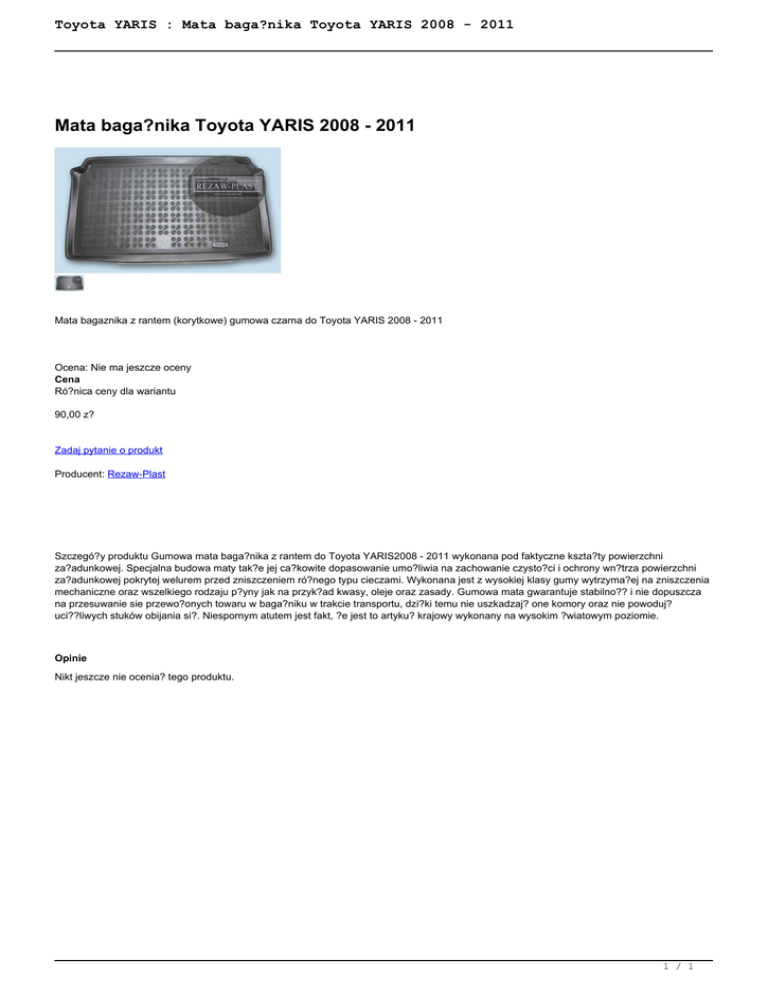Toyota YARIS : Mata baga?nika Toyota YARIS 2008 - 2011 Mata baga?nika Toyota YARIS 2008 - 2011 Mata bagaznika z rantem (korytkowe) gumowa czarna do Toyota YARIS 2008 - 2011 Ocena: Nie ma jeszcze oceny Cena Ró?nica ceny dla wariantu 90,00 z? Zadaj pytanie o produkt Producent: Rezaw-Plast Szczegó?y produktu Gumowa mata baga?nika z rantem do Toyota YARIS2008 - 2011 wykonana pod faktyczne kszta?ty powierzchni za?adunkowej. Specjalna budowa maty tak?e jej ca?kowite dopasowanie umo?liwia na zachowanie czysto?ci i ochrony wn?trza powierzchni za?adunkowej pokrytej welurem przed zniszczeniem ró?nego typu cieczami. Wykonana jest z wysokiej klasy gumy wytrzyma?ej na zniszczenia mechaniczne oraz wszelkiego rodzaju p?yny jak na przyk?ad kwasy, oleje oraz zasady. Gumowa mata gwarantuje stabilno?? i nie dopuszcza na przesuwanie sie przewo?onych towaru w baga?niku w trakcie transportu, dzi?ki temu nie uszkadzaj? one komory oraz nie powoduj? uci??liwych stuków obijania si?. Niespornym atutem jest fakt, ?e jest to artyku? krajowy wykonany na wysokim ?wiatowym poziomie. Opinie Nikt jeszcze nie ocenia? tego produktu. 1 / 1 Powered by TCPDF (www.tcpdf.org)