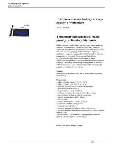 Tytuł główny nagłówka podtytuł nagłówka Termometr samochodowy + stacja pogody + woltomierz Cena: 69.99 zł Termometr samochodowy, stacja pogody, woltomierz, higrometr Fabrycznie nowy multiplikacyjny termometr samochodowy z alarmem, woltomierzem, pamięcią temperatury min/max, zegarkiem, higrometrem (wilgotnościomierzem), kalendarzem, wskaźnikami stanu pogody oraz faz księżyca. Stylowy, atrakcyjny i elegancki wygląd. Jest bardzo czytelny, pokazuje temperaturę w stopniach Celsjusza oraz Fahrenheita (przełącznik). Posiada dwa czujniki jeden na kablu zakończonym czujnikiem z mocną taśma dwustronną (długość kabla ok 1.5m) drugi wbudowany w urządzenie. W zestawie uchwyt montażowy oraz kabel zasilający 12V z wtyczką do gniazda zapalniczki. Cena za 1 szt. Montaż: Na stopce (odchylana od tyłu) lub za pomocą mocnej taśmy dwustronnej Parametry: - zakres czujnika wewn.: -10 °C ~ 60 °C - zakres czujnika zew.: -50 °C ~ 158 °C - jednostki wyświetlane: Celsjusze / Fahrenheity - skala wskazań: 0.1c lub 0.1f - długość kabla z sondą ok 150cm - zasilanie produktu : 2 x bateria A13(w komplecie) - podświetlanie zasilane z gniazda zapalniczki - wymiar wyświetlacza: 110 x 50mm. - kolor: czarny - wymiar termometru: 125 x 65 x 20mm. - kalendarz: 2000-99 /dni tygodnia - format godzin: 12 lub 24 - min/max temperatury i alarm wilgotnościomierza - wskaźnik naładowania akumulatora (wymaga podłączenia do gniazda 12V) - podświetlenie LCD niebieskie (wymaga podłączenia do gniazda 12V) lub tryb bez podświetlania Pobierz instrukcje obsługi (kliknj) 1/2 Tytuł główny nagłówka podtytuł nagłówka 2/2 Powered by TCPDF (www.tcpdf.org)
