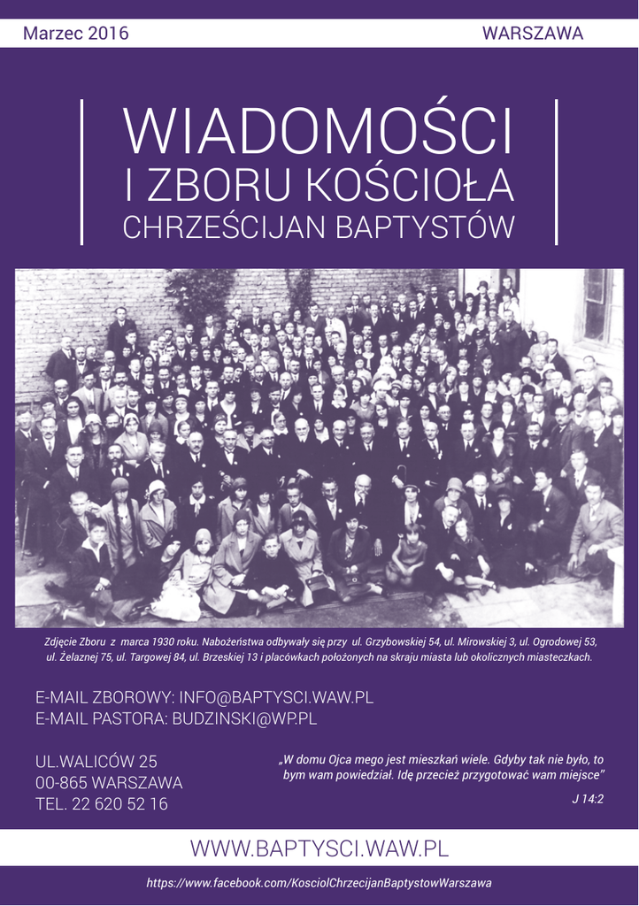 Marzec 2016 WARSZAWA WIADOMOŚCI I ZBORU KOŚCIOŁA CHRZEŚCIJAN BAPTYSTÓW Zdjęcie Zboru z marca 1930 roku. Nabożeństwa odbywały się przy ul. Grzybowskiej 54, ul. Mirowskiej 3, ul. Ogrodowej 53, ul. Żelaznej 75, ul. Targowej 84, ul. Brzeskiej 13 i placówkach położonych na skraju miasta lub okolicznych miasteczkach. E-MAIL ZBOROWY: [email protected] E-MAIL PASTORA: [email protected] UL.WALICÓW 25 00-865 WARSZAWA TEL. 22 620 52 16 „W domu Ojca mego jest mieszkań wiele. Gdyby tak nie było, to bym wam powiedział. Idę przecież przygotować wam miejsce” J 14:2 WWW.BAPTYSCI.WAW.PL https://www.facebook.com/KosciolChrzecijanBaptystowWarszawa MARZEC WT.1 ŚR. 2 CZW.3 PT.4 SOB.5 ND.6 PON.7 WT.8 ŚR. 9 CZW.10 PT.11 SOB.12 ND.13 PON.14 WT.15 ŚR. 16 CZW.17 PT.18 SOB.19 ND.20 PON.21 WT.22 ŚR. 23 CZW.24 PT.25 SOB.26 ND.27 PON.28 WT.29 ŚR. 30 CZW.31 1 2.03 [śr] godz. 18:00 14.03 [pon] godz. 11:00 Izrael w Księdze Izajasza. Wykład pastora Lecha Macieszczaka. Kobiece spotkanie świąteczne. Sala przy kuchni. 4.03 [pt] godz. 19:00 14.03 [pon] godz. 19:00 Grupa Poznawanie Pisma Św. Prowadzi br. Andrzej Dąbrowski. Spotkanie grupy Alfa. WSTĘP WOLNY. 5.03 [sob] godz. 10:00 Nabożeństwo. Rozważanie br. Samuel Skrzypkowski. Spotkanie dla mężczyzn, sala przy kuchni. WSTĘP WOLNY. 6.03 [nd] godz. 9:00 Grupa biblijna poznawanie biblii, prowadzi br. Adam Wojnarowski. 6.03 [nd] godz. 10:00 Nabożeństwo połączone z Wieczerzą Pańską. Kazanie pastor Marek Budziński, refleksja br. Krzysztof Motyka. 16.03 [śr] godz. 18:00 17.03 [czw] godz. 11:00 Postna Herbatka seniora. Sala przy kuchni. WSTĘP WOLNY. 18.03 [pt] godz. 19:00 grupa Poznawanie Pisma Św. Prowadzi br. Andrzej Dąbrowski. 19.03 [sob] godz. 11:00 7.03 [pon] godz. 11:00 Zapraszamy serdecznie na koncert w wykonaniu uczniów Szkoły Muzycznej. Wstęp wolny. Spotkanie Kobiece sala przy kuchni w budynku administracyjnym. 20.03 [nd] godz. 10:00 Spotkanie grupy Alfa. WSTĘP WOLNY. Nabożeństwo. Kazanie prezbiter Konstanty Wiazowski - Cykl 10 kazań na temat modlitw St. Testamentu. 09.03 [śr] godz. 18:00 23.03 [śr] godz. 18:00 7.03 [pon] godz. 19:00 Nabożeństwo. Rozważanie z Listu do Koryntian. Kazanie pastor Marek Budziński. 11.03 [pt] godz. 19:00 Grupa Poznawanie Pisma Św. Prowadzi br. Andrzej Dąbrowski. 13.03 [nd] godz. 9:00 Nabożeństwo Wielkotygodniowe. Kazanie pastor Marek Budziński. 24.03 [czw] godz. 18:00 Wielki czwartek. Rozważanie br. Krzysztof Motyka. 25.03 [pt] godz. 18:00 Grupa biblijna poznawanie biblii, prowadzi br. Adam Wojnarowski. Nabożeństwo Wielkopiątkowe połączone z Wieczerzą Pańską. Kazanie pastor Marek Budziński. 13.03 [nd] godz. 10:00 27.03 [nd] godz. 10:00 Nabożeństwo. Kazanie pastor Marek Budziński. Nabożeństwo Wielkanocne. Kazanie pastor Marek Budziński. NABOŻEŃSTWA Niedzielne: godz. 10:00 Środowe: godz. 18:00 W JĘZYKU WIETNAMSKIM: niedziela w godz. 16:00, br. Hung tel. 889 931 735. W JĘZYKU CHIŃSKIM: niedziela, godz. 14:00 Wólka Kosowska, br. Tian tel. 604 898 277. MŁODZIEŻOWE W JĘZYKU CHIŃSKIM: niedziela, godz. 10:00 ul Waliców 25, budynek administracyjny, pierwsze piętro, br. Hanping tel. 603 821 812. W JĘZYKU ROSYJSKIM: niedziela, godz. 13:30, ul. Waliców 25 www.baptist.pl, br. Sasza tel. 886 320 979. BARYCZ: FUNDACJA POMOCY CHRZEŚCIJAŃSKIEJ, PLACÓWKA 1 ZKCHB W NOWYM DWORZE MAZOWIECKIM: Barycz 82, 26-200 Końskie www.baptysci.waw.pl/barycz tel. 41 372 63 30 ul. Sukienna 52 (przy Placu Solnym) 05-100 Nowy Dwór Mazowiecki email: [email protected] email punktu szkółki niedzielnej: [email protected] Nabożeństwa: niedziela, godz. 10:00 czwartek, godz. 18:00 GRODZISK MAZOWIECKI: ul. 1 Maja 12, www.chlebzycia.pl Nabożeństwa: niedziela, godz. 11:00 piątek godz.18:00 Nr konta (PEKAO S.A.): 05 1 240 6348 1111 001 0 3504 01 93 strona internetowa: http://kosciol-jezusa.pl profil na facebooku: https://www.facebook.com/koscioljezusa Nabożeństwa: niedziela godz. 11:00 grupa domowa – czwartek o godz. 17:30 Nr konta (PKO Bank Polski): 10 1020 1185 0000 4902 0236 0147 II ZBÓR W WARSZAWIE: ul. Lęborska 8/10 lok. 25, Niedziela: 11:00 URODZINY W TYM MIESIĄCU OBCHODZĄ 03.03. Zofia Szajner 04.03. Krzysztof Rafalski 05.03. Elżbieta Skworodko 05.03. Cezary Szulich 07.03. Elżbieta Luśnia 07.03. Małgorzata Kisza 09.03. Danuta Longić 09.03. Ryszard Wilkosz-Końskie 13.03. Damarysa Mackiewicz 14.03. Łukasz Szcześniak 14.03. Daniel Niedziałkowski 24.03. Pastor Marek Budziński 14.03. Agnieszka Nadia Trojnara 25.03. Dorota Gaca 15.03. Katarzyna Zielińska 27.03. Sławomir Dobaczewski 16.03. Karolina Trusiewicz 27.03. Justyna Sawa 17.03. Aldona Sawicka 29.03. Ryszarda Longić 17.03. Natalia Selmowicz 30.03. Elżbieta Luśnia 18.03. Piotr Dąbrowski 31.03. Ewa Kuryłowicz 19.03. J. Galińska-Zienkiewicz 31.03. Zarysława Więcek 21.03. Maciej Andrzejewski 31.03. Marek Witkowski 23.03. Alicja Leibrandt 2 INTERNETOWA MODLITWA MAM WITAJCIE MOJE DROGIE, Co poniedziałek rozsyłamy przypomnienie aby łączyć się w modlitwie o nasze dzieci. Dołącz do grupy modlących sie Mam. Nasz Pan jest godzien, by oddawać Mu chwałę cały rok :) Kobiety – módlmy się o nasze dzieci, aby też zechciały oddawać chwałę Panu Jezusowi swoim życiem. „Godzien jesteś Panie i Boże nasz, przyjąć chwałę i moc, ponieważ Ty stworzyłeś wszystko i z woli Twojej zostało stworzone, i zaistniało” Obj. 4,11 Dołącz do nas. Informacje w sekretariacie Zboru WSPOMNIENIE O STANISŁAWIE 20 lutego 2016r. w wieku 55 lat odszedł zbyt szybko i nagle do swojego Zbawiciela nasz drogi brat, Stanisław Wójcik. Przyjaciel nasz, który pełnił funkcje gospodarza Zboru. Tata dwóch dorosłych córek. Przyjaciel swojej żony, seniorów i całkiem młodych ludzi. Nasz Stanisław był gospodarzem, kierowcą, zaopatrzeniowcem, kucharzem, wędkarzem, doradcą, i misjonarzem, wśród osób przychodzących w środku tygodnia do Zboru. Zawsze pomocny i poświęcający swój prywatny czas nie 