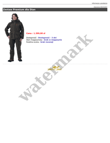 Informacje o produkcie Utworzono 06-03-2017 Zestaw Premium dla Dian Cena : 1.399,00 zł w at er m ar k Dostępność : Dostępność - 3 dni Stan magazynowy : brak w magazynie Średnia ocena : brak recenzji er m ar k Fińska jakość dla polskich Dian. Zestaw myśliwski specjalnie zaprojektowany dla at polujących kobiet kochających las. w Zestaw premium Lady to idealne połączenie zaawansowanej techniki materiałów, membrany i wykonania z dopasowaniem zestawu do kobiecej figury. Elegancja i funkcjonalność dla Dian. Oddychający i wodoodporny Membrana Air-TeX2 zapewnia efektywne odprowadzanie wilgoci od ciała, pełną wodoodporność niezależną od warunków zewnętrznych. Dzięki temu ubranie jest lekkie i suche nawet podczas intensywnych opadów. Dla Dian Zestaw został stworzony z myślą o kobietach i dla nich zaprojektowany. Nowy krój, specjalna podszewka, wysoki stan spodni, zabezpieczone otwory wentylacyjne to wszystko zapewnia Dianie wysoki komfort polowania niezależnie od warunków pogodowych. Funkcjonalny Zestaw posiada aż 15 kieszeni, których funkcjonalność została przetestowana na etapie projektowania. Kieszenie są wodoodporne i świetnie mieszczą wszystkie myśliwskie akcesoria. Dopasowany Odpinany i dopasowany kaptur, szeroka regulacja w pasie, taśmy do dopasowania spodni i łatwego wsunięcia ich w buty, dodatkowe ściągacze to wszystko sprawia, że zestaw nigdy nie krępuje ruchów, jest wygodny i umożliwia polowania w każdych warunkach pogodowych. Informacje o produkcie ● ● ● ● ● ● ● ● ● ● Krój zestawu oraz detale zaprojektowane specjalnie dla Kobiet. Odpinany i regulowany kaptur z membraną Air-Tex2 Odpinana siatka na insekty. Zapinane na suwak i siatkowane otwory wentylacyjne pod ramionami. Regulowany obwód pasa. Guziki do szelek w pasie. Kieszenie cargo po obu stronach spodni. Miękki i cichy materiał nie szeleszczący przy poruszaniu się. Wzmocnienia na szwach. i w newralgicznych miejscach zestawu chroniące przed przetarciem i uszkodzeniem. Teflonowany materiał zabezpieczony przed nasiąkaniem i zwiększaniem wagi. Zestaw składa się z: - kamizelki ANNIE er m ar k - kurtki i spodni z membraną Air-Tex2 - bielizny termalnej Jahti Jakt z systemem SCENTECH Idealnie odprowadzające wilgoć od Twojego ciała. Rewolucyjny system SCENTECH zatrzymuje zapach ludzkiego ciała, który może być wykryty przez zwierzęta. Ta technologia została opracowana przy udziale ekspertów pracujących nad cząsteczkami srebra. - ciepłego kobiecego swetra - polarowych rękawiczek i czapki dla Dian at - bandany dla Dian w Doskonała wodoodporność Nowa membrana AIR-TEX2 osiągnęła także dobre rezultaty w testach na wodoodporność. Laminowana membrana AIR-TEX2 została wyprodukowana z najwyższej klasy materiałów w najlepszej i najnowocześniejszej technologii. To powoduje jej dobrą wytrzymałość nawet po długotrwałym używaniu. W teście na przepuszczalność powietrza przeprowadzonym przez Politechnikę w Tampere AIR-TEX2 otrzymał wyśmienity wynik >11 000 g/m3 24h. Membrana AIR-TEX2 1. membrana zewnętrzna 2. membrana AIR-TEX2 3. tkanina wewnętrzna 4. wilgoć 5. wysoka temperatura 6. woda Rozmiary od S do XXL w at er m ar k Przy zamówieniu proszę podać: wzrost, wagę, obwód klatki piersiowej oraz pasa.