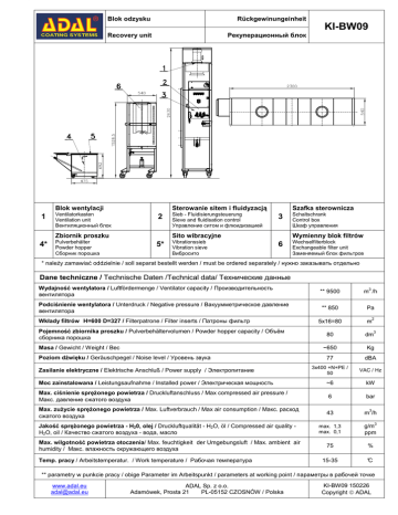 ; Blok odzysku Rückgewinungeinheit Recovery unit Рекуперационный блок KI-BW09 1 Blok wentylacji Sterowanie sitem i fluidyzacją Ventilatorkasten Ventilation unit Вентиляционный блок Sieb - Fluidisierungsteuerung Sieve and fluidisation control Управление ситом и флюидизацией 2 Zbiornik proszku 4* Pulverbehälter Powder hopper Сборник порошка Szafka sterownicza 3 Sito wibracyjne 5* Vibrationssieb Vibration sieve Вибросито Schaltschrank Control box Шкаф управления Wymienny blok filtrów 6 Wechselfilterblock Exchangeable filter unit Заменяемый блок фильтров * należy zamawiać oddzielnie / soll separat bestellt werden / must be ordered separately / нужно заказывать отдельно Dane techniczne / Technische Daten /Technical data/ Технические данные Wydajność wentylatora / Luftfördermenge / Ventilator capacity / Производительность вентилятора ** 9500 m /h Podciśnienie wentylatora / Unterdruck / Negative pressure / Вакуумметрическое давление вентилятора ** 850 Pa 5x16=80 m 80 dm ~650 Kg Wkłady filtrów H=600 D=327 / Filterpatrone / Filter inserts / Патроны фильтр Pojemność zbiornika proszku / Pulverbehältervolumen / Powder hopper capacity / Объём сборника порошка Masa / Gewicht / Weight / Вес Poziom dźwięku / Geräuschpegel / Noise level / Уровень звука 3 2 3 77 dBA 3x400 +N+PE / 50 VAC / Hz Moc zainstalowana / Leistungsaufnahme / Installed power / Электрическая мощность ~6 kW Max. ciśnienie sprężonego powietrza / Druckluftanschluss / Max compressed air pressure / Макс. давление сжатого воздуха 6 bar Max. zużycie sprężonego powietrza / Max. Luftverbrauch / Max air consumption / Макс. расход сжатого воздуха 43 m /h Jakość sprężonego powietrza - H20, olej / Druckluftqualität - H2O, öl / Compressed air quality H2O, oil / Качество сжатого воздуха - вода, масло max. 1,3 max. 0,1 g/m ppm 75 % 15-35 °C Zasilanie elektryczne / Elektrische Anschluß / Power supply / Электропитание Max. wilgotność powietrza otoczenia/ Max. feuchtigkeit der Umgebungsluft / Max. ambient air humidity / Макс. влажность окружающего воздуха Temp. pracy / Arbeitstemperatur. / Work temperature / Pабочая температура 3 3 ** parametry w punkcie pracy / obige Parameter im Arbeitspunkt / parameters at working point / параметры в рабочей точке www.adal.eu [email protected] ADAL Sp. z o.o. Adamówek, Prosta 21 PL-05152 CZOSNÓW / Polska KI-BW09 150226 Copyright ADAL