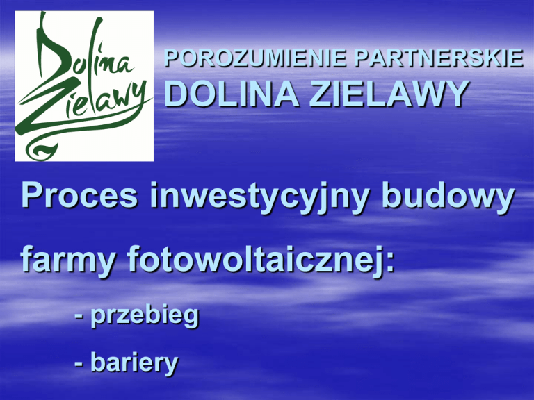 POROZUMIENIE PARTNERSKIE DOLINA ZIELAWY Proces inwestycyjny budowy farmy fotowoltaicznej: - przebieg - bariery Partnerskie porozumienie „DOLINA ZIELAWY” Gmina Partnerskie porozumienie „DOLINA ZIELAWY” Gminy wchodzące w skład partnerstwa: Wisznice, Jabłoń, Sosnówka, Rossosz i Podedwórze Partnerskie porozumienie „DOLINA ZIELAWY” pomysł współpracy i partnerstwa na rzecz wzajemnego rozwoju – sierpień 2007 r. 15 kwietnia 2008 r. – pierwsze partnerskie porozumienie i pierwsze wspólne przedsięwzięcie: – – – – – Gmina Gmina Gmina Gmina Gmina Jabłoń Podedwórze Rossosz Sosnówka Wisznice Partnerskie porozumienie „DOLINA ZIELAWY” PROJEKTY INFRASTRUKTURALNE RPO WL na lata 2007 – 2013: „Budowa dróg gminnych wchodzących w skład obszaru turystycznego „Dolina Zielawy” – I etap”- 9 dróg, 12 km; „Budowa dróg gminnych wchodzących w skład obszaru turystycznego „Dolina Zielawy” – II etap”- 11 dróg, 9 km; „Czysta energia w Dolinie Zielawy” – I etap- 925 instalacji kolektorów słonecznych- instytucje publiczne i mieszkańcy; „Czysta energia w Dolinie Zielawy”- II etap- 427 instalacji; Poprawa bezpieczeństwa ekologicznego w „Dolinie Zielawy”kupno 2 lekkich i 4 średnich wozów pożarniczych i wyposażenie 5 jednostek Straży Pożarnych Partnerskie porozumienie „DOLINA ZIELAWY” PROJEKTY SPOŁECZNE- PO KL; RPO WL: DOBRY KLIMAT DLA RODZINY- „Kompleksowy system edukacji przedszkolnej w gminach północnej Lubelszczyzny”- utworzenie 16 punktów edukacji przedszkolnej na terenie Doliny Zielawy „Promocja kultury i turystyki na terenie obszaru turystycznego „Dolina Zielawy”- promocja marki Dolina Zielawy „„DOLINA ZIELAWY” ponadlokalną marką na gospodarczej mapie Lubelszczyzny”- promocja terenów inwestycyjnych i przedsiębiorczości Partnerskie porozumienie „DOLINA ZIELAWY” INNE DZIAŁANIA: Partnerstwo pozwala na minimalizowanie kosztów realizowanych działań poprzez podział obowiązków i odpowiedzialności: – Organizowanie przetargów na dostarczanie energii do budynków użyteczności publicznej w gminach - oszczędność 20 %; – Organizowanie wspólnych przetargów na kredyty - atrakcyjniejszy partner dla banków; Sprawnie funkcjonujące partnerstwo to: – większa siła przebicia; – więcej możliwości w pozyskiwaniu zewnętrznych środków finansowych w myśl zasady „RAZEM MOŻEMY WIĘCEJ”; Energia Dolina Zielawy Sp. z o.o.: Budowa farmy fotowoltaicznej o mocy 1,4 MW: Beneficjent- Energia Dolina Zielawy Spółka z o.o. Wniosek w RPO WL rozpatrzony pozytywnie Oś Priorytetowa VI Środowisko i czysta energia Działanie 6.2 Energia przyjazna środowisku Lokalizacja inwestycji - Gmina Rossosz Mamy przyznaną rezerwację mocy 1, 4 MW w PGE Dystrybucja S.A. Inne plany spółki - inwestowanie w mikro instalacje fotowoltaiczne (do 40kW) dachowe i naziemne (budynki użyteczności publicznej i nieruchomości gmin) Energia Dolina Zielawy Sp. z o.o.: Beneficjent: Spółka z o.o. Energia Dolina Zielawy Udziały w spółce: – – – – – Gmina Gmina Gmina Gmina Gmina ppp Jabłoń Podedwórze Rossosz Sosnówka Wisznice - 25,6 % 10,9 % 14,7 % 16,6% 32,2 % Energia Dolina Zielawy Sp. z o.o.: PROCES INWESTYCYJNY: Krok 1: Znalezienie odpowiedniej nieruchomości (działki) największy problem – Plan zagospodarowania przestrzennego (bariera) – Działanie w oparciu o Decyzję o warunkach zabudowy – Mapa do celów projektowych (bariera - brak map zasadniczych) – Odpowiedni areał działki – Dostępność linii średniego napięcia o wymaganych parametrach ( bariery: mała gęstość linii SN, słabe własności techniczne linii) Czas: 2 tygodnie do 1,5 miesiąca Energia Dolina Zielawy Sp. z o.o.: PROCES INWESTYCYJNY: Krok 2: Procedura środowiskowa - ewentualne uzyskanie decyzji środowiskowej: – formalność – Do 1 ha powierzchni zabudowy paneli oraz innej zabudowy działki (łącznie) tj. do ok. 1,5 MW- nie wymagana jest decyzja środowiskowa- następuje umorzenie postępowania; – Powyżej 1 ha zabudowy – jest to według interpretacji GDOŚ jako obszar przemysłowy i konieczne jest uzyskanie decyzji środowiskowej, przy czym Lubelski RDOŚ nie wymaga raportu środowiskowego; inne mogą wymagać) Czas : 1-1,5 miesiąca Energia Dolina Zielawy Sp. z o.o.: PROCES INWESTYCYJNY: Krok 3: Procedura uzyskania warunków przyłączenia do sieci elektroenergetycznej średniego napięcia w PGE - najistotniejszy krok – Poniesienie kosztów wykonania map (bariera) – Poniesienie kosztów wykonania koncepcji wstępnej wykonania farmy fotowoltaicznej (bariera) – spełnienie warunków stawianych przez PGE Czas: 1,5 miesiąca do 6 miesięcy Energia Dolina Zielawy Sp. z o.o.: PROCES INWESTYCYJNY: Krok 4: Wykonanie projektu technicznego elektrycznego i budowlanego- wykonawczego wraz z projektami technicznymi przyłączy: – Małe doświadczenie projektantów (bariera) – Ustrzeganie się „szarlatanów” przedstawiających „idealne rozwiązania” – Dobra współpraca projektanta z PGE Dystrybucja S.A.- doświadczenie w kontaktach z PGE Czas: 1 miesiąc do 3 miesięcy Energia Dolina Zielawy Sp. z o.o.: PROCES INWESTYCYJNY: Krok 5: Uzyskanie pozwolenia na budowę Dobra współpraca projektanta ze Starostwem Powiatowym Czas: 2 tygodnie do 1 miesiąca Energia Dolina Zielawy Sp. z o.o.: PROCES INWESTYCYJNY: Krok 6: Uzyskanie koncesji z URE na prowadzenie działalności polegającej na wytwarzaniu energii elektrycznej. Złożenie wniosku o wydanie koncesji wraz z kompletem załączników Ewentualnie uzyskanie promesy przed otrzymaniem koncesji Czas 1-2 miesiące Energia Dolina Zielawy Sp. z o.o.: PROCES INWESTYCYJNY: Krok 7: Realizacja inwestycji Procedura zamówienia publicznego Środki na sfinansowanie inwestycji Warunki atmosferyczne Czas: 4 miesiące do 10 miesięcy Energia Dolina Zielawy Sp. z o.o.: PROCES INWESTYCYJNY: BARIERY ROZWOJOWE: 1. PGE - Brak właściwych linii energetycznych 