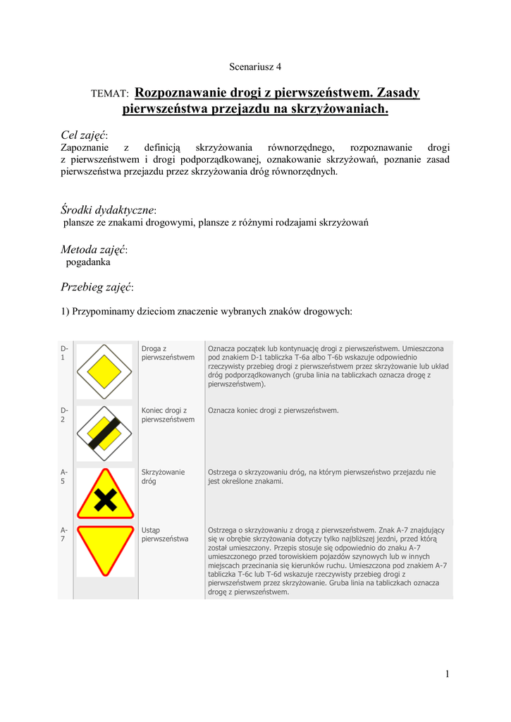 Scenariusz 4 Rozpoznawanie drogi z pierwszeństwem. Zasady pierwszeństwa przejazdu na skrzyżowaniach. TEMAT: Cel zajęć: Zapoznanie z definicją skrzyżowania równorzędnego, rozpoznawanie drogi z pierwszeństwem i drogi podporządkowanej, oznakowanie skrzyżowań, poznanie zasad pierwszeństwa przejazdu przez skrzyżowania dróg równorzędnych. Środki dydaktyczne: plansze ze znakami drogowymi, plansze z różnymi rodzajami skrzyżowań Metoda zajęć: pogadanka Przebieg zajęć: 1) Przypominamy dzieciom znaczenie wybranych znaków drogowych: D1 Droga z pierwszeństwem Oznacza początek lub kontynuację drogi z pierwszeństwem. Umieszczona pod znakiem D-1 tabliczka T-6a albo T-6b wskazuje odpowiednio rzeczywisty przebieg drogi z pierwszeństwem przez skrzyżowanie lub układ dróg podporządkowanych (gruba linia na tabliczkach oznacza drogę z pierwszeństwem). D2 Koniec drogi z pierwszeństwem Oznacza koniec drogi z pierwszeństwem. A5 Skrzyżowanie dróg Ostrzega o skrzyzowaniu dróg, na którym pierwszeństwo przejazdu nie jest określone znakami. A7 Ustąp pierwszeństwa Ostrzega o skrzyżowaniu z drogą z pierwszeństwem. Znak A-7 znajdujący się w obrębie skrzyżowania dotyczy tylko najbliższej jezdni, przed którą został umieszczony. Przepis stosuje się odpowiednio do znaku A-7 umieszczonego przed torowiskiem pojazdów szynowych lub w innych miejscach przecinania się kierunków ruchu. Umieszczona pod znakiem A-7 tabliczka T-6c lub T-6d wskazuje rzeczywisty przebieg drogi z pierwszeństwem przez skrzyżowanie. Gruba linia na tabliczkach oznacza drogę z pierwszeństwem. 1 B20 STOP Oznacza: 1. zakaz wjazdu na skrzyżowanie bez zatrzymania się przed drogą z pierwszeństwem, 2. obowiązek ustąpienia pierwszeństwa kierującym poruszającym się tą drogą. Zatrzymanie powinno nastąpić w wyznaczonym w tym celu miejscu, a w razie jego braku - w takim miejscu, w którym kierujący może upewnić się, że nie utrudni ruchu na drodze z pierwszeństwem. (Źródło: http://www.v10.pl/prawo/znaki,drogowe,111.html) 2) Pokazujemy przykładowe skrzyżowania. Zadaniem uczniów jest wskazanie drogi z pierwszeństwem przejazdu i drogi podporządkowanej. Źródło: Autor M. Skoczylas – wykonanie rysunku. 3) Omawiamy znaczenie tabliczek uzupełniających. T6a Tabliczka wskazująca rzeczywisty przebieg drogi z pierwszeństwem przez skrzyżowanie (umieszczana na drodze z pierwszeństwem) T6c Tabliczka wskazująca rzeczywisty przebieg drogi z pierwszeństwem przez skrzyżowanie (umieszczana na drodze podporządkowanej) (Źródło: http://www.v10.pl/prawo/znaki,drogowe,111.html) 4) Następnie wyjaśniamy, co to jest skrzyżowanie dróg równorzędnych. Skrzyżowanie równorzędne to takie, na którym obie drogi mają taką samą rangę. Nie ma drogi z pierwszeństwem i nie ma drogi podporządkowanej. 2 5) Omawiamy zasady pierwszeństwa przejazdu na skrzyżowaniu dróg równorzędnych: Ustępujemy pierwszeństwa pojazdom nadjeżdżającym z prawej strony Pierwszeństwo maja pojazdy szynowe, bez względu na to, z której strony nadjeżdżają Pierwszeństwo mają pojazdy uprzywilejowane Pojazdy skręcające w lewo muszą ustąpić pierwszeństwa pojazdom jadącym z przeciwka na wprost lub skręcającym w prawo 6) Analiza sytuacji na skrzyżowaniach równorzędnych: A C B A B A C B C B A A B A B Źródło: Autor – M. Skoczylas – wykonanie rysunków. 3