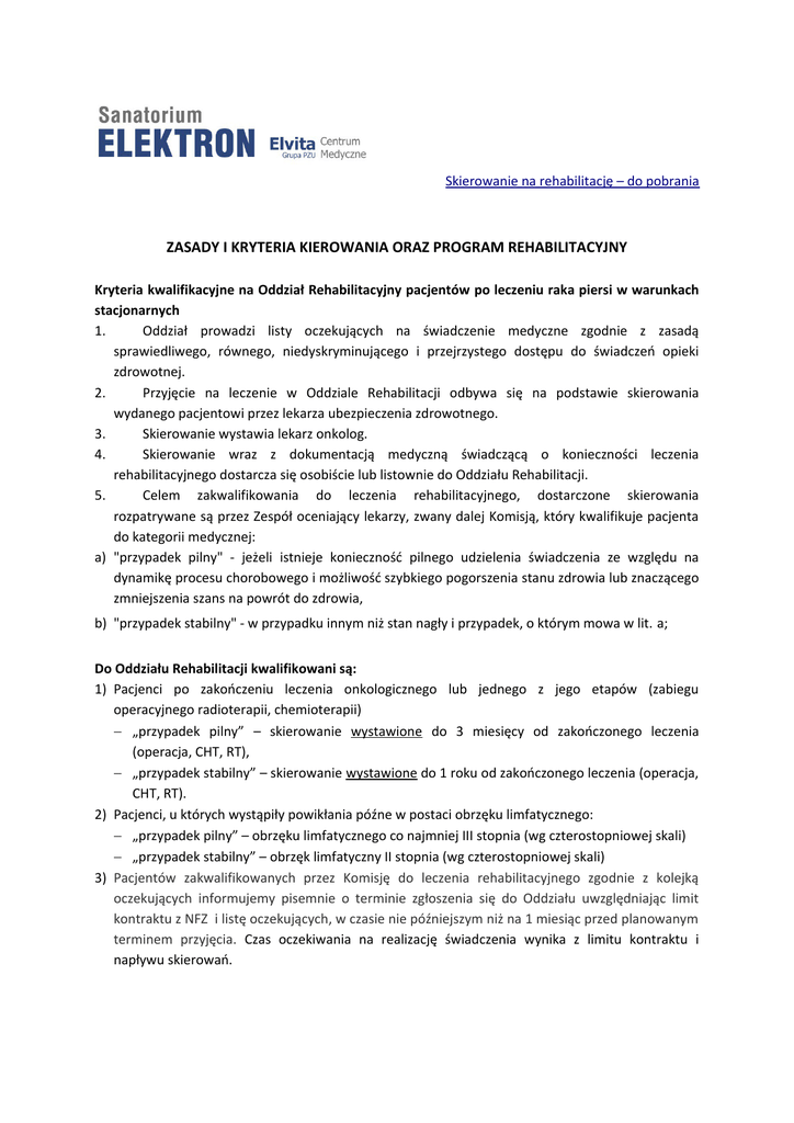 Skierowanie na rehabilitację – do pobrania ZASADY I KRYTERIA KIEROWANIA ORAZ PROGRAM REHABILITACYJNY Kryteria kwalifikacyjne na Oddział Rehabilitacyjny pacjentów po leczeniu raka piersi w warunkach stacjonarnych 1. Oddział prowadzi listy oczekujących na świadczenie medyczne zgodnie z zasadą sprawiedliwego, równego, niedyskryminującego i przejrzystego dostępu do świadczeń opieki zdrowotnej. 2. Przyjęcie na leczenie w Oddziale Rehabilitacji odbywa się na podstawie skierowania wydanego pacjentowi przez lekarza ubezpieczenia zdrowotnego. 3. Skierowanie wystawia lekarz onkolog. 4. Skierowanie wraz z dokumentacją medyczną świadczącą o konieczności leczenia rehabilitacyjnego dostarcza się osobiście lub listownie do Oddziału Rehabilitacji. 5. Celem zakwalifikowania do leczenia rehabilitacyjnego, dostarczone skierowania rozpatrywane są przez Zespół oceniający lekarzy, zwany dalej Komisją, który kwalifikuje pacjenta do kategorii medycznej: a) "przypadek pilny" - jeżeli istnieje konieczność pilnego udzielenia świadczenia ze względu na dynamikę procesu chorobowego i możliwość szybkiego pogorszenia stanu zdrowia lub znaczącego zmniejszenia szans na powrót do zdrowia, b) "przypadek stabilny" - w przypadku innym niż stan nagły i przypadek, o którym mowa w lit. a; Do Oddziału Rehabilitacji kwalifikowani są: 1) Pacjenci po zakończeniu leczenia onkologicznego lub jednego z jego etapów (zabiegu operacyjnego radioterapii, chemioterapii) „przypadek pilny” – skierowanie wystawione do 3 miesięcy od zakończonego leczenia (operacja, CHT, RT), „przypadek stabilny” – skierowanie wystawione do 1 roku od zakończonego leczenia (operacja, CHT, RT). 2) Pacjenci, u których wystąpiły powikłania późne w postaci obrzęku limfatycznego: „przypadek pilny” – obrzęku limfatycznego co najmniej III stopnia (wg czterostopniowej skali) „przypadek stabilny” – obrzęk limfatyczny II stopnia (wg czterostopniowej skali) 3) Pacjentów zakwalifikowanych przez Komisję do leczenia rehabilitacyjnego zgodnie z kolejką oczekujących informujemy pisemnie o terminie zgłoszenia się do Oddziału uwzględniając limit kontraktu z NFZ i listę oczekujących, w czasie nie późniejszym niż na 1 miesiąc przed planowanym terminem przyjęcia. Czas oczekiwania na realizację świadczenia wynika z limitu kontraktu i napływu skierowań. 4) Pacjentów zakwalifikowanych przez Komisję do leczenia rehabilitacyjnego jako „przypadek pilny” informujemy pisemnie o wyznaczonym terminie przyjęcia zgodnie z posiadanymi wolnymi miejscami. 5) W razie wystąpienia okoliczności, których nie można było przewidzieć w chwili ustalania terminu udzielenia świadczenia opieki zdrowotnej, a które uniemożliwiają zachowanie terminu wynikającego z listy oczekujących, Oddział informuje Pacjenta w każdy dostępny sposób o zmianie terminu wynikającego ze zmiany kolejności udzielenia świadczenia i jej przyczynie. Przepis ten dotyczy również przypadku zmiany terminu udzielenia świadczenia opieki zdrowotnej na wcześniejszy. 6) Ostatecznej kwalifikacji do leczenia rehabilitacyjnego w warunkach stacjonarnych dokonuje lekarz Oddziału Rehabilitacji po zbadaniu pacjenta. Odmowa przyjęcia na leczenie stacjonarne Odmowa przyjęcia pacjenta do Oddziału Rehabilitacji może wynikać z: a) braku wskazań lekarskich do leczenia rehabilitacyjnego w warunkach stacjonarnych, b) braku możliwości prowadzenia leczenia rehabilitacyjnego w szczególnie ciężkich przypadkach, których nie można było stwierdzić na podstawie skierowania i dołączonej do niego dokumentacji medycznej. Zasady przyjęć pacjentów na leczenie stacjonarne 1. Przyjęcia pacjentów do leczenia rehabilitacyjnego prowadzone są wg kolejności zgłoszeń daty wpływu skierowania. 2. W przypadku zmiany stanu zdrowia pacjenta, wynikającej z przedstawionej aktualnej dokumentacji medycznej, wskazującego na potrzebę wcześniejszego niż według kolejności terminu leczenia, koryguje się odpowiednio ten termin. O zasadności korekty terminu decyduje Komisja na podstawie kryteriów medycznych. Zmiany terminu realizacji leczenia stacjonarnego 1. W przypadku istotnych wypadków losowych dokonuje się przesunięcia terminu przyjęcia na najbliższy termin umożliwiający realizację świadczenia. 2. Za istotne przypadki losowe uznaje się niezależne od pacjenta, bezpośrednio go dotyczące zdarzenia zewnętrzne, które uniemożliwiają lub znacząco utrudniają stawienie się na leczenie we wskazanym terminie. W szczególności są to: a) śmierć najbliższej osoby, b) stan nagły - tj. stan polegający na nagłym lub przewidywanym w krótkim czasie pojawieniu się objawów pogarszania zdrowia, którego bezpośrednim następstwem może być poważne uszkodzenie funkcji organizmu lub uszkodzenie ciała lub utrata życia, wymagający podjęcia natychmiastowych medycznych czynności ratunkowych i leczenia, c) inne ostre schorzenie, które z powodów zdrowotnych, epidemiologicznych, lub innych medycznych mogłoby spowodować zagrożenie zdrowia innych pacjentów. 3. W przypadku zaistnienia stanu nagłego i po zakończeniu leczenia, pacjent przesyła zaświadczenie o stanie zdrowia z adnotacją odpowiedniego specjalisty o zdolności do kompleksowego leczenia rehabilitacyjnego. W razie konieczności przesuwa się termin przyjęcia do czasu zaistnienia możliwości udzielanie świadczeń rehabilitacyjnych. 4. W przypadku zaistnienia ostrego schorzenia potwierdzonego zaświadczeniem lekarskim (np. infekcja) dokonuje się przesunięcia terminu przyjęcia na najbliższy termin umożliwiający realizację świadczenia. Skreślenie z listy oczekujących W Oddziale Rehabilitacji dokonuje się skreślenia z listy oczekujących w przypadku: a) powiadomienia przez Pacjenta wpisanego na listę oczekujących o rezygnacji, b) zaprzestania wykonywania świadczenia danego rodzaju przez Świadczeniodawcę, c) nie zgłoszenia się Pacje