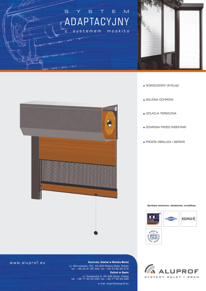 S Y S T E M ADAPTACYJNY z systemem moskito NOWOCZESNY WYGLĄD SOLIDNA OCHRONA IZOLACJA TERMICZNA OCHRONA PRZED INSEKTAMI PROSTA OBSŁUGA I SERWIS Aprobaty techniczne, świadectwa, certyfikaty w w w. a l u p r o f. e u Centrala; Zakład w Bielsku-Białej ul. Warszawska 153, 43-300 Bielsko-Biała, Polska tel. +48 33 81 95 300, fax +48 33 82 20 512 Zakład w Opolu ul. Gosławicka 3, 45-446 Opole, Polska tel. +48 77 40 00 000, fax +48 77 40 00 006 e-mail: [email protected] SYSTEM ADAPTACYJNY Przeznaczony do stosowania w istniejących budynkach. Roleta zwijana jest do skrzynki aluminiowej przytwierdzonej na ścianie lub w ościeży. Skrzynka jest wówczas elementem dekorac y j n y m i jest dopasowana do wyglądu budynku. W systemie tym oferujemy do wyboru dwa rodzaje skrzynek: skrzynki w systemie SK 45 i okrągłe w systemie Owal, Spełniającej oczekiwania klientów o wysokich wymaganiach architektonicznych, poszukujących nowoczesnych i funkcjonalnych rozwiązań. Dzięki przemyślanej konstrukcji i odpowiednio dobranym surowcom rolety systemu Aluprof stanowią skuteczną ochronę przed nieproszonymi gośćmi. Ponadto doskonale izolują termicznie; pozwalają obniżyć w znacznym stopniu koszty ogrzewania zimą, latem natomiast, gdy świeci słońce a na zewnątrz panuje wysoka temperatura, zapewnią Państwa domu zyskuje w ten sposób dodatkową ochronę, jednocześnie przyjemny chłód oraz półmrok dający odpoczynek zmęczonym oczom. Wychodząc naprzeciw indywidualnym potrzebom klientów Aluprof opracowuje różnorodne konstrukcje systemów rolet. Chcąc rozszerzyć funkcjonalność rolet, wprowadziliśmy do swojej oferty rolety zintegrowane z siatką przeciwinsektową. Proponowany system, obok już wcześniej znanych z a l e t , p o s i a d a k o l e j n y w a l o r, a mianowicie, zabezpieczenie wnętrza pomieszczenia przed owadami. Obydwa elementy tego systemu, czyli pancerz rolety i siatka przeciwinsektowa, mogą być używane niezależnie. Wnętrze podnosząc komfort i bezpieczeństwo. Do budowy rolet oferujemy szeroką gamę profili, a także wiele optymalnych rozwiązań sterowania roletami. W naszej ofercie znajdą Państwo: napędy ręczne, mechanizmy półautomatyczne oraz napędy elektryczne wraz z s y s t e m a m i s t e r u j ą c y m i , które pozwolą komfortowo obsługiwać rolety. Bogata kolorystyka rolety ożywi każdą elewację budynku czyniąc ją bardziej atrakcyjną. Wyprodukowane na zautomatyzowanych liniach produkcyjnych profile cechuje duża precyzja wykonania. Wszystkie elementy pokrywane są farbami o bardzo dobrej t r w a ł o ś c i ko l o r ó w i zwiększonej wytrzymałości na ścieranie. Odporne na niszczące oddziaływanie czynników atmosferycznych powłoki sprawiają, że po wielu latach użytkowania Państwa rolety zachowają w pełni swoje walory estetyczne i użytkowe. Perfekcyjna obróbka materiału i regularne badania jakości dają pewność, że wyrób końcowy będzie w stanie sprostać najwyższym wymaganiom, a zakupione przez Państwa rolety będą dobrą inwestycją na wiele lat.