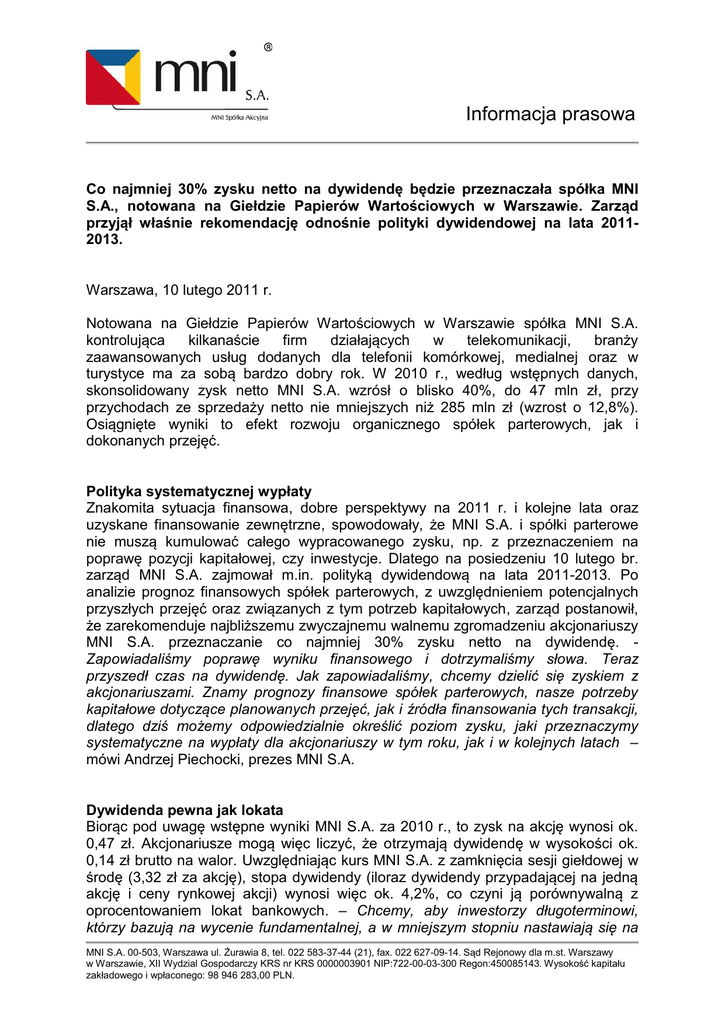 Informacja prasowa Co najmniej 30% zysku netto na dywidendę będzie przeznaczała spółka MNI S.A., notowana na Giełdzie Papierów Wartościowych w Warszawie. Zarząd przyjął właśnie rekomendację odnośnie polityki dywidendowej na lata 20112013. Warszawa, 10 lutego 2011 r. Notowana na Giełdzie Papierów Wartościowych w Warszawie spółka MNI S.A. kontrolująca kilkanaście firm działających w telekomunikacji, branży zaawansowanych usług dodanych dla telefonii komórkowej, medialnej oraz w turystyce ma za sobą bardzo dobry rok. W 2010 r., według wstępnych danych, skonsolidowany zysk netto MNI S.A. wzrósł o blisko 40%, do 47 mln zł, przy przychodach ze sprzedaży netto nie mniejszych niż 285 mln zł (wzrost o 12,8%). Osiągnięte wyniki to efekt rozwoju organicznego spółek parterowych, jak i dokonanych przejęć. Polityka systematycznej wypłaty Znakomita sytuacja finansowa, dobre perspektywy na 2011 r. i kolejne lata oraz uzyskane finansowanie zewnętrzne, spowodowały, że MNI S.A. i spółki parterowe nie muszą kumulować całego wypracowanego zysku, np. z przeznaczeniem na poprawę pozycji kapitałowej, czy inwestycje. Dlatego na posiedzeniu 10 lutego br. zarząd MNI S.A. zajmował m.in. polityką dywidendową na lata 2011-2013. Po analizie prognoz finansowych spółek parterowych, z uwzględnieniem potencjalnych przyszłych przejęć oraz związanych z tym potrzeb kapitałowych, zarząd postanowił, że zarekomenduje najbliższemu zwyczajnemu walnemu zgromadzeniu akcjonariuszy MNI S.A. przeznaczanie co najmniej 30% zysku netto na dywidendę. Zapowiadaliśmy poprawę wyniku finansowego i dotrzymaliśmy słowa. Teraz przyszedł czas na dywidendę. Jak zapowiadaliśmy, chcemy dzielić się zyskiem z akcjonariuszami. Znamy prognozy finansowe spółek parterowych, nasze potrzeby kapitałowe dotyczące planowanych przejęć, jak i źródła finansowania tych transakcji, dlatego dziś możemy odpowiedzialnie określić poziom zysku, jaki przeznaczymy systematyczne na wypłaty dla akcjonariuszy w tym roku, jak i w kolejnych latach – mówi Andrzej Piechocki, prezes MNI S.A. Dywidenda pewna jak lokata Biorąc pod uwagę wstępne wyniki MNI S.A. za 2010 r., to zysk na akcję wynosi ok. 0,47 zł. Akcjonariusze mogą więc liczyć, że otrzymają dywidendę w wysokości ok. 0,14 zł brutto na walor. Uwzględniając kurs MNI S.A. z zamknięcia sesji giełdowej w środę (3,32 zł za akcję), stopa dywidendy (iloraz dywidendy przypadającej na jedną akcję i ceny rynkowej akcji) wynosi więc ok. 4,2%, co czyni ją porównywalną z oprocentowaniem lokat bankowych. – Chcemy, aby inwestorzy długoterminowi, którzy bazują na wycenie fundamentalnej, a w mniejszym stopniu nastawiają się na MNI S.A. 00-503, Warszawa ul. Żurawia 8, tel. 022 583-37-44 (21), fax. 022 627-09-14. Sąd Rejonowy dla m.st. Warszawy w Warszawie, XII Wydzial Gospodarczy KRS nr KRS 0000003901 NIP:722-00-03-300 Regon:450085143. Wysokość kapitału zakładowego i wpłaconego: 98 946 283,00 PLN. Informacja prasowa krótkoterminowe zyski kapitałowe, mogli być pewni, że co roku otrzymają od spółki określoną kwotę pieniędzy na akcję wypłacaną z wypracowanego przez fundusz zysku. Warto pamiętać, że m.in. w wyniku akwizycji aktywa funduszu systematycznie rosną, a tym samym majątek akcjonariuszy MNI S.A. Gdyby np. doszło do dezinwestycji, będą oni mogli liczyć na specjalną wypłatę – wyjaśnia prezes Andrzej Piechocki. O niedawna Giełda Papierów Wartościowych w Warszawie postanowiła wyróżniać spółki, które systematycznie dzielą się zyskiem z akcjonariuszami. Od początku stycznia GPW publikuje indeks WIGdiv, w skład którego wchodzi 30 spółek z indeksów WIG20, mWIG40 i sWIG80, które regularnie wypłacały dywidendę (co najmniej trzy razy w ostatnich pięciu latach). Kontakt dla mediów: Tomasz Brzeziński Koordynator ds. Public Relations tel. kom. 607 036-429 [email protected] MNI S.A. 00-503, Warszawa ul. Żurawia 8, tel. 022 583-37-44 (21), fax. 022 627-09-14. Sąd Rejonowy dla m.st. Warszawy w Warszawie, XII Wydzial Gospodarczy KRS nr KRS 0000003901 NIP:722-00-03-300 Regon:450085143. Wysokość kapitału zakładowego i wpłaconego: 98 946 283,00 PLN.