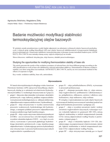 NAFTA-GAZ, ROK LXXI, Nr 5 / 2015 Agnieszka Skibińska, Magdalena Żółty Instytut Nafty i Gazu – Państwowy Instytut Badawczy Badanie możliwości modyfikacji stabilności termooksydacyjnej olejów bazowych W artykule zostały przedstawione wyniki badań odporności na utlenianie wybranych olejów bazowych pochodzących z różnych grup według klasyfikacji API oraz olejów bazowych inhibitowanych wytypowanymi dodatkami przeciwutleniającymi. Oznaczenie stabilności termooksydacyjnej wykonano trzema metodami badawczymi: ASTM D2272, PN-C-04176 oraz metodą własną oceny wpływu ekspozycji na światło. Słowa kluczowe: stabilność oksydacyjna, oleje bazowe, dodatki przeciwutleniające. Studying the opportunities for modifying thermooxidation stability of base oils The article presents the results of the oxidation resistance of selected base oils from different groups according to the API classification as well as base oils inhibited by selected antioxidant additives. Determination of thermo-oxidative stability was done using three test methods: ASTM D2272, BS-C-04176, and by an own assessment method of the effects of exposure to light. Key words: oxidation stability, base oils, antioxidants. Wprowadzenie W latach dziewięćdziesiątych ubiegłego wieku American Petroleum Institute (API) opracował klasyfikację olejów bazowych, dzieląc je w zależności od właściwości fizykochemicznych (tablica 1) i technologii otrzymywania na 5 grup [1]: • grupa I – klasyczne oleje mineralne wytwarzane z destylatów próżniowych z ropy naftowej, poddane rozpuszczalnikowym procesom technologicznym, tj.: rafinacji selektywnej, odparafinowaniu rozpuszczalnikowemu i hydrorafinacji, • grupa II – oleje otrzymywane w wyniku zastosowania procesów wodorowych, hydrokrakingu lub hydrotreatingu, a następnie poddane procesowi odparafinowania (rozpuszczalnikowego bądź katalitycznego), • grupa III – oleje często nazywane niekonwencjonalnymi (UCBOs – unconventional base oils) lub olejami o bardzo wysokim wskaźniku lepkości (VHVI – very high viscosity index); wytwarzane w procesach głębokiego hydrokrakingu destylatów próżniowych z ropy, katalitycznego odparafinowania i wykańczającego procesu hydrorafinacji oraz otrzymywane w procesie hydroizomeryzacji stałych węglowodorów n-parafinowych, • grupa IV – oleje polialfaolefinowe (PAO), wytwarzane w procesach polimeryzacji, • grupa V – obejmuje pozostałe oleje, tj.: oleje estrowe, oleje węglowodorowe: polibutenowe i alkiloaromatyczne, poliglikolowe, silikonowe, arylowe i alkilowe estry fosforanowe, oleje naftenowe, oleje roślinne. W związku z wprowadzeniem na rynek olejów bazowych wytwarzanych bardziej nowoczesnymi metodami podział ten uległ nieformalnemu poszerzeniu o podgrupy [2]: • grupa I+ – oleje o wysokiej zawartości siarki i niskiej zawartości węglowodorów nasyconych, wykazujące wyższy wskaźnik lepkości (w granicach 100÷105), niższą lepkość strukturalną w niskich temperaturach (metoda CCS) i niższą odparowalność według Noacka w porównaniu z olejami grupy I, • grupa II+ – oleje o wskaźniku lepkości 110÷120, charakteryzujące się poprawionymi właściwościami, takimi jak: lepkość strukturalna w niskich temperaturach (metoda CCS) i odparowalność według Noacka, • grupa III+ – oleje otrzymywane metodą gas to liquid 327 NAFTA-GAZ (proces GTL – hydroizomeryzacja syntetycznych parafin uzyskanych metodą Fischera–Tropscha), charakteryzujące się wskaźnikiem lepkości powyżej 140. Podczas eksploatacji oleju, z powodu wpływu takich czynników jak podwyższona temperatura i ciśnienie, kontakt z tlenem atmosferycznym i katalityczne oddziaływanie metali, zachodzą w oleju niepożądane zmiany, tj. zmiana lepkości, temperatury płynięcia i zapłonu, wydzielanie osadów, szlamów, zwiększenie liczby kwasowej – co powoduje jego korozyjne oddziaływanie na smarowane elementy. Stabilność termooksydacyjna, czyli odporność oleju na utlenianie, to zdolność oleju do zachowania składu, a więc chemicznej struktury składników, a tym samym właściwości fizykochemicznych i eksploatacyjnych. Na stabilność gotowych olejów smarowych ma wpływ nie tylko skład chemiczny olejów bazowych, ale również zawartość dodatków uszlachetniających, a zwłaszcza inhibitorów utlenienia. Ocena stabilności termooksydacyjnej olejów pozwala scharakteryzować trwałość oleju smarowego w czasie pracy, w określonych warunkach temperaturowych, przy dostępie powietrza. Służy do oceny przydatności eksploatacyjnej oleju smarowego oraz do przewidywania okresów jego wymiany w urządzeniu. Do oceny degradacji termooksydacyjnej olejów bazowych/smarowych stosowane są metody, które umożliwiają analizę zmian budowy chemicznej związków wchodzących w skład oleju przed i po procesie utleniania. Powszechnie wykorzystywane metody to: analiza spektralna w zakresie podczerwieni (IR) i ultrafioletu (UV), chromatografia żelowa, chromatografia gazowa połączona ze spektroskopią masową (GC/MS) oraz metody magnetycznego rezonansu jądrowego (NMR 13C). Przy ich pomocy można zidentyfikować różnorodne produkty utleniania węglowodorów. Zbyt mała stabilność termooksydacyjna olejów bazowych wymaga wprowadzania dodatków hamujących procesy utleniania. Efektywność działania inhibitorów utlenienia zależy zarówno od chemicznego charakteru oleju bazowego, jak i warunków jego eksploatacji, rodzaju inhibitorów i mechanizmów ich działania. Antyutleniacze to rozpuszczalne w oleju organiczne i metaloorganiczne związki następujących typów [3, 11]: związki siarkowe, związki siarki i azotu, związki fosforowe, związki siarki i fosforu, aminy aromatyczne, związki fenolowe z zawadą przestrzenną, organiczne związki miedzi, związki boru i inne związki metaloorganiczne. Fuchs [12] opracował koncepcję „optymalnej aromatyczności” olejów bazowych, synergicznego wpływu