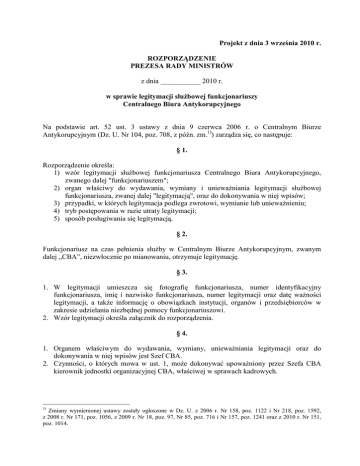 Projekt z dnia 3 września 2010 r. ROZPORZĄDZENIE PREZESA RADY MINISTRÓW z dnia ___________ 2010 r. w sprawie legitymacji słuŜbowej funkcjonariuszy Centralnego Biura Antykorupcyjnego Na podstawie art. 52 ust. 3 ustawy z dnia 9 czerwca 2006 r. o Centralnym Biurze Antykorupcyjnym (Dz. U. Nr 104, poz. 708, z późn. zm.1)) zarządza się, co następuje: § 1. Rozporządzenie określa: 1) wzór legitymacji słuŜbowej funkcjonariusza Centralnego Biura Antykorupcyjnego, zwanego dalej "funkcjonariuszem"; 2) organ właściwy do wydawania, wymiany i uniewaŜniania legitymacji słuŜbowej funkcjonariusza, zwanej dalej "legitymacją", oraz do dokonywania w niej wpisów; 3) przypadki, w których legitymacja podlega zwrotowi, wymianie lub uniewaŜnieniu; 4) tryb postępowania w razie utraty legitymacji; 5) sposób posługiwania się legitymacją. § 2. Funkcjonariusz na czas pełnienia słuŜby w Centralnym Biurze Antykorupcyjnym, zwanym dalej „CBA”, niezwłocznie po mianowaniu, otrzymuje legitymację. § 3. 1. W legitymacji umieszcza się fotografię funkcjonariusza, numer identyfikacyjny funkcjonariusza, imię i nazwisko funkcjonariusza, numer legitymacji oraz datę waŜności legitymacji, a takŜe informację o obowiązkach instytucji, organów i przedsiębiorców w zakresie udzielania niezbędnej pomocy funkcjonariuszowi. 2. Wzór legitymacji określa załącznik do rozporządzenia. § 4. 1. Organem właściwym do wydawania, wymiany, uniewaŜniania legitymacji oraz do dokonywania w niej wpisów jest Szef CBA. 2. Czynności, o których mowa w ust. 1, moŜe dokonywać upowaŜniony przez Szefa CBA kierownik jednostki organizacyjnej CBA, właściwej w sprawach kadrowych. 1) Zmiany wymienionej ustawy zostały ogłoszone w Dz. U. z 2006 r. Nr 158, poz. 1122 i Nr 218, poz. 1592, z 2008 r. Nr 171, poz. 1056, z 2009 r. Nr 18, poz. 97, Nr 85, poz. 716 i Nr 157, poz. 1241 oraz z 2010 r. Nr 151, poz. 1014. § 5. 1. Legitymacja jest dokumentem potwierdzającym uprawnienia funkcjonariusza wynikające z przepisów ustawy z dnia 9 czerwca 2006 r. o Centralnym Biurze Antykorupcyjnym. 2. Funkcjonariusz moŜe posługiwać się legitymacją tylko podczas wykonywania czynności słuŜbowych. 3. Funkcjonariusz okazujący legitymację jest obowiązany czynić to w sposób umoŜliwiający odczytanie umieszczonych w niej danych. § 6. Funkcjonariusz jest obowiązany dbać o naleŜyty stan legitymacji, a w szczególności chronić ją przed utratą lub zniszczeniem. § 7. Legitymacja podlega wymianie w przypadku: 1) zmiany danych w niej zawartych; 2) uszkodzenia lub zniszczenia; 3) upływu okresu jej waŜności. § 8. 1. Legitymacja podlega zwrotowi w przypadku: 1) zawieszenia w czynnościach słuŜbowych; 2) udzielenia urlopu bezpłatnego albo urlopu wychowawczego; 3) przeniesienia do dyspozycji Szefa CBA; 4) zwolnienia ze słuŜby; 5) wygaśnięcia stosunku słuŜbowego. 2. Legitymację zwraca się kierownikowi jednostki organizacyjnej, o której mowa w § 4 ust. 2. § 9. Po ustaniu przyczyn, o których mowa w § 8 ust. 1 pkt 1-3, funkcjonariuszowi wydaje się zwróconą przez niego legitymację, chyba Ŝe zachodzą przypadki, o których mowa w § 8 ust. 1 pkt 4-5. § 10. 1. 2. Legitymacja podlega uniewaŜnieniu w przypadku jej utraty, wymiany oraz zwolnienia ze słuŜby lub wygaśnięcia stosunku słuŜbowego. UniewaŜnienie legitymacji polega na: 1) wydaniu przez Szefa CBA postanowienia, w którym określa się w szczególności numer uniewaŜnianej legitymacji, oraz 2) odcięciu jej rogów, o ile Szef CBA jest w jej posiadaniu. § 11. 1. W razie utraty legitymacji funkcjonariusz jest obowiązany niezwłocznie złoŜyć Szefowi CBA notatkę słuŜbową, podając w niej w szczególności datę i okoliczności utraty legitymacji. 2. W przypadku odzyskania utraconej legitymacji funkcjonariusz jest obowiązany niezwłocznie zwrócić ją kierownikowi jednostki organizacyjnej, o której mowa w § 4 ust. 2 i złoŜyć Szefowi CBA notatkę słuŜbową, zawierającą w szczególności datę i okoliczności jej odzyskania. § 12. 1. Zabrania się: 1) odstępowania legitymacji innej osobie; 2) wywoŜenia legitymacji za granicę, chyba Ŝe funkcjonariusz uzyska na to zgodę kierownika jednostki organizacyjnej CBA, w której pełni słuŜbę; 3) przesyłania legitymacji pocztą, z wyjątkiem przewoźnika, o którym mowa w przepisach w sprawie trybu i sposobu przyjmowania, przewoŜenia, wydawania i ochrony materiałów zawierających informacje niejawne. 2. Funkcjonariusz, który nie uzyskał zgody na wywiezienie legitymacji za granicę, jest obowiązany na czas wyjazdu zdeponować ją w jednostce organizacyjnej CBA, w której pełni słuŜbę. § 13. Legitymacje wydane funkcjonariuszom przed dniem wejścia w Ŝycie rozporządzenia podlegają zwrotowi kierownikowi jednostki organizacyjnej, o którym mowa w § 4 ust. 2, oraz uniewaŜnieniu w sposób określony w § 10 ust. 2. § 14. Traci moc rozporządzenie Prezesa Rady Ministrów z dnia 28 lipca 2006 r. w sprawie wzoru legitymacji słuŜbowej funkcjonariuszy Centralnego Biura Antykorupcyjnego (Dz. U. Nr 138, poz. 968 oraz z 2007 r. Nr 195, poz. 1406). § 15. Rozporządzenie wchodzi w Ŝycie z dniem 1 stycznia 2011 r. Załącznik do rozporządzenia Prezesa Rady Ministrów z dnia_________2010 r. (poz. __) WZÓR LEGITYMACJI FUNKCJONARIUSZA CENTRALNEGO BIURA ANTYKORUPCYJNEGO I. OKŁADKA LEGITYMACJI Okładka wykonana ze skóry w kolorze czarnym. Na okładce umieszczony znak Centralnego Biura Antykorupcyjnego. WZÓR II. CZEŚĆ WEWNĘTRZNA LEGITYMACJI AWERS 1. Tło giloszowe z elementami mikrotekstu; 2. Elementy graficzne aktywne w świetle UV; 3. Znak CBA; 4. Miejsce na fotografię funkcjonariusza CBA, która będzie nanoszona w procesie personalizacji; 5. Napisy drukowane róŜnym kolorem i krojem czcionki: a) CENTRALNE BIURO ANTYKORUPCYJNE, b) NR IDENTYFIKACYJNY, c) IMIĘ , d) NAZWISKO, e) sześciocyfrowy numer legitymacji poprzedzony napisem CBA, f) NR LEGITYMACJI, g) PODP