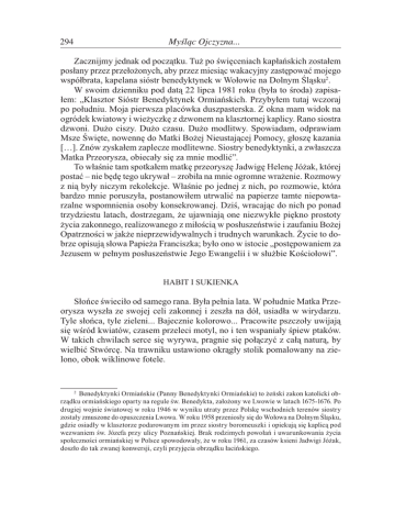 294 Myśląc Ojczyzna... Zacznijmy jednak od początku. Tuż po święceniach kapłańskich zostałem posłany przez przełożonych, aby przez miesiąc wakacyjny zastępować mojego współbrata, kapelana sióstr benedyktynek w Wołowie na Dolnym Śląsku2. W swoim dzienniku pod datą 22 lipca 1981 roku (była to środa) zapisałem: „Klasztor Sióstr Benedyktynek Ormiańskich. Przybyłem tutaj wczoraj po południu. Moja pierwsza placówka duszpasterska. Z okna mam widok na ogródek kwiatowy i wieżyczkę z dzwonem na klasztornej kaplicy. Rano siostra dzwoni. Dużo ciszy. Dużo czasu. Dużo modlitwy. Spowiadam, odprawiam Msze Święte, nowennę do Matki Bożej Nieustającej Pomocy, głoszę kazania […]. Znów zyskałem zaplecze modlitewne. Siostry benedyktynki, a zwłaszcza Matka Przeorysza, obiecały się za mnie modlić”. To właśnie tam spotkałem matkę przeoryszę Jadwigę Helenę Jóżak, której postać – nie będę tego ukrywał – zrobiła na mnie ogromne wrażenie. Rozmowy z nią były niczym rekolekcje. Właśnie po jednej z nich, po rozmowie, która bardzo mnie poruszyła, postanowiłem utrwalić na papierze tamte niepowtarzalne wspomnienia osoby konsekrowanej. Dziś, wracając do nich po ponad trzydziestu latach, dostrzegam, że ujawniają one niezwykłe piękno prostoty życia zakonnego, realizowanego z miłością w posłuszeństwie i zaufaniu Bożej Opatrzności w jakże nieprzewidywalnych i trudnych warunkach. Życie to dobrze opisują słowa Papieża Franciszka; było ono w istocie „postępowaniem za Jezusem w pełnym posłuszeństwie Jego Ewangelii i w służbie Kościołowi”. HABIT I SUKIENKA Słońce świeciło od samego rana. Była pełnia lata. W południe Matka Przeorysza wyszła ze swojej celi zakonnej i zeszła na dół, usiadła w wirydarzu. Tyle słońca, tyle zieleni... Bajecznie kolorowo... Pracowite pszczoły uwijają się wśród kwiatów, czasem przeleci motyl, no i ten wspaniały śpiew ptaków. W takich chwilach serce się wyrywa, pragnie się połączyć z całą naturą, by wielbić Stwórcę. Na trawniku ustawiono okrągły stolik pomalowany na zielono, obok wiklinowe fotele. 2 Benedyktynki Ormiańskie (Panny Benedyktynki Ormiańskie) to żeński zakon katolicki obrządku ormiańskiego oparty na regule św. Benedykta, założony we Lwowie w latach 1675-1676. Po drugiej wojnie światowej w roku 1946 w wyniku utraty przez Polskę wschodnich terenów siostry zostały zmuszone do opuszczenia Lwowa. W roku 1958 przeniosły się do Wołowa na Dolnym Śląsku, gdzie osiadły w klasztorze podarowanym im przez siostry boromeuszki i opiekują się kaplicą pod wezwaniem św. Józefa przy ulicy Poznańskiej. Brak rodzimych powołań i uwarunkowania życia społeczności ormiańskiej w Polsce spowodowały, że w roku 1961, za czasów ksieni Jadwigi Jóżak, doszło do tak zwanej konwersji, czyli przyjęcia obrządku łacińskiego. Myśląc Ojczyzna... 295 – Tak, to były dla nas bardzo trudne chwile – wyznała zamyślona. – Kazali nam się wynosić ze Lwowa. To był prawdziwy szok dla wszystkich sióstr. Żyły przecież w klauzurze. Modliły się, pracowały. Wierzyły w swoje posłannictwo i w to, że w klasztornej ciszy swoim odejściem od świata w ważny sposób służą Kościołowi, a przede wszystkim nikomu nie wadzą. Nie mogły zrozumieć decyzji, która zapadła bez ich woli. No cóż, trzeba było jednak stawić czoła trudnościom. Nie załamywać się, chociaż znalazły się w bardzo smutnej sytuacji. Trzeba było przeszyć habit na sukienkę – i w drogę. Z odwagą, przecież był z nimi Pan. Matka Jadwiga spędziła w klasztorze siedemdziesiąt lat. Wysoka, postawna, z laską. Wyglądała jak generał. – Wtedy z tego Lwowa – kontynuowała swoją opowieść – pojechałam prosto do Katowic. Oczywiście do kurii. Tam zostawiłam wiadomość dla innych sióstr. Tak się umówiły. Że jeśli będą przejeżdżać, wypędzone ze Lwowa, to umówione punkty pozwolą im nawiązać ze sobą kontakt. Żeby mogły na nowo się pozbierać i powrócić do życia zakonnego. Ich życia. Wszystko jednak było wtedy w rozsypce. Jedno, co je podtrzymywało na duchu, to nadzieja, że Pan ich tak nie zostawi. Ta nadzieja zawsze w nich żyła. – Czasy były trudne – mówiła zamyślona – Trzeba było przede wszystkim znaleźć sobie posadę do czasu, kiedy będzie można kontynuować życie zakonne. Kiedy będziemy miały do czegoś wrócić. Przetrwać ten czas wygnania i zakonnej bezdomności. Wierzyła, że będzie to tylko czas przejściowy. Czas, który prędzej czy później się skończy, minie. Czas, jakiego wstępując do klasztoru klauzurowego, nawet w najśmielszych myślach nie mogła przewidzieć. Postanowiła wrócić w rodzinne strony. W jakimś sensie przecież za nimi tęskniła. Zawsze modliła się, żeby jeszcze zobaczyć góry, chociaż wiedziała, że jako siostra kontemplacyjna już na dobre się z nimi pożegnała. Była pewna, że rodzinnych stron nigdy więcej nie ujrzy. A tu masz... Niezbadane są wyroki Boże. Tak więc dane jej było ponownie zobaczyć Koniaków. Wspaniałe, zielone i łagodne Beskidy. No i – co najważniejsze – Opatrzność jej nie opuściła. Niespodziewanie otrzymała posadę nauczycielki w szkole w Rostoce. – Wtedy we Lwowie, kiedy po piętnastu latach wyszłam za klauzurę, kręciło mi się w głowie – wyznawała w zamyśleniu, jakby w duchu przeniosła się do tamtej bolesnej chwili. – Autentycznie miałam zawroty głowy od tego ruchu ulicznego, od tych wysokich kamienic, od tego strasznego hałasu i pośpiechu. Każdy gdzieś gnał w swoją stronę… Szłam ostrożnie, powoli, z szeroko otwartymi oczami, żeby nie zgubić się w tym chaosie wielkomiejskiego życia. No i pamiętam, że przystanęłam i obróciłam głowę, żeby po raz ostatni spojrzeć na klasztor. 296 Myśląc Ojczyzna... – Czy naprawdę ostatni już raz widzę swój ukochany klasztor? – myślała.