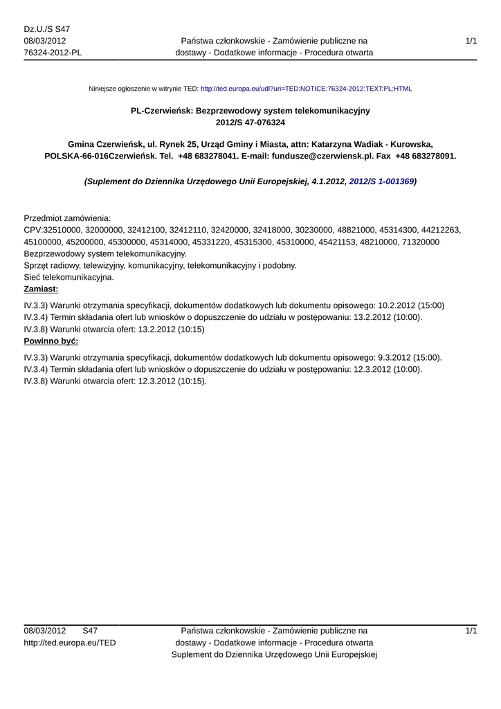 Dz.U./S S47 08/03/2012 76324-2012-PL Państwa członkowskie - Zamówienie publiczne na dostawy - Dodatkowe informacje - Procedura otwarta 1/1 Niniejsze ogłoszenie w witrynie TED: http://ted.europa.eu/udl?uri=TED:NOTICE:76324-2012:TEXT:PL:HTML PL-Czerwieńsk: Bezprzewodowy system telekomunikacyjny 2012/S 47-076324 Gmina Czerwieńsk, ul. Rynek 25, Urząd Gminy i Miasta, attn: Katarzyna Wadiak - Kurowska, POLSKA-66-016Czerwieńsk. Tel. +48 683278041. E-mail: [email protected]. Fax +48 683278091. (Suplement do Dziennika Urzędowego Unii Europejskiej, 4.1.2012, 2012/S 1-001369) Przedmiot zamówienia: CPV:32510000, 32000000, 32412100, 32412110, 32420000, 32418000, 30230000, 48821000, 45314300, 44212263, 45100000, 45200000, 45300000, 45314000, 45331220, 45315300, 45310000, 45421153, 48210000, 71320000 Bezprzewodowy system telekomunikacyjny. Sprzęt radiowy, telewizyjny, komunikacyjny, telekomunikacyjny i podobny. Sieć telekomunikacyjna. Zamiast: IV.3.3) Warunki otrzymania specyfikacji, dokumentów dodatkowych lub dokumentu opisowego: 10.2.2012 (15:00) IV.3.4) Termin składania ofert lub wniosków o dopuszczenie do udziału w postępowaniu: 13.2.2012 (10:00). IV.3.8) Warunki otwarcia ofert: 13.2.2012 (10:15) Powinno być: IV.3.3) Warunki otrzymania specyfikacji, dokumentów dodatkowych lub dokumentu opisowego: 9.3.2012 (15:00). IV.3.4) Termin składania ofert lub wniosków o dopuszczenie do udziału w postępowaniu: 12.3.2012 (10:00). IV.3.8) Warunki otwarcia ofert: 12.3.2012 (10:15). 08/03/2012 S47 http://ted.europa.eu/TED Państwa członkowskie - Zamówienie publiczne na dostawy - Dodatkowe informacje - Procedura otwarta Suplement do Dziennika Urzędowego Unii Europejskiej 1/1