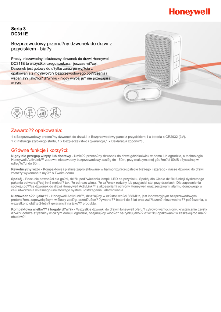 Seria 3 DC311E Bezprzewodowy przeno?ny dzwonek do drzwi z przyciskiem - bia?y Prosty, niezawodny i skuteczny dzwonek do drzwi Honeywell DC311E to wszystko, czego szukasz i jeszcze wi?cej. Dzwonek jest gotowy do u?ytku zaraz po wyj?ciu z opakowania z mo?liwo?ci? bezprzewodowego po??czenia i wspania?? jako?ci? d?wi?ku - nigdy wi?cej ju? nie przegapisz wizyty. Zawarto?? opakowania: 1 x Bezprzewodowy przeno?ny dzwonek do drzwi,1 x Bezprzewodowy panel z przyciskiem,1 x bateria x CR2032 (3V), 1 x Instrukcja szybkiego startu, 1 x Bezpiecze?stwo i gwarancja,1 x Deklaracja zgodno?ci, G?ówne funkcje i korzy?ci: Nigdy nie przegap wizyty lub dostawy - Umie?? przeno?ny dzwonek do drzwi gdziekolwiek w domu lub ogrodzie, a technologia Honeywell ActivLink™ zapewni niezawodny bezprzewodowy zasi?g do 150m, przy maksymalnej g?o?no?ci 80dB s?yszalnej w odleg?o?ci do 60m. Rewolucyjny wzór - Kompaktowe i pi?knie zaprojektowane w harmonizuj?cej palecie bia?ego i szarego - nasze dzwonki do drzwi zosta?y wykonane z my?l? o Twoim domu. Spokój - Poczucie pewno?ci dla go?ci, dzi?ki pod?wietleniu lampki LED na przycisku. Spokój dla Ciebie dzi?ki funkcji dyskretnego pukania odtwarzaj?cej inn? melodi? tak, ?e od razu wiesz, ?e cz?onek rodziny lub przyjaciel stoi przy drzwiach. Dla zapewnienia spokoju po??cz dzwonek do drzwi Honeywell ActivLink™ z akcesoriami ochrony Honeywell oraz zestawami alarmu domowego w celu utworzenia w?asnego unikatowego systemu ostrzegania i alarmowania. Niezawodno?? i jako?? - Honeywell ActivLink™, dzia?aj?cy w cz?stotliwo?ci 868MHz, jest innowacyjnym bezprzewodowym protoko?em, zapewniaj?cym wi?kszy zasi?g, przed?u?on? ?ywotno?? baterii do 5 lat oraz zwi?kszon? niezawodno?? po??czenia, a wszystko to obj?te 2-letni? gwarancj? na jako?? produktu. Kompaktowa wielko?? i bogaty d?wi?k - Wszystkie dzwonki do drzwi Honeywell oferuj? cyfrowo wzmocniony, krystalicznie czysty d?wi?k dobrze s?yszalny w ca?ym domu i ogrodzie, obejmuj?cy wiod?c? na rynku jako?? d?wi?ku opakowan? w zaskakuj?co ma?? obudow?! Specyfikacja: Bezprzewodowy przeno?ny dzwonek do drzwi Kolor bia?y Monta? na?cienny Opcja Cz?stotliwo?? / Bezprzewodowy zasi?g* 868MHz / 150m Zakres s?yszalno?c9 (g?o?no??) 60m (80dB) Melodie 4 D?wi?k Wewn?trzna syrena Czas alarmu (min) 2 (Tryb wewn?trznej syreny) Alerty wizualne Wska?nik LED Zasilanie Bateria: 4 x LR6 (AA) 1.5V - (nie za??czone) ?ywotno?? baterii (lata) 2 Funkcje baterii Wska?nik niskiego stanu baterii / ?atwo otwierana przegródka na baterie Maksymalna pojemno?? urz?dzenia 2 x Bezprzewodowy panel z przyciskiem/Bezprzewodowy czujnik ruchu/Bezprzewodowy czujnik na drzwi i okna Reset fabryczny Tak Temperatura robocza / przechowywania 0°C to +40°C/-20°C to +60°C Wymiary (mm) / Masa (g) 110 (h) x 70 (w) x 42.5 (d) / 169 (g) Zamocowania Obejmy / Ko?ki rozporowe / ?ruby Bezprzewodowy panel z przyciskiem Kolor bia?y Monta? na?cienny Opcja Opcje monta?u bez ?rubokr?ta (na klej) Tak Cz?stotliwo?? / Bezprzewodowy zasi?g* 868MHz / 200m Alerty wizualne Lampka zaufania LED Zasilanie Bateria: 1 x CR2032 (3V) - (included) ?ywotno?? baterii (lata) 2 Funkcje baterii Wska?nik niskiego stanu baterii / ?atwo otwierana przegródka na baterie Wzór panelu z przyciskiem Panorama Tabliczka na wtyk Tak Rating IP IP55 Temperatura robocza / przechowywania -20°C to +50°C/-20°C to +60°C Wymiary (mm) / Masa (g) 30 (h) x 70 (w) x 16 (d) / 23.5 (g) Zamocowania Obejmy / Ko?ki rozporowe / ?ruby / Przylepce Pack Kod EAN / Standardowy kod EAN opakowania 5004100967879 / 5004100968012 Wymiary opakowania (mm) / Masa (g) 216 (h) x 150 (w) x 68 (d) / 350 (g) Standardowa ilo?? opakowa? 4 * Zasi?g mierzony na terenie otwartym; ?ciany, sufity i struktury metalowe mog? go ograniczy?. livewell.honeywell.com | © 2015 Honeywell International Inc.