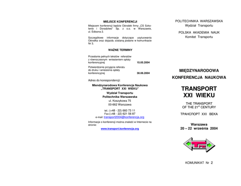 MIEJSCE KONFERENCJI Miejscem konferencji b dzie O rodek firmy „CS Szkolenie i Doradztwo” Sp. z o.o. w Warszawie, ul. Edisona 2. Szczegółowe informacje dotycz ce usytuowania O rodka oraz dojazdu zostan podane w komunikacie Nr 3. POLITECHNIKA WARSZAWSKA Wydział Transportu POLSKA AKADEMIA NAUK Komitet Transportu WA NE TERMINY Przesłanie pełnych tekstów referatów z równoczesnym wniesieniem opłaty konferencyjnej 15.05.2004 Potwierdzenie przyj cia referatu do druku i wniesienia opłaty konferencyjnej 30.06.2004 Adres do korespondencji: Miendzynarodowa Konferencja Naukowa „TRANSPORT XXI WIEKU” Wydział Transportu Politechnika Warszawska ul. Koszykowa 75 00-662 Warszawa MI DZYNARODOWA KONFERENCJA NAUKOWA TRANSPORT XXI WIEKU THE TRANSPORT OF THE 21st CENTURY tel.: (+48 - 22) 660 73 11 Fax:(+48 - 22) 621 56 87 TPAHC OPT XXI BEKA Informacje o konferencji mo na znale w Internecie na stronie: www.transport.konferencja.org Warszawa 20 – 22 wrze nia 2004 e-mail: [email protected] KOMUNIKAT Nr 2 KOMITET NAUKOWY KONFERENCJI Przewodnicz cy: Prof. Andrzej Chudzikiewicz Członkowie: Prof. Tomasz Ambroziak Prof. Eugeniy Błochin Prof. Roman Bogacz Prof. Jan Borgo Prof. Lech Bukowski Dr hab. Włodzimierz Choroma ski Prof. Christo Christov Prof. Mirosława D browa-Bajon Prof. Jurij Djomin Prof. Janusz Dyduch Prof. Stanisław D uła Prof. Włodzimierz G sowski Prof. Jerzy Girtler Prof. Lucjan Grochowski Prof. Jan Gronowicz Prof. Vladimir Hlavna Dr hab. Marianna Jacyna Prof. Jaroslav Janda Prof. Jerzy Ja wi ski Prof. Jerzy Kisilowski Dr hab. Gerard Krawczyk Prof. Otmar Krettek Prof. Lech Kobyli ski Prof. Jerzy Leszczy ski Prof. Zbigniew Lozia Prof. Mirosław Luft Prof. Jerzy Madej Dr hab. Marek Malarski Prof. Jerzy Manerowski Prof. Tadeusz Niedziela Dr hab. Mirosław Nader Prof. Stanisław Piasecki Prof. Jerzy Piotrowski Prof. Leon Prochowski Dr hab. Jacek Ro da Prof. Valery Sapo nikov Prof. Marek Sitarz Prof. Zbigniew Smalko Prof. Kazimierz Towpik Prof. Tadeusz Uhl Prof. Wojciech Wawrzy ski Dr hab. Krzysztof Zboi ski Prof. Istvan Zobory Prof. Antoni ochowski KOMITET ORGANIZACYJNY KONFERENCJI Przewodnicz cy: Prof. Tomasz Ambroziak Sekretarz: Dr in . Jarosław Pozna ski Członkowie: Dr in . Andrzej Ratkiewicz In . Andrzej Fronczak Mgr in . Stefan Przekopiak Mgr in . Dariusz Pyza Mgr in . Krzysztof Tabaka Mgr in . Maciej wi tecki Mgr in . Andrzej Wo niczko WST PNA KWALIFIKACJA REFERATU INFORMACJA O HOTELACH Referat Pana (Pani) został wst pnie zakwalifikowany do wygłoszenia podczas Mi dzynarodowej Konferencji Naukowej „Transport XXI wieku”. Ostateczna kwalifikacja nast pi w momencie przesłania pełnego tekstu referatu oraz wniesienia opłaty konferencyjnej. Uprzejmie informujemy, e osoby zainteresowane noclegiem, proszone s o dokonanie rezerwacji miejsca hotelowego we własnym zakresie. • Z powa aniem, Przewodnicz cy Komitetu Organizacyjnego Prof. Tomasz AMBROZIAK O rodek firmy „CS Szkolenie i Doradztwo” Sp. z o.o. w Warszawie, dysponuje baz noclegow , mieszcz c si na jego terenie. Ceny: WARUNKI UCZESTNICTWA Opłata konferencyjna: pokój jednoosobowy: 145 PLN pokój dwuosobowy: 210 PLN nocleg w pokoju 2-osobowym do pojedynczego wykorzystania: 170 PLN 310 PLN • pełna - 950 PLN apartament • dla doktorantów - 750 PLN niadanie 17 PLN niadanie (bufet) 20 PLN Opłata konferencyjna obejmuje udział w konferencji, materiały konferencyjne, posiłki typu lunch, napoje serwowane podczas przerw w obradach oraz udział w imprezach towarzysz cych. Adres o rodka: CS Szkolenie i Doradztwo Sp. z o.o. 04-506 Warszawa, ul. Edisona 2 tel.: (+48 22) 612 13 57 lub 58 (recepcja) fax:(+48 22) 513 10 17 e-mail: [email protected] www.csid.pl Sposób płatno ci W/w. kwot nale y wpłaci na konto z podaniem imienia i nazwiska uczestnika (uczestników) oraz instytucji, wg wzoru: Adresat: Politechnika Warszawska, Plac Politechniki 1 00-661 Warszawa Bank: PEKAO S.A. IV O/Warszawa Numer konta: 81 1240 1053 1111 0000 0500 5664 z dopiskiem: 1160 - Konferencja Rezygnacja z udziału W przypadku rezygnacji z udziału w Konferencji przesłanej listem lub faxem przed 1 wrze nia 2004 roku opłata konferencyjna b dzie zwrócona lecz pomniejszona o kwot 100 PLN. Po wy ej wymienionej dacie wniesiona opłata konferencyjna nie b dzie zwrócona w adnej cz ci. Hotele w pobli u miejsca konferencji: • IBIS - Warszawa "OSTROBRAMSKA", 04-193 Warszawa, ul. Ostrobramska 36, tel. (+48 22) 515 78 00 fax: (+48 22) 515 78 88 e-mail: [email protected] • "Zajazd Napoleo ski", 04-501 Warszawa, ul. Płowiecka 83, tel. (+48 22) 815 30 68, fax (+48 22) 815 22 16, e-mail: [email protected] www.napoleon.waw.pl