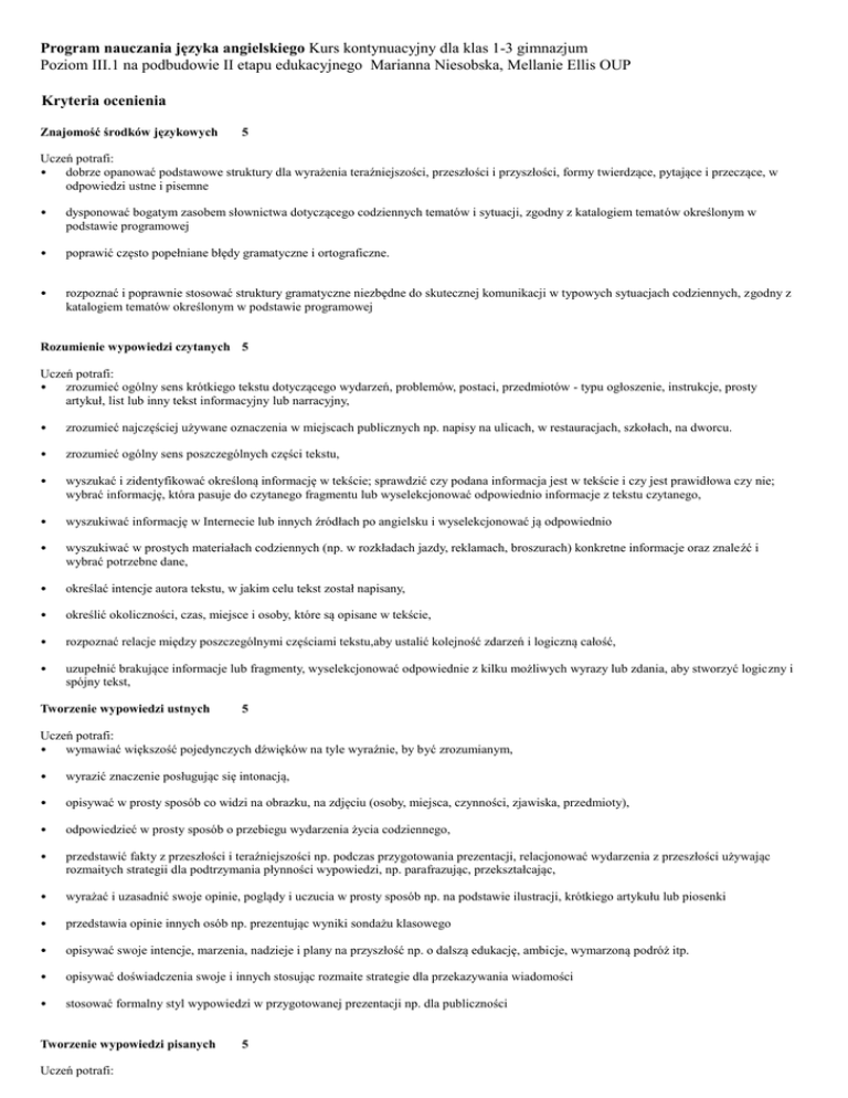 Program nauczania języka angielskiego Kurs kontynuacyjny dla klas 1-3 gimnazjum Poziom III.1 na podbudowie II etapu edukacyjnego Marianna Niesobska, Mellanie Ellis OUP Kryteria ocenienia Znajomość środków językowych 5 Uczeń potrafi: • dobrze opanować podstawowe struktury dla wyrażenia teraźniejszości, przeszłości i przyszłości, formy twierdzące, pytające i przeczące, w odpowiedzi ustne i pisemne • dysponować bogatym zasobem słownictwa dotyczącego codziennych tematów i sytuacji, zgodny z katalogiem tematów określonym w podstawie programowej • poprawić często popełniane błędy gramatyczne i ortograficzne. • rozpoznać i poprawnie stosować struktury gramatyczne niezbędne do skutecznej komunikacji w typowych sytuacjach codziennych, zgodny z katalogiem tematów określonym w podstawie programowej Rozumienie wypowiedzi czytanych 5 Uczeń potrafi: • zrozumieć ogólny sens krótkiego tekstu dotyczącego wydarzeń, problemów, postaci, przedmiotów - typu ogłoszenie, instrukcje, prosty artykuł, list lub inny tekst informacyjny lub narracyjny, • zrozumieć najczęściej używane oznaczenia w miejscach publicznych np. napisy na ulicach, w restauracjach, szkołach, na dworcu. • zrozumieć ogólny sens poszczególnych części tekstu, • wyszukać i zidentyfikować określoną informację w tekście; sprawdzić czy podana informacja jest w tekście i czy jest prawidłowa czy nie; wybrać informację, która pasuje do czytanego fragmentu lub wyselekcjonować odpowiednio informacje z tekstu czytanego, • wyszukiwać informację w Internecie lub innych źródłach po angielsku i wyselekcjonować ją odpowiednio • wyszukiwać w prostych materiałach codziennych (np. w rozkładach jazdy, reklamach, broszurach) konkretne informacje oraz znaleźć i wybrać potrzebne dane, • określać intencje autora tekstu, w jakim celu tekst został napisany, • określić okoliczności, czas, miejsce i osoby, które są opisane w tekście, • rozpoznać relacje między poszczególnymi częściami tekstu,aby ustalić kolejność zdarzeń i logiczną całość, • uzupełnić brakujące informacje lub fragmenty, wyselekcjonować odpowiednie z kilku możliwych wyrazy lub zdania, aby stworzyć logiczny i spójny tekst, Tworzenie wypowiedzi ustnych 5 Uczeń potrafi: • wymawiać większość pojedynczych dźwięków na tyle wyraźnie, by być zrozumianym, • wyrazić znaczenie posługując się intonacją, • opisywać w prosty sposób co widzi na obrazku, na zdjęciu (osoby, miejsca, czynności, zjawiska, przedmioty), • odpowiedzieć w prosty sposób o przebiegu wydarzenia życia codziennego, • przedstawić fakty z przeszłości i teraźniejszości np. podczas przygotowania prezentacji, relacjonować wydarzenia z przeszłości używając rozmaitych strategii dla podtrzymania płynności wypowiedzi, np. parafrazując, przekształcając, • wyrażać i uzasadnić swoje opinie, poglądy i uczucia w prosty sposób np. na podstawie ilustracji, krótkiego artykułu lub piosenki • przedstawia opinie innych osób np. prezentując wyniki sondażu klasowego • opisywać swoje intencje, marzenia, nadzieje i plany na przyszłość np. o dalszą edukację, ambicje, wymarzoną podróż itp. • opisywać doświadczenia swoje i innych stosując rozmaite strategie dla przekazywania wiadomości • stosować formalny styl wypowiedzi w przygotowanej prezentacji np. dla publiczności Tworzenie wypowiedzi pisanych Uczeń potrafi: 5 • wypełnić prosty kwestionariusz osobowy, • opisać w prosty sposób osoby, przedmioty, miejsca i czynności pokazywane na obrazku, • napisać krótki list do kolegi o codziennych czynnościach, o miejscu zamieszkania, o szkole, o rodzinie, o swoich zainteresowaniach, • przedstawić fakty z przeszłości i teraźniejszości np. prezentując informacje w ramach projektu na plakacie lub stronie internetowej, • napisać proste, krótkie opowiadanie relacjonując wydarzenie z przeszłości na podstawie notatki, obrazka itp., • napisać notatkę, np. w pamiętniku, opisując w prosty sposób zdarzenia i uczucia, • przedstawić opinie innych np. w raporcie z sondażu klasowego, • opisywać intencje, marzenia, nadzieje i plany na przyszłość np. w liście do kolegi/koleżanki, • opisywać doświadczenia swoje i innych np. pisząc kilka zdań o wakacjach, koncercie, wycieczce itp., • napisać pozdrowienia lub życzenia, stosując odpowiedni styl, • napisać krótkie zaproszenie lub podziękowanie, stosując odpowiedni styl, • poprawnie przeliterować większość poznanych słów, • poprawnie używać zasad pisowni oraz interpunkcji. Reagowanie na wypowiedzi 5 Uczeń potrafi: • brać udział w krótkich rozmowach na znane mu tematy, • nawiązać kontakty, przedstawić się, przywitać i pożegnać, dziękować i odpowiednio reagować, • rozpoczynać, podtrzymać i zakończyć rozmowę w celu uzyskania, udzielanie, przekazania, lub odmowy udzielania informacji i odpowiednio reagować, • porozumieć się skutecznie w typowych codziennych sytuacjach np. zakupy, podróże, • udzielać prostych wskazówek i instrukcji i odpowiednio reagować, • porozumieć się bezpośrednio i wymienić informacje dotyczące codziennych potrzeb, prowadząc proste negocjacje np. o terminie wykonanie zadania • proponować, przyjmować i odrzucać propozycje i sugestie, • prosić o pozwolenie, udzielić i odmawiać pozwolenia • wyrażać swoje opinie, intencje, preferencje i życzenia, pytać o opinie, preferencje i życzenia innych, zgadzać się, sprzeciwiać się • wyrażać uczucia, opinie i własne poglądy na codzienny tematy w prosty sposób. • prosić o radę i udzielać rady • prosić o coś oraz zgodzić się na prośbę lub odmówić prośbie • wyrażać skargę, przeprosić i właściwie odpowiadać, • poprosić o powtórzenie i wyjaśnienie, Przetwarzanie wypowiedzi 5 Uczeń potrafi: przekazać po angielsku infor
