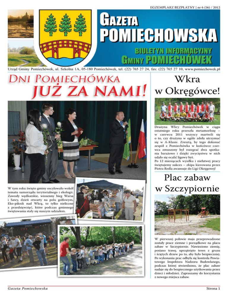 EGZEMPLARZ BEZPŁATNY | nr 6 (56) / 2012 Urząd Gminy Pomiechówek, ul. Szkolna 1A, 05-180 Pomiechówek, tel. (22) 765 27 24, fax: (22) 765 27 10, www.pomiechowek.pl Dni Pomiechówka już za nami! Wkra w Okręgówce! Drużyna Wkry Pomiechówek w ciągu ostatniego roku przeszła metamorfozę – w czerwcu 2011 wszyscy martwili się o to, czy drużyna w ogóle zdoła utrzymać się w A-Klasie. Zresztą, by tego dokonać zespół z Pomiechówka w końcówce czerwca zmuszony był rozegrać dwa spotkania barażowe i dzięki zwycięstwu w nich udało się ocalić ligowy byt. Po 12 miesiącach wysiłku i niełatwej pracy świętujemy sukces – ekipa kierowana przez Piotra Redla awansuje do Ligi Okręgowej! W tym roku święto gminy oscylowało wokół tematu samorządu terytorialnego i ekologii. Zawody wędkarskie, wiosenny bieg Warsa i Sawy, dzień otwarty na polu golfowym, Eko-piknik nad Wkrą, to tylko nieliczne z przedsięwzięć, które podczas gminnego świętowania stały się naszym udziałem. Plac zabaw w Szczypiornie W pierwszej połowie maja przeprowadzone zostały prace ziemne i porządkowe na placu zabaw w Szczypiornie. Nawieziono ziemię, posiano trawę, uprzątnięto teren z gruzu i ściętych drzew po to, aby było bezpieczniej. Po wykonaniu prac odbyła się kontrola Powiatowego Inspektora Nadzoru Budowlanego, podczas której stwierdzono, że plac zabaw nadaje się do bezpiecznego użytkowania przez dzieci i młodzież. Zapraszamy do korzystania z nowego miejsca zabaw. Gazeta Pomiechowska Strona 1 Wieści Gminne Wydanie nr 6 (56) / 2012 AKTUALNOŚCI Z życia Gminy DOTACJA DLA BIBLIOTEKI Informujemy, że Biblioteka Publiczna Gminy Pomiechówek bierze udział już w III edycji Programu „Akademia Orange dla bibliotek”. Celem programu jest wspieranie rozwoju społeczeństwa informacyjnego poprzez zwiększenie dostępu do nowych technologii komunikacyjnych i promocję ich wykorzystania, a także edukację oraz popularyzację i zwiększenie wykorzystania Internetu przez pracowników i użytkowników biblioteki tak, by gminne biblioteki publiczne stały się nowoczesnymi, wielofunkcyjnymi centrami informacyjnymi, kulturalnymi i edukacyjnymi. Fundacja Orange w odpowiedzi na złożony 2 kwietnia 2012 r. przez bibliotekę wniosek, przyznała dotację na bieżący rok w wysokości 1 058,91 zł . Dotacja jest przeznaczona w szczególności na zapewnienie dostępu do łączy internetowych w placówce głównej i filii bibliotecznej oraz ich bezpłatnego udostępniania. Dzięki wsparciu Fundacji Orange filia biblioteczna w Kosewie od 2010 r. posiada łącze internetowe, z którego można bezpłatnie korzystać. DELEGACJA Z ANTRODOCO W GMINIE W dniach 6-11 czerwca na terenie gminy przebywała pięcioosobowa delegacja z partnerskiej, włoskiej gminy Antrodoco. Spotkanie miało na celu m.in. wypracowanie rozwiązań w zakresie współpracy na niwie ochrony środowiska naturalnego, dóbr przyrody, edukacji ekologicznej i turystyki. XIX PIELGRZYMKA SAMORZĄDOWCÓW Samorząd Gminy Pomiechówek z przewodniczącą Rady Gminy i wójtem na czele wzięli udział w XIX Ogólnopolskiej Pielgrzymce Samorządowców na Jasną Górę, która odbyła się 20 maja, w ramach Dnia Samorządu Terytorialnego. CHCESZ ZAMIESZKAĆ POZA MIASTEM? Poszukujesz terenu na wybudowanie domu? Mamy ofertę dla Ciebie! Wójt Gminy Pomiechówek ogłosił przetargi na sprzedaż działek budowlanych w atrakcyjnych lokalizacjach. Można nabyć grunt pod budowę domu, zarówno w zurbanizowanym centrum gminy na terenie w pełni uzbrojonym w infrastrukturę techniczną - jak i na terenach wiejskich. Na przetarg wystawionych jest 12 działek budowlanych o powierzchni od 626m2 do 992m2 w Pomiechówku, Szczypiornie i CegielniKosewo. Zapraszamy do Urzędu Gminy Pomiechówek (ulica Szkolna 1a, pokój nr 14) – przedstawimy szczegółowe informacje o działkach, regulaminie i warunkach przetargu. Jesteśmy do dyspozycji również pod numerem telefonu 22 765 27 12. Ogłoszenia o przetargach znajdują się na stronie: www.bip.pomiechowek.pl w zakładce przetargi - nieruchomości. CYFROWA SZKOŁA Wyniki losowania w programie rządowym „Cyfrowa szkoła” nie były pomyślne dla naszych szkół podstawowych. Nowoczesny sprzęt multimedialny nie trafi od września br. do uczniów klas IV. Na szczęście był to pilotażowy nabór. Od roku 2013 Ministerstwo Edukacji Narodowej umożliwi wszystkim szkołom podstawowym przystąpienie do programu. ŚCIEŻKA DYDAKTYCZNA Gmina Pomiechówek wraz z Nadleśnictwem Jabłonna stara się pozyskać środki zewnętrzne na budowę ścieżki dydaktycznej w pomiechowskich lasach. Projekt obejmuje przystosowanie prawie 3 km dróg leśnych do korzystania również przez osoby niepełnosprawne. Wzdłuż szlaku umieszczone zostaną tablice informacyjne oraz ławki, kosze na śmieci. Nowy charakter zyska wiata znajdująca się w pobliżu leśniczówki w Pomiechówku. Będzie to głównie miejsce dydaktyczne z nasadzeniami ciekawych odmian roślin, wrzosowiskiem oraz miejscem zabaw dla najmłodszych. Dotychczas złożony został wniosek o dofinansowanie inwestycji do Wojewódzkiego Funduszu Ochrony Środowiska i Gospodarki Wodnej jednocześnie szukamy alternatywnych źródeł sfinansowania inwestycji. NA PIKNIK DO ORZECHOWA W imieniu organizatorów zapraszamy na Piknik Rodzinny do Orzechowa 17 czerwca br. w godz. 10:00-17:00. Miejsce: plac przed szkołą podstawową. W programie szereg atrakcji, m.in.: występ dzieci z Klubu Przedszkolaka, mecz piłki nożnej dzieci/rodzice, przedstawienie „Księżniczka na ziarnku grochu”, grilowanie. Strona 2 Gazeta Pomiechowska Czerwiec 2012 Wieści Gminne Drodzy Mieszkańcy, w ostatnich tygodniach stanęliśmy wobec sytuacji nieprzyjęcia naszych dzieci do Przedszkola Nr 2 w Nowym Dworze Mazowieckim i konieczności zabezpieczenia miejsca edukacji i opieki najmłodszych mieszkańców naszej gminy. Decyzja władz samorządowych Nowego Dworu Mazowieckiego, o której dowied