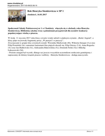 www.chodziez.pl Wygenerowano: 2017-03-06/23:36:15 Rok Henryka Sienkiewicza w SP 1 chodziez1, 16.01.2017 Społeczność Szkoły Podstawowej nr 1 w Chodzieży włączyła się w obchody roku Henryka Sienkiewicza. Biblioteka szkolna wraz z polonistami przygotowali dla uczniów konkursy popularyzujące wiedzę o pisarzu. W środę 11 stycznia 2017 roku klasy czwarte wzięły udział w pięknym czytaniu „Baśni i legend", a klasy piąte recytowały fragmenty prozy „W pustyni i w puszczy". Zwycięzcami w grupie klas czwartych zostali: Weronika Maćkowiak (4b), Wiktoria Smogur (4 a) oraz Filip Promiński (4c), natomiast laureatami klas piątych okazali się: Filip Górzny (5 d), Anna Rogacka (5c) oraz Jan Białkowski (5c), Aleksandra Bukowińska (5c), Dominik Felski (5a) i Mikołaj Łukaszewski (5d). - Poziom zmagań był wysoki, dlatego raz jeszcze wszystkim uczestnikom serdecznie gratulujemy i zapraszamy do lektury książek pisarza i noblisty - Henryka Sienkiewicza - dodają nauczyciele. Wykonanie: CONCEPT Intermedia www.concept.net.pl Strona 1/1