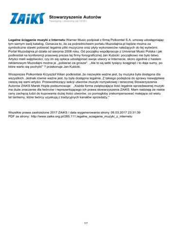 Legalne ściąganie muzyki z Internetu Warner Music podpisał z firmą Polkomtel S.A. umowę udostępniając tym samym swój katalog. Oznacza to, że za pośrednictwem portalu Muzodajnia.pl będzie można za symboliczne stawki pobierać legalnie pliki muzyczne oraz płyty wykonawców należących do tej wytwórni. Portal Muzodajnia.pl działa od sierpnia 2008 roku. Od początku współpracuje z Universal Music Polska i jak podkreślał na konferencji prasowej prezes tej firmy fonograficznej Jan Kubicki: początkowo nie było łatwo. Artyści mieli wątpliwości, czy im się opłaca udostępniać swoje utwory w Internecie, skoro zgodnie z hasłem reklamowym Muzodajni można je ,,pobierać za grosze''. ,,Ale to są setki tysięcy ściągnięć i to daje sumy, po które warto się pochylić'' ? przekonuje Jan Kubicki. Wiceprezes Polkomtela Krzysztof Kilian podkreślał, że niezwykle ważne jest, by muzyka była dostępna dla wszystkich. Jednak równie ważne jest, by była dostępna legalnie. Z takiego podejścia do sprawy niewątpliwie cieszą się sami artyści. Przewodniczący sekcji utworów muzyki rozrywkowej i tanecznej Stowarzyszenia Autorów ZAiKS Marek Hojda podsumowuje: ,,Każda forma zwiększająca ilość legalnie sprzedawanej muzyki ma duże znaczenie dla twórców i reprezentującego ich prawa stowarzyszenia ZAiKS. Mam nadzieję że niskie ceny zachęcą ludzi do kupowania dużej ilości utworów, co pomogłoby zrekompensować malejące od wielu lat tantiemy, które twórcy uzyskują z tradycyjnych kanałów sprzedaży.'' Wszelkie prawa zastrzeżone 2017 ZAiKS / data wygenerowania strony 06.03.2017 23:31:39 PDF ze strony: http://www.zaiks.org.pl/285,111,legalne_sciaganie_muzyki_z_internetu 1/1