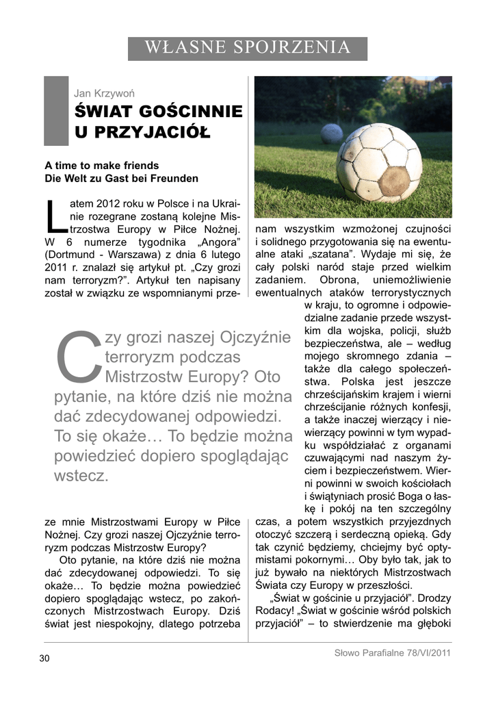 WŁASNE SPOJRZENIA Jan Krzywoń L ŚWIAT GOŚCINNIE U PRZYJACIÓŁ A time to make friends Die Welt zu Gast bei Freunden atem 2012 roku w Polsce i na Ukrainie rozegrane zostaną kolejne Mistrzostwa Europy w Piłce Nożnej. W 6 numerze tygodnika „Angora” (Dortmund - Warszawa) z dnia 6 lutego 2011 r. znalazł się artykuł pt. „Czy grozi nam terroryzm?”. Artykuł ten napisany został w związku ze wspomnianymi prze- nam wszystkim wzmożonej czujności i solidnego przygotowania się na ewentualne ataki „szatana”. Wydaje mi się, że cały polski naród staje przed wielkim zadaniem. Obrona, uniemożliwienie ewentualnych ataków terrorystycznych w kraju, to ogromne i odpowiedzialne zadanie przede wszystkim dla wojska, policji, służb zy grozi naszej Ojczyźnie bezpieczeństwa, ale – według mojego skromnego zdania – terroryzm podczas także dla całego społeczeńMistrzostw Europy? Oto stwa. Polska jest jeszcze pytanie, na które dziś nie można chrześcijańskim krajem i wierni chrześcijanie różnych konfesji, dać zdecydowanej odpowiedzi. a także inaczej wierzący i niewierzący powinni w tym wypadTo się okażeA To będzie można ku współdziałać z organami powiedzieć dopiero spoglądając czuwającymi nad naszym życiem i bezpieczeństwem. Wierwstecz. ni powinni w swoich kościołach i świątyniach prosić Boga o łaskę i pokój na ten szczególny ze mnie Mistrzostwami Europy w Piłce czas, a potem wszystkich przyjezdnych Nożnej. Czy grozi naszej Ojczyźnie terro- otoczyć szczerą i serdeczną opieką. Gdy tak czynić będziemy, chciejmy być optyryzm podczas Mistrzostw Europy? Oto pytanie, na które dziś nie można mistami pokornymiA Oby było tak, jak to dać zdecydowanej odpowiedzi. To się już bywało na niektórych Mistrzostwach okażeA To będzie można powiedzieć Świata czy Europy w przeszłości. „Świat w gościnie u przyjaciół”. Drodzy dopiero spoglądając wstecz, po zakończonych Mistrzostwach Europy. Dziś Rodacy! „Świat w gościnie wśród polskich świat jest niespokojny, dlatego potrzeba przyjaciół” – to stwierdzenie ma głęboki C 30 Słowo Parafialne 78/VI/2011 Własne spojrzenia biblijny odpowiednik. Oto Abraham siedzi (Pana domu). Zgodnie z relacją Ewanu wejścia do swego namiotu, gdy trzej gelisty Jana Jezus rozpoczyna swoje mężowie wyłaniają się przed nim. Abra- publiczne działanie na Weselu w Kanie ham przyjmuje ich zgodnie ze zwyczajami Galilejskiej. Ratuje zagrożoną uroczywschodniej gościnności. Podczas uczty stość weselną, gdy przemienia wodę goście okazują się być Posłami Bożymi, w wino. Królestwo Boże ukazuje się jako którzy Abrahamowi i Sarze - bezdzietnej i Wielka Uczta, do której zaprasza Jezus: zestarzałej parze - zapowiadają potomstwo. Goście kryją w sobie tajemnicę, a gościnądźmy podczas zbliżająność nie pozostaje bez wynagrodzenia. Dla Abrahama i Sacych się Mistrzostw Eury przyniesie ona błogosławieńropy w Piłce Nożnej stwo, co uwidoczni się potem także w ich potomstwie. w szczególny sposób gościnni Abraham pod postacią tych trzech mężów ma w gościnie i jednocześnie czuwajmy, by samego Boga. My też znamy to naszym gościom nie przydarzypowiedzenie: „Gość w dom, Bóg w dom”. W licznych biblijło się coś złego. nych miejscach Bóg pojawia się jako Gospodarz (Pan domu). Według Psalmu 23 Bóg wierzącemu udziela gościnności: Zas- A powiadam wam, że wielu przybędzie ze tawiasz przede mną stół wobec nieprzyja- wschodu i zachodu, i zsiądą do stołu ciół moich. Namaszczasz oliwą głowę mo- z Abrahamem i z Izaakiem i z Jakubem ją, kielich mój przelewa się. Dobroć i łaska w Królestwie Niebios. (Mt 8, 11). Nowy towarzyszyć mi będą przez wszystkie dni Testament tak podsumowuje biblijny sens życia mego. I zamieszkam w domu Pana gościnności: Gościnności nie zapominajprzez długie dni. W Nowym Testamencie cie; przez nią bowiem niektórzy, nie wieJezus sam przejmuje rolę Gospodarza dząc o tym, aniołów gościli (Hbr 13,2). Bądźmy podczas zbliżających się Mistrzostw Europy w Piłce Nożnej w szczególny sposób gościnni i jednocześnie czuwajmy, by naszym gościom nie przydarzyło się coś złego. Polak potrafiA Bądźmy wszyscy solidarniA Niech świat poczuje się w naszej Ojczyźnie, jak w gościnie u przyjaciół. Zdarz to, o Panie! B ks. Jan Krzywoń Słowo Parafialne 78/VI/2011 31 Wakacje 2011 Brzydkos łowi e Leon Krzemieniecki S ądzę, ten neologizm jest pojęciem obejmującym negatywne zjawiska kulturowe, naleciałości języka obiegowego nie tylko społecznych nizin. W nim potknięcia niegramatyczności na co dzień, rozpierzchłe wyrazowanie zwane ulicznym, rzekomo znamionujące siłę wypowiadającego jako znak przestankowy. Nie tyle to, ale coś znacznie więcej. Coś, co ze wzgórz spływa lawiną błota na domostwa nizinne. W ewangelicznych kazaniach Jezus nie pominął tematu i wielokrotnie zwracał uwagę na wstrzemięźliwość i poskramianie języka. O tym, między innymi, powiadają relacje Mateusza. Nie to, co wchodzi do ust, kala człowieka, lecz to, co z ust wychodzi. (15, 11). Ale, co z ust wychodzi, pochodzi z serca, i to kala człowieka. Z serca bowiem pochodzą złe myśli4 (15, 18 – 19). Rzecz nieprawidłowości mowy znajduje wyraz w dziele władz: Mówią bowiem, ale nie czynią. (23, 3). Chrystus, wspaniały humanista, przybył, aby odnaleźć to, co zagubiono. Literatura piękna winna być impulsem czystości języka. Raczej mowy. Niestety nie jest. Rządzące obecnie kulturą pismo wizualnoobrazkowe nie gardzi złą mową, będąc na bakier z etyką i estetyką. Na koniec ujawnię, jestem twórcą neologizmu “brzydkosłowie” od odległych lat publikacji w „Szpilkach”. Ślady w wypowiedziach językoznawców o prawidłowości formalnej, słowotwórczej wyrazu. Darujcie, że nie milczę o moim dobrym uczynku dla kultury społecznej i podstawach filozofii wiary. Leon Krzemieniecki 32 