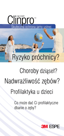 3M™ ESPE™ ™ Skuteczna ochrona jamy ustnej Ryzyko próchnicy? Choroby dziąseł? Nadwrażliwość zębów? Profilaktyka u dzieci Co może dać Ci profilaktyczne dbanie o zęby? Drogi Pacjencie, Czy odczuwasz ból podczas szczotkowania zębów lub po ich zetknięciu z gorącym, zimnym, słodkim lub kwaśnym napojem? To sygnał ostrzegawczy. Nadwrażliwość zębów może być oznaką utraty części szkliwa lub cofania się dziąseł. Czy Twoje zęby psują się? Na próchnicę zębów narzeka 80% ludzi na świecie. Czy Twoje dziąsła krwawią, są podrażnione? Czy obserwujesz zapalenie dziąseł? Twoje dziąsła cofają się odsłaniając wrażliwe szyjki zębów? To efekt powstawania płytki nazębnej oraz działania bakterii, zauważalny u milionów pacjentów. Próchnica, nadwrażliwość, czy choroby dziąseł to najczęściej występujące choroby jamy ustnej. Jednak o ich występowaniu dowiadujemy się zwykle zbyt późno. Jak im zapobiegać? Jak zadbać o to, aby występowały jak najrzadziej? Co robić, aby nasze zęby zostały długo zdrowe? Odpowiedź na te pytania znajdziesz na dalszych stronach tej broszury. Przeczytaj także, jak możesz zadbać o zdrowe zęby swojego dziecka. Ograniczanie ryzyka próchnicy Próchnica jest skutkiem demineralizacji zęba wywołanego działaniem bakterii znajdujących się w powstającej na jego powierzchni płytce nazębnej. Prowadzi do uszkodzenia zęba, a nieleczona może spowodować nawet jego obumarcie. Struktura zdrowego zęba Próchnica we wczesnym stadium rozwoju Zaawansowana próchnica Ryzyko próchnicy można zminiejszyć poprzez: • systematyczną higienę jamy ustnej (szczotkowanie, używanie płukanek, nitki do zębów, irygatora), • PROFESJONALNE ZABIEGI PROFILAKTYCZNE w gabinecie stomatologicznym: – odpowiednio wczesne uszczelnianie bruzd i zagłębień, – regularne usuwanie płytki nazębnej i osadów, – zabezpieczenie powierzchni zębów lakierem zawierającym fluor, • właściwe odżywianie. Zapytaj swojego lekarza stomatologa. Walka z chorobami dziąseł Choroby dziąseł są najczęściej skutkiem występowania płytki nazębnej, w której rozwijają się nieprzyjazne dla nich i dla zębów bakterie. Objawiają się poprzez obrzęk, podrażnienie, krwawienie a nawet stan zapalny. Brak właściwej pielęgnacji dziąseł może doprowadzić w ostateczności do występowania paradontozy (odsłonięcia szyjek zębów) – najczęstszej przyczyny utraty zębów przez osoby starsze. Zdrowe dziąsła Choroba dziąseł Paradontoza z kamieniem Skuteczna walka z chorobami dziąseł wymaga: • systematycznej higieny jamy ustnej (szczotkowania, używania płukanek, nitiki do zębów, irygatora), • PROFESJONALNYCH ZABIEGÓW PROFILAKTYCZNYCH w gabinecie stomatologicznym: – regularnego usuwania płytki, osadów i kamienia nazębnego, – zabezpieczenia powierzchni zębów lakierem zawierającym fluor, • właściwego odżywiania. Zapytaj swojego lekarza stomatologa. Znoszenie nadwrażliwości zębów Każdy ząb zbudowany jest z trzech warstw: szkliwa – twardej zewnętrznej warstwy, zębiny – delikatniejszej warstwy zęba znajdującej się pod szkliwem oraz miazgi – wewnętrznej części zawierającej naczynia i nerwy. W przestrzeni zęba znajdują się kanaliki, które zwężają się w kierunku szkliwa. Odsłonięcie kanalików o szerszym zakończeniu (np. te znajdujące się w zębinie odsłoniętych szyjek) powoduje nadwrażliwość odczuwaną np. przy zetknięciu z zimnem, gorącem, słodkim lub kwaśnym napojem. Szkliwo Zębina Zdrowe dziąsła zasłaniają szyjki zęba Odsłonięta szyjka zęba Miazga Nadwrażliwość można ograniczyć przez: • PROFESJONALNE ZABIEGI PROFILAKTYCZNE w gabinecie stomatologicznym – pokrycie powierzchni zębów lakierami z fluorem, • zastosowanie odpowiednich środków do higieny jamy ustnej (płukanki, pasty do zębów, odpowiedniej techniki szczotkowania), • właściwe odżywianie. Zapytaj swojego lekarza stomatologa. Profesjonalne zabiegi Usuwanie płytki nazębnej i osadów Piaskowanie z Clinpro Prophy Powder TM Usuwanie płytki nazębnej to najczęściej stosowany zabieg profilaktyczny. Jest jednym z najważniejszych elementów dbania o zdrowie zębów pacjenta. Płytkę nazębną usuwa się podczas piaskowania. Stosowany przez Twojego lekarza stomatologa proszek do piaskowania Clinpro Prophy Powder jest łagodny dla szkliwa. Zapewnia szybkie oraz mniej uciążliwe usuwanie płytki nazębnej, nawet u pacjentów z chorymi dziąsłami. Ponadto proszek ma przyjemny smak oraz nie pozostawia odczucia piasku w ustach. Zęby z płytką Zęby po oczyszczeniu Polerowanie z Clinpro Prophy Paste TM Uzupełnieniem piaskowania jest polerowanie powierzchni zęba profilaktyczną pastą uwalniającą fluor. Zabieg ten pozwala na usuwanie wszelkich przebarwień lub plam występujących na zębach. Używana przez Twojego stomatologa pasta Clinpro Prophy Paste ma przyjemny smak. Ochronna warstwa lakieru z fluorem Lakier ochronny Clinpro White Varnish TM Lakier Clinpro White Varnish, dzięki wydzielaniu fluoru, skutecznie chroni zęby i gwarantuje odczuwalny efekt w walce z nadwrażliwością. Ma przyjemny miętowo - słodki smak. Zapewni Ci również więcej swobody niż lakiery stosowane w innych gabinetach. Możesz bowiem jeść i pić już bezpośrednio po zabiegu. Aplikacja lakieru profilaktyczne w gabinecie Zadbaj o zęby swojego dziecka Lakowanie z Clinpro Sealant TM Zęby Twojego dziecka są bardziej podatne na występowanie próchnicy. Ponadto stan zębów mlecznych wpływa na późniejszą odporność zębów stałych na efekty działania bakterii. Mają one także znaczenie przy kształtowaniu łuków zębowych – przedwczesna utrata zębów mlecznych może spowodować wady zgryzu. Dlatego maksymalną ochronę należy zapewnić już od momentu pojawienia się pierwszego zęba. Clinpro Sealant jest uwalniającym fluor uszczelniaczem do bruzd i zagłębień. Dzięki swoi