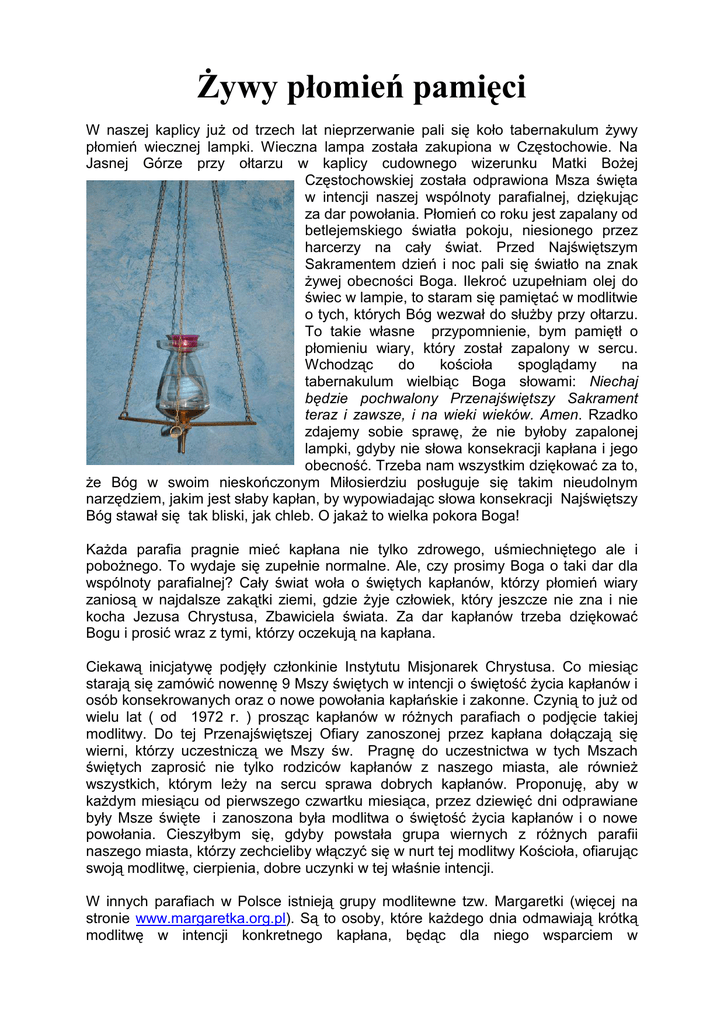 Żywy płomień pamięci W naszej kaplicy już od trzech lat nieprzerwanie pali się koło tabernakulum żywy płomień wiecznej lampki. Wieczna lampa została zakupiona w Częstochowie. Na Jasnej Górze przy ołtarzu w kaplicy cudownego wizerunku Matki Bożej Częstochowskiej została odprawiona Msza święta w intencji naszej wspólnoty parafialnej, dziękując za dar powołania. Płomień co roku jest zapalany od betlejemskiego światła pokoju, niesionego przez harcerzy na cały świat. Przed Najświętszym Sakramentem dzień i noc pali się światło na znak żywej obecności Boga. Ilekroć uzupełniam olej do świec w lampie, to staram się pamiętać w modlitwie o tych, których Bóg wezwał do służby przy ołtarzu. To takie własne przypomnienie, bym pamiętł o płomieniu wiary, który został zapalony w sercu. Wchodząc do kościoła spoglądamy na tabernakulum wielbiąc Boga słowami: Niechaj będzie pochwalony Przenajświętszy Sakrament teraz i zawsze, i na wieki wieków. Amen. Rzadko zdajemy sobie sprawę, że nie byłoby zapalonej lampki, gdyby nie słowa konsekracji kapłana i jego obecność. Trzeba nam wszystkim dziękować za to, że Bóg w swoim nieskończonym Miłosierdziu posługuje się takim nieudolnym narzędziem, jakim jest słaby kapłan, by wypowiadając słowa konsekracji Najświętszy Bóg stawał się tak bliski, jak chleb. O jakaż to wielka pokora Boga! Każda parafia pragnie mieć kapłana nie tylko zdrowego, uśmiechniętego ale i pobożnego. To wydaje się zupełnie normalne. Ale, czy prosimy Boga o taki dar dla wspólnoty parafialnej? Cały świat woła o świętych kapłanów, którzy płomień wiary zaniosą w najdalsze zakątki ziemi, gdzie żyje człowiek, który jeszcze nie zna i nie kocha Jezusa Chrystusa, Zbawiciela świata. Za dar kapłanów trzeba dziękować Bogu i prosić wraz z tymi, którzy oczekują na kapłana. Ciekawą inicjatywę podjęły członkinie Instytutu Misjonarek Chrystusa. Co miesiąc starają się zamówić nowennę 9 Mszy świętych w intencji o świętość życia kapłanów i osób konsekrowanych oraz o nowe powołania kapłańskie i zakonne. Czynią to już od wielu lat ( od 1972 r. ) prosząc kapłanów w różnych parafiach o podjęcie takiej modlitwy. Do tej Przenajświętszej Ofiary zanoszonej przez kapłana dołączają się wierni, którzy uczestniczą we Mszy św. Pragnę do uczestnictwa w tych Mszach świętych zaprosić nie tylko rodziców kapłanów z naszego miasta, ale również wszystkich, którym leży na sercu sprawa dobrych kapłanów. Proponuję, aby w każdym miesiącu od pierwszego czwartku miesiąca, przez dziewięć dni odprawiane były Msze święte i zanoszona była modlitwa o świętość życia kapłanów i o nowe powołania. Cieszyłbym się, gdyby powstała grupa wiernych z różnych parafii naszego miasta, którzy zechcieliby włączyć się w nurt tej modlitwy Kościoła, ofiarując swoją modlitwę, cierpienia, dobre uczynki w tej właśnie intencji. W innych parafiach w Polsce istnieją grupy modlitewne tzw. Margaretki (więcej na stronie www.margaretka.org.pl). Są to osoby, które każdego dnia odmawiają krótką modlitwę w intencji konkretnego kapłana, będąc dla niego wsparciem w przeciwnościach. Jedni czynią to anonimowo, inni pragną osobiście poznać kapłana, bo łatwiej im wtedy modlić się za konkretnego człowieka. Inicjatywę modlitwy o powołania zainicjowali w Kościele salwatorianie. Najpierw modlono się w pierwsze soboty miesiąca, potem obrano pierwszy czwartek miesiąca dniem tej modlitwy (więcj informacji na ten temat można znaleźć na stronie www.katolik.pl). Modlitwa o powołania ułożona przez ks. Paschalisa Schmidta, salwatorianina. O Boski Zbawicielu, Jezu Chryste, który powierzyłeś kapłanom, jako Twoim zastępcom, całe dzieło odkupienia, ratowania i uświęcania świata, ofiaruję Ci wszystkie modlitwy, prace, radości, ofiary i cierpienia dnia dzisiejszego, przez ręce Twojej Przenajświętszej Matki, w intencji uświęcenia kapłanów i kandydatów do stanu kapłańskiego. Daj nam kapłanów prawdziwie świętych, pałających ogniem Twej Boskiej miłości, którzy by szukali jedynie Twojej większej czci i zbawienia naszych dusz. Strzeż ich od niebezpieczeństw duszy i ciała, szczególniej zaś chroń ich przed tym, co zagraża ich cnocie i obniża w nich ideał świętości kapłańskiej. A Ty, Maryjo, dobra Matko kapłanów, ochraniaj ich w niebezpieczeństwach ich świętego powołania i przyprowadź do Dobrego Pasterza także tych biednych kapłanów, którzy zbłądzili i sprzeniewierzyli się przyjętym na siebie obowiązkom. Amen. Droga Siostro, drogi Bracie, Będę Ci naprawdę wdzięczny za to, że podejmiesz sam albo z kimś takie zobowiązanie, by przez modlitwę być wsparciem dla posługujących w parafiach kapłanów. Niech żywy płomień wiecznej lampki w kaplicy fatimskiej zachęca wszystkich do wdzięcznej pamięci przed Bogiem. Ks. Alojzy Gorol, Proboszcz,
