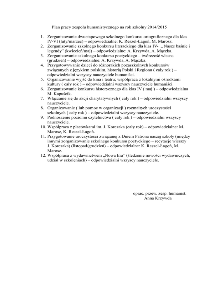 Plan pracy zespołu humanistycznego na rok szkolny 2014/2015 1. Zorganizowanie dwuetapowego szkolnego konkursu ortograficznego dla klas IV-VI (luty/marzec) – odpowiedzialne: K. Reszel-Łagoń, M. Marosz. 2. Zorganizowanie szkolnego konkursu literackiego dla klas IV- „ Nasze baśnie i legendy” (kwiecień/maj) – odpowiedzialne: A. Krzywda, A. Mączka. 3. Zorganizowanie szkolnego konkursu poetyckiego – twórczość własna (grudzień) – odpowiedzialne: A. Krzywda, A. Mączka. 4. Przygotowywanie dzieci do różnorakich pozaszkolnych konkursów związanych z językiem polskim, historią Polski i Regionu ( cały rok ) – odpowiedzialni wszyscy nauczyciele humaniści. 5. Organizowanie wyjść do kina i teatru; współpraca z lokalnymi ośrodkami kultury ( cały rok ) – odpowiedzialni wszyscy nauczyciele humaniści. 6. Zorganizowanie konkursu historycznego dla klas IV ( maj ) – odpowiedzialna M. Kapuścik. 7. Włączanie się do akcji charytatywnych ( cały rok ) – odpowiedzialni wszyscy nauczyciele. 8. Organizowanie ( lub pomoc w organizacji ) rozmaitych uroczystości szkolnych ( cały rok ) – odpowiedzialni wszyscy nauczyciele. 9. Podnoszenie poziomu czytelnictwa ( cały rok ) – odpowiedzialni wszyscy nauczyciele. 10. Współpraca z placówkami im. J. Korczaka (cały rok) – odpowiedzialne: M. Marosz, K. Reszel-Łagoń. 11. Przygotowanie uroczystości związanej z Dniem Patrona naszej szkoły (między innymi zorganizowanie szkolnego konkursu poetyckiego – recytacje wierszy J. Korczaka) (listopad/grudzień) – odpowiedzialne: K. Reszel-Łagoń, M. Marosz. 12. Współpraca z wydawnictwem „Nowa Era” (śledzenie nowości wydawniczych, udział w szkoleniach) – odpowiedzialni wszyscy nauczyciele. oprac. przew. zesp. humanist. Anna Krzywda
