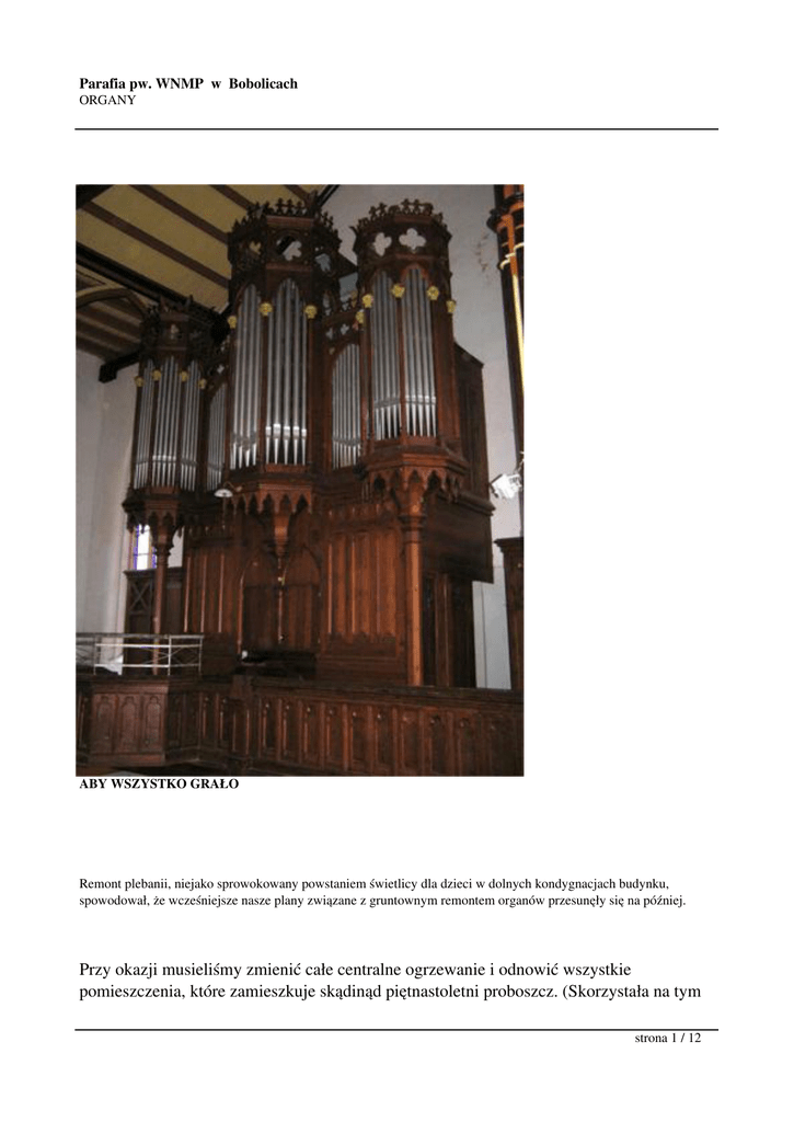 Parafia pw. WNMP w Bobolicach ORGANY ABY WSZYSTKO GRAŁO Remont plebanii, niejako sprowokowany powstaniem świetlicy dla dzieci w dolnych kondygnacjach budynku, spowodował, że wcześniejsze nasze plany związane z gruntownym remontem organów przesunęły się na później. Przy okazji musieliśmy zmienić całe centralne ogrzewanie i odnowić wszystkie pomieszczenia, które zamieszkuje skądinąd piętnastoletni proboszcz. (Skorzystała na tym strona 1 / 12 Parafia pw. WNMP w Bobolicach ORGANY kuchnia, kancelaria, pokój gościnny i inne pokoje znajdujące się na tym piętrze). Szczęśliwie zakończyliśmy ten remont, więc pora wrócić do wcześniejszych ustaleń i spróbować powalczyć o nasz instrument, który jak się państwo dowiedzą z pism konserwatora i osób znających się na rzeczy, zajmuje czołowe miejsce wśród podobnych na terenie całego Pomorza. Perspektywa festiwali organowych zapewne będzie także atrakcyjna dla naszej miejscowości, która przecież leży na trasie krzyżujących się komunikacyjnych szlaków. Bobolickie organy zostały wpisane do rejestru zabytków ruchomych, dlatego też staraliśmy się w Ministerstwie Kultury i Dziedzictwa Narodowego o dotację. Niestety nasz wniosek został odrzucony. Od Konserwatora Zabytów otrzymaliśmy na ten cel 17 tyś. pln i także z budżetu gminy 10 tyś. Do tego dołączamy prawie 17 tyś. specjalnie dodatkowo złożonych ofiar od naszych parafian. Jesteśmy niezmiernie wdzięczni tym instytucjom jak również wszystkim ofiarodawcom, chociaż cały remont, jak to wynika z załączonego kosztorysu, wyniesie ponad 140 tyś pln. Ponieważ harmonogram prac rozłożony jest na dwa etapy powinniśmy pod względem finansowym dać sobie z tym radę. By zobrazować tematykę przedsięwzięcia dołączam niektóre dokumenty, ktśre zgromadziliśmy. Będą to kosztorysy remontu instrumentu i szafy organowej oraz opinia pani konserwator zabytków. Prezbiterium kościoła to centralne miejsce sakrum i o to zadbaliśmy ostatnimi czasy. Jednak bardzo podobnym miejscem jest chór, który przez muzykę i śpiew dopełnia to wszystko co się dzieje na ołtarzu. Są to relacje, które się nawzajem uzupełniają i może dzięki temu jesteśmy bliżej tego „który to wszystko tak wspaniale urządził”. Odsyłam do lektury dokumentów czekając na państwa opinie na ten temat. -1Program i kosztorys inwestorski prac rekonstrukcyjnych i konserwatorskich przy organach w kościele parafialnym p.w. Wniebowzięcia NMP w Bobolicach Opis instrumentu: Organy o pierwotnym wyposażeniu, posiadające dużą wartość historyczną. Zbudowane w 1886 roku przez firmę Barnima Griineberga ze Szczecina, sygnowane jako op. 469. Są jednym z największych zachowanych instrumentów tej firmy o trakturze mechanicznej-stożkowej na terenie Pomorza. Reprezentują one cechy niemieckiego romantycznego instrumentu w zakresie dyspozycji głosów i charakteru brzmienia . Organy wyposażone są w mechaniczną - stożkową trakturę. Stół gry posiada dwie klawiatury ręczne oraz klawiaturę nożną. Dyspozycja instrumentu to 21- głosów labialnych, 9 w I manuale, 7 w II manuale oraz 5 - w pedale. Do unikatowych należy klarnet labialny w zespole brzmieniowym II manuału. Układ zasilający instrument w sprężone powietrze wyposażony jest w miech wielofałdowy, oraz wentylator elektryczny umiejscowiony z tyłu za instrumentem. Obecnie obiekt jest w złym stanie technicznym. Szczególnym problemem jest szybko postępująca dewastacja części drewnianych, powodowana przez szkodniki drewna. Dotyczy to zwłaszcza piszczałek drewnianych, z których już ok. 25 % nie nadaje się do dalszej eksploatacji i winny być zrekonstruowane. Piszczałki metalowe są dobrze zachowane, braki występują w głosach Mixtur 4 fach - brak IV rzędu i Rauschąuinte 2 2/3' brak rzędu kwinty. strona 2 / 12 Parafia pw. WNMP w Bobolicach ORGANY Instrument ogólnie jest bardzo zanieczyszczony i nosi ślady wielu uszkodzeń oraz niefachowych napraw. Dużą wartość ma też obudowa obiektu z neogotyckim prospektem. Dyspozycja: I Manuał: II Manuał Bordun 16 Geig. Principal 8' Principal 8' Rohrfloete 8' Hohfloete8' Aeoline 8' Yiola di Gamba 8' Salicional 8' Pedał Violonbass 16' Subbass 16' Principalbass 8'/Lieblich Gedact 87 Cello 8' /Principalbass 87 Gedact 8' Flauto amab. 4' Bassfloete 8' Octave 4' Fugara 4' Rohrfloete 4' Labial klarinette 8' Rauschąuinte 2 2/3' Mixtur 4 fach Program prac: 1. Wykonawca przed rozpoczęciem prac, winien uwzględnić wszystkie informacje historyczne dot. warsztatu organmistrzowskiego Barnima Griineberga - budowniczego przedmiotowych organów i stosowanych w nim rozwiązań konstrukcyjnych oraz przedstawić szczegółowy zakres i harmonogram planowanych etapów robót. 2. Demontaż wszystkich elementów instrumentu i ich oczyszczenie. 3. Dezynsekcja elementów drewnianych poprzez nasączenie płynem owadobójczym, w tym podłogi pod instrumentem 4. Remont systemu powietrznego - miecha i drewnianych kanałów 5. Remont wiatrownic 6. Remont i rekonstrukcja brakujących lub uszkodzonych elementów traktury strona 3 / 12 Parafia pw. WNMP w Bobolicach ORGANY klawiaturowej i rejestrowej. 7. Remont klawiatur ręcznych oraz rekonstrukcja klawiatury pedałowej. 8. Naprawa istniejących i rekonstrukcja brakujących piszczałek metalowych. 9. Naprawa i rekonstrukcja zniszczonych przez owady piszczałek drewnianych lO.Uzupełnienie porcelanek z nazwami głosów według oryginalnej trzcionki na manubriach registrowych 11 .Remont obudowy II manuału i mechanizmu żaluzji 12.Remont ławki dla organisty 13.Intonacja i strojenie. Kosztorys: 1. Oczyszczenie mechaniczne - 2 500.00 zł. 2. Dezynsekcja - 2 500.00 zł. 3. Remont miecha - 4 000.00 zł. 4. Remont kanałów powietrznych 5. Remont wiatrownic 6. Remont i częściowa rekonstrukcja traktury - 5 000.00 zł. 7. Remont klawiatur ręcznych - 2 500.00 zł. 8. Rekonstrukcja klawiatury pedałowej - l 500.00 zł. 