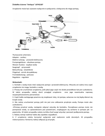 Źródełko ścienne "Antiqua" 10742187 Urządzenie może być używane wyłącznie w połączeniu z dołączona do niego pompą. Tłumaczenie schematu: Adapter - zasilacz Elektro-Leitung - przewód elektryczny Pumpengehäuse - obudowa pompy Wasser-Auslass - wypływ wody Saugnapf - przyssawki Beleuchtung - oświetlenie Flügelrad - wirnik skrzydełkowy Frontabdeckung - pokrywa Regulator - regulator Wskazówki: 1. Kontakt z wodą może mieć wyłącznie pompa i przewód elektryczny. Wtyczka ani żadna inna część urządzenie nie mogą kontaktu z wodą. 2. Proszę nie uruchamiać urządzenia, jeśli jakaś jego część nie działa prawidłowo lub jest uszkodzona. W takim przypadku należy zlecić przegląd urządzenia oraz jego ewentualna naprawę wyspecjalizowanemu personelowi. 3. Część kabla zasilającego powinna się znajdować niżej, niż pompa, wówczas na niej będą zbierać się krople wody. 4. Nie należy uruchamiać pompy jeśli nie jest ona całkowicie przykryta wodą. Pompa może ulec uszkodzeniu. →Pompę przykryć wodą, następnie włączyć wtyczkę do kontaktu. Początkowo pompa może nie pompować wody, co spowodowane jest powietrzem, znajdującym się zarówno w pompie jak i w pojemniku. W takim przypadku należy na kilka chwil wyjąć wtyczkę i ponowić podłączenie pompy. 5. Należy zwinąć nadmiar kabla aby zapobiec wypadkom. 6. Z urządzenia należy korzystać wyłącznie pod nadzorem osób dorosłych. W przypadku niekorzystania z fontanny należy odłączyć ją od prądu. 1 7. Należy postawić fontannę na podłożu odpornym na działanie wilgoci. 8. Moc pompy musi zostać ustawiona indywidualnie tak, aby woda spadała z odpowiednią siłą, aby jednak jednocześnie nie wylewała się na zewnątrz fontanny. Konserwacja: • W celu uniknięcia zanieczyszczenia rurki osadami wapnia, należy używać wodę destylowaną. • Jeśli użytkowanie będzie się odbywać zgodnie z instrukcją, konserwacja nie jest potrzebna. • Jeśli w otworach napowietrzających pompy znajdują się zanieczyszczenia, należy odłączyc pompę od prądu i umyć ją czysta wodą. Montaż: 1. Proszę przymocować pompę przy pomocy przyssawek do spodu pojemnika. 2. Następnie proszę włożyć rurkę do pompy. 3. Proszę umieścić oświetlenie w przeznaczonym dla niego uchwycie. 4. Proszę wypełnić woda spodnią część urządzenia, woda nie może się przelewać przez krawędź urządzenia. 5. Proszę włożyć wtyczkę do kontaktu. 2