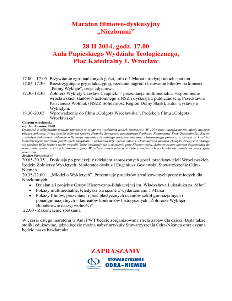 Maraton filmowo-dyskusyjny „Niezłomni” 28 II 2014, godz. 17.00 Aula Papieskiego Wydziału Teologicznego, Plac Katedralny 1, Wrocław 17.00 - 17.05 Przywitanie zgromadzonych gości, info o 1 Marca i tradycji takich spotkań 17.05-17.30 Rozstrzygnięcie gry edukacyjnej, rozdanie nagród i losowanie biletów na koncert „Panny Wyklęte”, sesja zdjęciowa 17.30-18.30 Żołnierz Wyklęty Czesław Czaplicki – prezentacja multimedialna, wspomnienie wrocławskich śladów Niezłomnego z NSZ i dyskusja z publicznością. Przedstawia Pan Janusz Wolniak (NSZZ Solidarność Region Dolny Śląsk), autor wystawy o Wyklętym. 18.30-20.05 Wprowadzenie do filmu „Golgota Wrocławska”, Projekcja filmu „Golgota Wrocławska” Golgota wrocławska reż. Jan Komasa, 2008 Opowieść o odkrywaniu prawdy zapisanej w nigdy nie wysłanych listach skazańców. W 1994 roku natrafia na nie młody historyk piszący doktorat. W ten sposób odkrywa sprawę Henryka Szwejcera, poważanego dyrektora Komunalnej Kasy Oszczędności. Razem z młodym bohaterem widzowie odkrywają tajemnicę brutalnego aresztowania oraz ukartowanego procesu, w którym za kradzież kilkudziesięciu znaczków pocztowych zasądzono i wykonano trzy wyroki śmierci. Dramatyczna historia Henryka Szwejcera okazuje się wkrótce tylko jedną z wielu tragedii, które wydarzyły się w więzieniu przy Kleczkowskiej. Bohater swoim uporem doprowadza do oznaczenia miejsc, w których chowano ofiary. W żadnym innym mieście w Polsce miejsca ich pochówku nie zostały tak precyzyjnie oznaczone. Źródło: Filmpolski.pl 20.05-20.35 Dyskusja po projekcji z udziałem zaproszonych gości, przedstawicieli Wrocławskich Rodzin Żołnierzy Wyklętych. Moderator dyskusji Eugeniusz Gosiewski, Stowarzyszenie OdraNiemen 20.35-22.00 „Młodzi o Wyklętych”. Prezentacje projektów zrealizowanych przez młodych dla Niezłomnych: Działania i projekty Grupy Historyczno-Edukacyjnej im. Władysława Łukasiuka ps„Młot” Pokazy multimedialne, teledyski związane z wydarzeniami 1 Marca Pokazy filmów, prezentacji i prac plastycznych uczniów szkół gimnazjalnych i ponadgimnazjalnych – laureatów konkursów historycznych „Żołnierze WyklęciBohaterowie naszej wolności” 22.00 - Zakończenie spotkania W czasie całego maratonu w Auli PWT będzie zorganizowana strefa zabaw dla dzieci. Będą także stoliki edukacyjne, gdzie będzie można nabyć artykuły Stowarzyszenia Odra-Niemen oraz czynna będzie nasza kawiarenka. ZAPRASZAMY