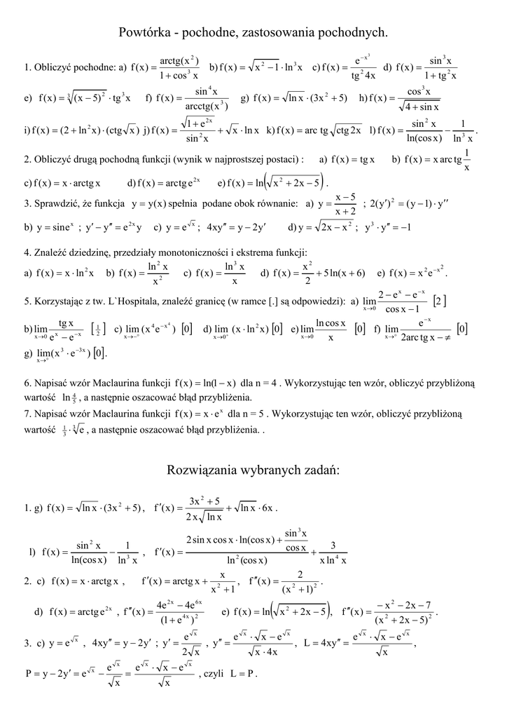 Powtórka - pochodne, zastosowania pochodnych. sin 3 x e−x b) f ( x ) = x − 1 ⋅ ln x c) f ( x ) = 2 d) f ( x ) = tg 4 x 1 + tg 2 x 3 arctg ( x 2 ) 1. Obliczyć pochodne: a) f ( x ) = 1 + cos 3 x e) f ( x ) = 3 ( x − 5) 2 ⋅ tg 3 x f) f ( x ) = 2 sin 4 x arcctg( x 3 ) 3 h) f ( x ) = g) f ( x ) = ln x ⋅ (3x 2 + 5) cos 3 x 4 + sin x 1+ e sin 2 x 1 i) f ( x ) = (2 + ln x ) ⋅ (ctg x ) j) f ( x ) = + x ⋅ ln x k) f ( x ) = arc tg ctg 2x l) f ( x ) = − 3 . 2 ln(cos x ) ln x sin x 1 2. Obliczyć drugą pochodną funkcji (wynik w najprostszej postaci) : a) f ( x ) = tg x b) f ( x ) = x arc tg x 2x 2 c) f ( x ) = x ⋅ arctg x ( d) f ( x ) = arc tg e 2 x ) e) f ( x ) = ln x 2 + 2 x − 5 . 3. Sprawdzić, że funkcja y = y( x ) spełnia podane obok równanie: a) y = b) y = sin e x ; y ′ − y ′′ = e 2 x y c) y = e x ; 4 xy ′′ = y − 2 y ′ x −5 ; 2( y ′) 2 = ( y − 1) ⋅ y ′′ x+2 d) y = 2 x − x 2 ; y 3 ⋅ y ′′ = −1 4. Znaleźć dziedzinę, przedziały monotoniczności i ekstrema funkcji: ln 2 x ln 3 x x2 2 a) f ( x ) = x ⋅ ln x b) f ( x ) = 2 c) f ( x ) = d) f ( x ) = + 5 ln(x + 6) x 2 x 2 e) f ( x ) = x 2 e − x . 2 − e x − e−x [2 ] x →0 cos x − 1 ln cos x e−x e) lim [ 0] f) lim [0] x →∞ 2arc tg x − π x→0 x 5. Korzystając z tw. L`Hospitala, znaleźć granicę (w ramce [.] są odpowiedzi): a) lim [ 12 ] tg x x →0 e − e − x b) lim x c) lim ( x 4 e − x ) [0] d) lim+ ( x ⋅ ln 2 x ) [0] 4 x → −∞ x →0 g) lim ( x 3 ⋅ e −3 x ) [0] . x →∞ 6. Napisać wzór Maclaurina funkcji f ( x ) = ln(1 − x ) dla n = 4 . Wykorzystując ten wzór, obliczyć przybliżoną wartość ln 45 , a następnie oszacować błąd przybliżenia. 7. Napisać wzór Maclaurina funkcji f ( x ) = x ⋅ e x dla n = 5 . Wykorzystując ten wzór, obliczyć przybliżoną wartość 1 3 ⋅ 3 e , a następnie oszacować błąd przybliżenia. . Rozwiązania wybranych zadań: 1. g) f ( x ) = ln x ⋅ (3x 2 + 5) , f ′( x ) = l) f ( x ) = 2 sin x 1 − 3 , f ′( x ) = ln(cos x ) ln x d) f ( x ) = arc tg e 2 x , f ′′( x ) = x x − e x x = e x + ln x ⋅ 6x . 2 sin x cos x ⋅ ln(cos x ) + 2 ln (cos x ) 4e 2 x − 4e 6 x (1 + e 4 x ) 2 , 4 xy ′′ = y − 2 y ′ ; y ′ = P = y − 2y′ = e 2 x ln x f ′( x ) = arctg x + 2. c) f ( x ) = x ⋅ arctg x , 3. c) y = e 3x 2 + 5 e x sin 3 x cos x + 3 x ln 4 x x 2 , f ′′( x ) = 2 . x +1 ( x + 1) 2 2 ( ) e) f ( x ) = ln x 2 + 2 x − 5 , f ′′( x ) = , y ′′ = e x ⋅ x −e 2 x x ⋅ 4x x ⋅ x −e , czyli L = P . x x , L = 4 xy ′′ = e x − x 2 − 2x − 7 . ( x 2 + 2 x − 5) 2 ⋅ x −e x x , d) y = 2 x − x ; y ⋅ y ′′ = −1 ; 2 L= 3 1− x y ′′( x ) = 2 2x − x ( 2x − x ) ⋅ (2x − x )−⋅1 2x − x 3 2 2 ′ −1 = ; 2 (2 x − x ) ⋅ 2 x − x 2 = −1 , czyli L = P . 2 2 ln x ⋅ 1x ⋅ x 2 − 2 x ln 2 x 2 x ln x (1 − ln x ) ln 2 x 4 b) f ( x ) = 2 ; D : x ∈ ( 0, + ∞) , f ′( x ) = = , x x4 x4 f ′( x ) = 0 ⇔ x = 1 lub x = e , x f ′( x ) f (x ) f min = f (1) = 0, f max = f (e) = 1 , e2 (0,1) _ 1 0 maleje min (e, + ∞) _ maleje e 0 max ( 1 , e) + rośnie ln 2 x ln 2 x = +∞ , lim = 0 (granice nie są konieczne, służą tylko do 2 x → +∞ x 2 x →0 + x lim narysowania wykresu) . x2 x 2 + 6x + 5 ′ d) f ( x ) = + 5 ln(x + 6) [ D : x ∈ ( − 6 , + ∞) , f ( x ) = , f ′( x ) = 0 ⇔ x = −5 lub x = −1, 2 x+6 x f ′( x ) f (x ) f max = f (−5) = (-6,-5) -5 (-5,-1) + 0 rośnie max maleje 25 1 ; f min = f (−1) = + 5 ln 5 , 2 2 2 (−1, + ∞) + rośnie -1 0 min lim f ( x ) = −∞ , lim f ( x ) = +∞ ]. x → +∞ x→− 6 2 2 2 e) f ( x ) = x 2 e − x [ D : x ∈ R , f ′( x ) = 2 x e − x + x 2 e − x (−2 x ) = e − x 2 x (1 − x 2 ) , f ′( x ) = 0 ⇔ x = −1 lub x = 1 lub x = 0 x f ′( x ) f (x ) ( − ∞ , − 1) + rośnie f min = f (0) = 0, f max = f (−1) = f (1 ) = e 2 lim x e −x 2 x → +∞ = lim x → +∞ x2 ex 2 −1 0 max −1 (−1 , 0 ) _ maleje = , lim x e 1 e 2 −x 2 x → −∞ 0 0 min = lim x → −∞ x2 e x2 = lim x → −∞ 1 − 625 4( − 1) Θ 5 ≤ 4 ∆= Θ 3 Θ 3 2 5e + e 1 5 5 ⋅ ≤ = ≤ 0.001 ]. 24 243 24 ⋅ 243 5832 Θ 3 2x ⋅ e x 2 = 0, −150 −15 − 2 750 ≈ −0,2226666.. , 1 = 0,0004 4 ⋅ 625 x 3 x 4 5e Θ x + Θxe Θ x 5 7. Wzór: x ⋅ e = x + x + + + x ; 2 6 24 x 2x = 0 ]. x2 x3 x4 1 6. Wzór: ln(1 − x ) = − x − − − ; ln( 45 ) ≈ − 15 − 501 − 375 = 2 3 4(Θx − 1) 4 ∆= ( 1, + ∞ ) _ maleje 1 0 max (0 , 1 ) + rośnie 1 3 1 3 ⋅ e ≈ 13 + 19 + 1 27⋅2 + 811⋅6 = 226 486 ≈ 0,465020576 ;