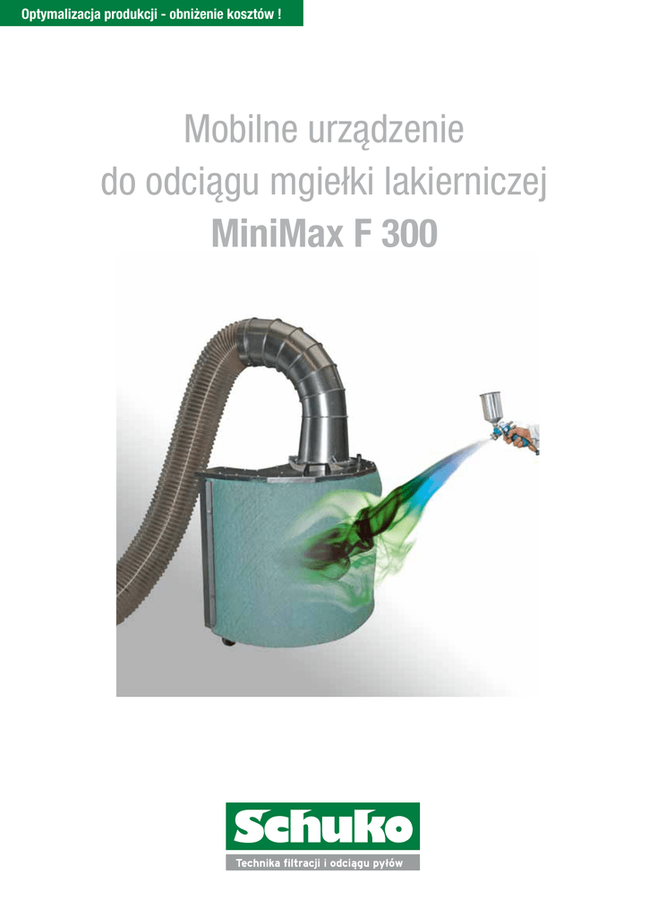 Optymalizacja produkcji - obniżenie kosztów ! Mobilne urządzenie do odciągu mgiełki lakierniczej MiniMax F 300 Poprzez dwustopniową filtrację zagwarantowany jest większy stopień odseparowania mgiełki lakierniczej (mata filtracyjna drobnopyłowa kat. F5 według normy EN 779). Stabilna, samonośna konstrukcja została zamocowana na solidnym mechanizmie jezdnym. W związku z nielicznymi pracami związanymi z lakierowaniem, bejcowaniem oraz odparowaniem nie ma już więcej powodu, aby rezygnować z urządzenia do odciągu mgiełki lakierniczej. Urządzenie firmy Schuko jest korzystne cenowo i nie zabiera dużo miejsca. MiniMax Typ F 300 Numer artykułu: 517600 Przepływ powietrza: 5200 m3/h, 900 Pa Wymiary [dł. x szer. x wys.]: Moc silnika: Waga: 1250 x 820 x 1460 mm 1,5 kW, 400 V, 50 Hz 140 kg Blachy kierunkujące opcjonalnie przepływ powietrza: Urządzenie wyposażone jest ponadto w: - przewód o dł. 7 m, - wyłącznik samoczynny silnikowy (Umiejscowienie wyłącznika poza strefą Atex) W kwestii umiejscowienia urządzenia i odprowadzenia powietrza oczyszczonego proszę przestrzegać przepisów i norm obowiązujących w danym kraju. Oszczędzanie energii chroni środowisko. Opcjonalnie poszycie blaszane kierunkujące przepływ powietrza www. schuko.de/pl DE-49196 Bad Laer Tel. +49 (0) 54 24 / 8 06-0 Fax +49 (0) 54 24 / 8 06-80 DE-88348 Bad Saulgau Tel. +49 (0) 75 81 / 48 71-0 Fax +49 (0) 75 81 / 48 71-81 DE-97478 Knetzgau Tel. +49 (0) 95 27 / 92 28-0 Fax +49 (0) 95 27 / 92 28-32 DE-55481 Kirchberg/H. Tel. +49 (0) 67 63 / 5 01 Fax +49 (0) 67 63 / 5 04 DE-14959 Trebbin Tel. +49 (0) 3 37 31 / 867-0 Fax +49 (0) 3 37 31 / 867-55 DE-25451 Quickborn Tel. +49 (0) 41 06 / 76 71-0 Fax +49 (0) 41 06 / 76 71-1 PL 62-561 Ślesin Tel. +48 (0) 63 / 245 64 00 Fax +48 (0) 63 / 245 61 29 Printed in Germany /03/2013/ Zmiany techniczne i błędy zastrzeżone Energooszczędne i korzystne cenowo urządzenie Schuko, przeznaczone do odciągu mgiełki lakierniczej, łączy ze sobą zalety jednocześnie urządzenia stacjonarnego oraz mobilnego.