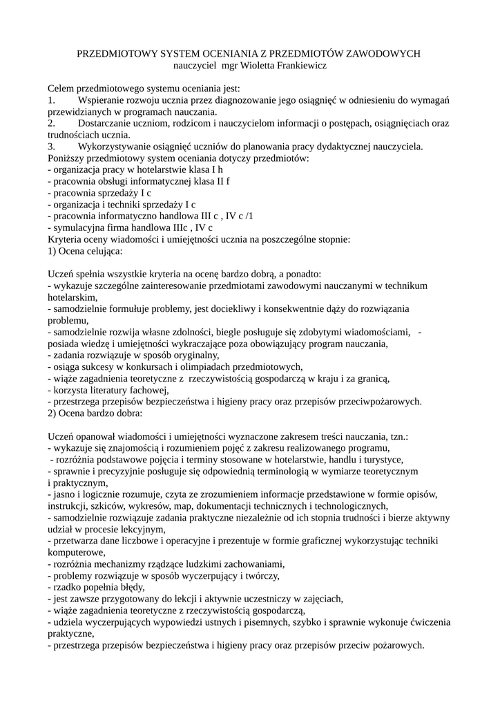PRZEDMIOTOWY SYSTEM OCENIANIA Z PRZEDMIOTÓW ZAWODOWYCH nauczyciel mgr Wioletta Frankiewicz Celem przedmiotowego systemu oceniania jest: 1. Wspieranie rozwoju ucznia przez diagnozowanie jego osiągnięć w odniesieniu do wymagań przewidzianych w programach nauczania. 2. Dostarczanie uczniom, rodzicom i nauczycielom informacji o postępach, osiągnięciach oraz trudnościach ucznia. 3. Wykorzystywanie osiągnięć uczniów do planowania pracy dydaktycznej nauczyciela. Poniższy przedmiotowy system oceniania dotyczy przedmiotów: - organizacja pracy w hotelarstwie klasa I h - pracownia obsługi informatycznej klasa II f - pracownia sprzedaży I c - organizacja i techniki sprzedaży I c - pracownia informatyczno handlowa III c , IV c /1 - symulacyjna firma handlowa IIIc , IV c Kryteria oceny wiadomości i umiejętności ucznia na poszczególne stopnie: 1) Ocena celująca: Uczeń spełnia wszystkie kryteria na ocenę bardzo dobrą, a ponadto: - wykazuje szczególne zainteresowanie przedmiotami zawodowymi nauczanymi w technikum hotelarskim, - samodzielnie formułuje problemy, jest dociekliwy i konsekwentnie dąży do rozwiązania problemu, - samodzielnie rozwija własne zdolności, biegle posługuje się zdobytymi wiadomościami, posiada wiedzę i umiejętności wykraczające poza obowiązujący program nauczania, - zadania rozwiązuje w sposób oryginalny, - osiąga sukcesy w konkursach i olimpiadach przedmiotowych, - wiąże zagadnienia teoretyczne z rzeczywistością gospodarczą w kraju i za granicą, - korzysta literatury fachowej, - przestrzega przepisów bezpieczeństwa i higieny pracy oraz przepisów przeciwpożarowych. 2) Ocena bardzo dobra: Uczeń opanował wiadomości i umiejętności wyznaczone zakresem treści nauczania, tzn.: - wykazuje się znajomością i rozumieniem pojęć z zakresu realizowanego programu, - rozróżnia podstawowe pojęcia i terminy stosowane w hotelarstwie, handlu i turystyce, - sprawnie i precyzyjnie posługuje się odpowiednią terminologią w wymiarze teoretycznym i praktycznym, - jasno i logicznie rozumuje, czyta ze zrozumieniem informacje przedstawione w formie opisów, instrukcji, szkiców, wykresów, map, dokumentacji technicznych i technologicznych, - samodzielnie rozwiązuje zadania praktyczne niezależnie od ich stopnia trudności i bierze aktywny udział w procesie lekcyjnym, - przetwarza dane liczbowe i operacyjne i prezentuje w formie graficznej wykorzystując techniki komputerowe, - rozróżnia mechanizmy rządzące ludzkimi zachowaniami, - problemy rozwiązuje w sposób wyczerpujący i twórczy, - rzadko popełnia błędy, - jest zawsze przygotowany do lekcji i aktywnie uczestniczy w zajęciach, - wiąże zagadnienia teoretyczne z rzeczywistością gospodarczą, - udziela wyczerpujących wypowiedzi ustnych i pisemnych, szybko i sprawnie wykonuje ćwiczenia praktyczne, - przestrzega przepisów bezpieczeństwa i higieny pracy oraz przepisów przeciw pożarowych. 3) Ocena dobra: Uczeń opanował wiadomości i umiejętności wyznaczone zakresem treści nauczania, tzn.: - wykazuje się znajomością i rozumieniem wielu pojęć z zakresu realizowanego programu, - określa podstawowe pojęcia z zakresu hotelarstwa, handlu, turystyki, - sprawnie, ale nie zawsze precyzyjnie posługuje się odpowiednią terminologią w wymiarze teoretycznym i praktycznym, - logicznie rozumuje, przy czym nie zawsze wybiera najprostszy sposób rozwiązania, - potrafi stosować wiedzę i umiejętności do rozwiązywania zadań praktycznych, - przy rozwiązywaniu problemu nie uwzględnia wszystkich aspektów, - potrafi znaleźć błąd w swoim rozumowaniu, - sporadycznie zdarza mu się nieprzygotowanie do zajęć, - samodzielnie rozwiązuje typowe zadania teoretyczne i praktyczne, poprawnie wykorzystuje zdobytą wiedzę, - prawidłowo sporządza dokumenty związane z przygotowaniem, realizacją, sprzedażą i rozliczenie usług hotelarskich oraz kompleksowo obsługą klienta – wykorzystując techniki komputerowe, - sprawnie wykonuje zadane ćwiczenia praktyczne z wykorzystaniem nowoczesnego sprzętu - przestrzega przepisów bezpieczeństwa i higieny pracy oraz przepisów przeciw pożarowych. 4) Ocena dostateczna: Uczeń opanował wiadomości i umiejętności istotne tzn.: - zna i rozumie podstawowe pojęcia i stosuje je do rozwiązywania typowych zadań, - przy rozwiązywaniu zadań nie zawsze sprawnie posługuje się odpowiednią terminologią, - czasami samodzielnie analizuje zadania o wyższym poziomie trudności, - najczęściej rozwiązuje zadania przy niewielkiej pomocy nauczyciela, - zwykle jest przygotowany do zajęć i aktywnie w nich uczestniczy, - ma niewielkie trudności z wykonywaniem ćwiczeń praktycznych, - popełnia błędy rzeczowe w zakresie podstawowych pojęć z zakresu hotelarstwa, -samodzielnie rozwiązuje typowe zadania o średnim stopniu trudności, odtwarza wiadomości bez szerszej wiedzy ekonomicznej, - przestrzega przepisów bezpieczeństwa i higieny pracy oraz przepisów przeciw pożarowych. 5) Ocena dopuszczająca: Uczeń opanował wiadomości i umiejętności, które są konieczne, aby mógł kontynuować naukę. Braki w opanowaniu obowiązkowych treści z podstawy programowej nie uniemożliwiają uzyskania przez ucznia podstawowych wiadomości w następnej klasie lub semestrze. Uczeń może mieć trudności z całościowym opanowaniem podstawy programowej, potrafi sobie przyswoić materiał jedynie działami programu w pewnych okresach czasowych tzn.: - zna podstawowe pojęcia, intuicyjnie rozumie ich treść, podaje przykłady dla tych pojęć, - analizuje i rozwiązuje nawet łatwiejsze zadania przy pomocy nauczyciela, czasami samodzielnie potrafi rozwiązać zadania proste w sytuacjach typowych, - zna algorytmy służące do rozwiązywania zadań standartowych, - zadania rozwiązuje długo, niestarannie, - bardzo często popełnia błędy, - nie stosuje terminologii lub stosuje ją rzadko, bądź niepoprawnie, - rzadko bierze aktywny u