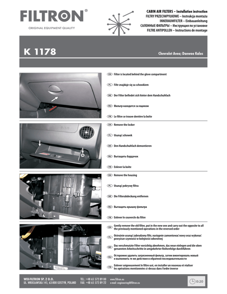 CABIN AIR FILTERS – Installation instruction FILTRY PRZECIWPYŁKOWE – Instrukcja montażu INNERAUMFILTER – Einbauanleitung САЛОННЫЕ ФИЛЬТРЫ – Инструкция по установке FILTRE ANTIPOLLEN – Instructions de montage K 1178 Chevrolet Aveo; Daewoo Kalos Filter is located behind the glove compartment Filtr znajduje się za schowkiem Der Filter befindet sich hinter dem Handschuhfach Фильтр находится за ящиком Le filtre se trouve derrière la boîte Remove the locker Usunąć schowek Den Handschuhfach demontieren Вытащить бардачок Enlever la boîte Remove the housing Usunąć pokrywę filtra Die Filterabdeckung entfernen Вытащить крышку фильтра Enlever le couvercle du filtre Gently remove the old filter, put in the new one and carry out the opposite to all the previously mentioned operations in the reversed order Ostrożnie usunąć zabrudzony filtr, następnie zamontować nowy oraz wykonać powyższe czynności w kolejności odwrotnej Das verschmutzte Filter vorsichtig abnehmen, das neue einlegen und die oben genannten Arbeitsschritte in umgekehrter Reihenfolge durchführen Осторожно удалить загрязненный фильтр, затем вмонтировать новый и выполнить те же действия в обратной последовательности Enlever soigneusement le filtre usé, en installer un nouveau et réaliser les opérations mentionnées ci-dessus dans l’ordre inverse WIX-FILTRON SP. Z O.O. TEL.:+48 65 572 89 00 www.filtron.eu UL. WROCŁAWSKA 145, 63-800 GOSTYŃ, POLAND FAX: +48 65 572 89 22 e-mail: [email protected] 0:20