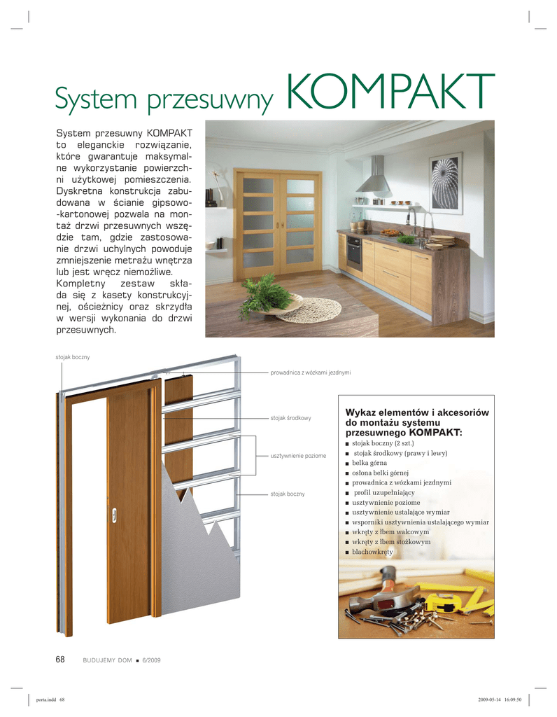 System przesuwny KOMPAKT System przesuwny KOMPAKT to eleganckie rozwiÈzanie, które gwarantuje maksymalne wykorzystanie powierzchni uĝytkowej pomieszczenia. Dyskretna konstrukcja zabudowana w Ăcianie gipsowo-kartonowej pozwala na montaĝ drzwi przesuwnych wszÚdzie tam, gdzie zastosowanie drzwi uchylnych powoduje zmniejszenie metraĝu wnÚtrza lub jest wrÚcz niemoĝliwe. Kompletny zestaw skïada siÚ z kasety konstrukcyjnej, oĂcieĝnicy oraz skrzydïa w wersji wykonania do drzwi przesuwnych. stojak boczny prowadnica z wózkami jezdnymi stojak Ărodkowy usztywnienie poziome stojak boczny 68 porta.indd 68 BUDUJEMY DOM Wykaz elementów i akcesoriów do montaĝu systemu przesuwnego KOMPAKT: stojak boczny (2 szt.) stojak Ărodkowy (prawy i lewy) belka górna osïona belki górnej prowadnica z wózkami jezdnymi profil uzupeïniajÈcy usztywnienie poziome usztywnienie ustalajÈce wymiar wsporniki usztywnienia ustalajÈcego wymiar wkrÚty z ïbem walcowym wkrÚty z ïbem stoĝkowym blachowkrÚty 6/2009 2009-05-14 16:09:50 Artykuï promocyjny 1 2 Montaĝ systemu rozpoczynamy od zïoĝenia kasety metalowej. Za pomocÈ blachowkrÚtów do stojaka bocznego i stojaków Ărodkowych przykrÚcamy usztywnienia poziome oraz wsporniki usztywnienia 4 Przy pomocy wkrÚtów z ïbem stoĝkowym przykrÚcamy szynÚ prowadnicy do belki górnej, zachowujÈc wymiar 50 mm do koñca belki 5 KasetÚ wstawiamy w ceownik wczeĂniej przygotowanego szkieletu Ăciany i ruchem obrotowym umieszczamy w otworze montaĝowym 7 Stojak boczny wstawiamy na swobodny koniec belki górnej i ruchem obrotowym ustawiamy go pionowo 8 NastÚpnie po ustaleniu poziomu belki górnej oraz pionu obu stojaków bocznych, przykrÚcamy je do profili pionowych szkieletu Ăciany. Dóï kasety przykrÚcamy do ceownika dolnego szkieletu Ăciany PrzykrÚcamy osïony belki górnej nad przejĂciem kasety, dosuwajÈc je do stojaków Ărodkowych. Usuwamy usztywnienia ustalajÈce wymiar oraz wsporniki usztywnieñ sïuĝÈce jedynie do ustawienia wymiaru przejĂcia 3 Stojak boczny i stojaki Ărodkowe wstÚpnie zmontowanej kasety przykrÚcamy do belki górnej przy pomocy wkrÚtów z ïbem walcowym 6 Wymiar przejĂcia ustalamy umieszczajÈc usztywnienia ustalajÈce w specjalnych wyciÚciach stojaka bocznego i wsporników przykrÚconych do stojaków Ărodkowych. Ustalony stojak boczny przykrÚcamy do belki górnej 9 Prowadnik doïu skrzydïa przykrÚcamy do posadzki pomiÚdzy stojakami Ărodkowymi kasety. Elementy wózków jezdnych wprowadzamy do prowadnicy i montujemy na skrzydle. Zawieszamy skrzydïo i sprawdzamy dziaïanie systemu. OĂcieĝnicÚ montujemy po obïoĝeniu szkieletu Ăciany pïytami kartonowo-gipsowymi PORTA KMI POLAND sp. z o.o. ul. Szkolna 26, 84-239, Bolszewo tel.: (58) 677 81 00 fax: (58) 677 81 99 www.porta.com.pl BUDUJEMY DOM porta.indd 69 6/2009 69 2009-05-14 16:11:07