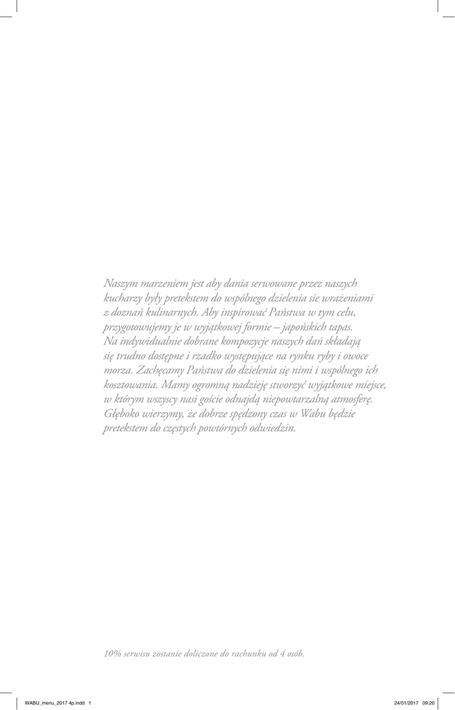 miejsce bigu Naszym marzeniem jest aby dania serwowane przez naszych kucharzy były pretekstem do wspólnego dzielenia sie wrażeniami z doznań kulinarnych. Aby inspirować Państwa w tym celu, przygotowujemy je w wyjątkowej formie – japońskich tapas. Na indywidualnie dobrane kompozycje naszych dań składają się trudno dostępne i rzadko występujące na rynku ryby i owoce morza. Zachęcamy Państwa do dzielenia się nimi i wspólnego ich kosztowania. Mamy ogromną nadzieję stworzyć wyjątkowe miejsce, w którym wszyscy nasi goście odnajdą niepowtarzalną atmosferę. Głęboko wierzymy, że dobrze spędzony czas w Wabu będzie pretekstem do częstych powtórnych odwiedzin. 10% serwisu zostanie doliczone do rachunku od 4 osób. miejsce bigu WABU_menu_2017 4p.indd 1 24/01/2017 09:20 miejsce bigu S U S H I & J A PA N E S E TA PA S WABU_menu_2017 4p.indd 2 24/01/2017 miejsce bigu 09:20 miejsce bigu ZUPY Miso-shiru – tradycyjna japońska zupa na bazie dashi z dodatkiem pasty sojowej klasyczna 15 ZŁ / łosoś 23 ZŁ / owoce morza 25 ZŁ Gyoza donburi – bulion wegetariański na bazie kombu z pierożkami warzywnymi 21 ZŁ Tom yum – pikantny bulion z mlekiem kokosowym, grzybami poku i kolendrą kurczak 31 ZŁ / krewetki 35 ZŁ Zarigani osuimono – esencjonalny bulion z szyjek rakowych, czerwonego miso i kombu 34 ZŁ P R Z Y S TAW K I Crispy nori – prażone nori 19 ZŁ Pierożki gyoza – japońskie pierożki z warzywami, kurczakiem, kaczką lub krewetką warzywa 23 ZŁ / kurczak 27 ZŁ / kaczka 29 ZŁ / krewetka 29 ZŁ Tori karage – marynowane kawałki kurczaka 23 ZŁ Spice hotategai – przegrzebki smażone z brokułami 45 ZŁ CE VICHE BY WABU Tomato ceviche – pomidorki cherry 19 ZŁ Salmon ceviche – łosoś 39 ZŁ Lemon fish ceviche – cobia 45 ZŁ Maguro ceviche – tuńczyk 45 ZŁ TEMPURA Veggie tempura – batat 2 szt., papryka 2 szt., cukinia 2 szt., lotos 3 szt., okra 3 szt. 33 ZŁ Baby shrimp tempura – baby krewetki w tempurze 49 ZŁ S U S H I & J A PA N E S E TA PA S miejsce bigu WABU_menu_2017 4p.indd 3 24/01/2017 09:20 miejsce bigu S A Ł AT Y Kimchi – pikantna sałatka z kiszonych warzyw 17 ZŁ Midori sarada – sezonowe warzywa z vinegrettem 17 ZŁ Wakame sarada – algi morskie, ogórek, tofu z dresingiem sojowo-sezamowym 19 ZŁ Taco namasu – sałatka z ośmiornicą i warzywami 29 ZŁ Tofu & mango sarada – sałatka z tofu, mango i liści szpinaku 33 ZŁ CIEPŁE WAR Z Y WA Edamame – fasolka sojowa 19 ZŁ Okra – okra smażona w mące kukurydzianej z sosem chili 21 ZŁ GRILLOWANE RYBY Łosoś – łosoś podawany ze słodkim sosem sojowym, miseczką ryżu 33 ZŁ Corvina – corvina podawana z sosem z czerwonego miso, miseczką ryżu 37 ZŁ WO ŁOWINA WAGYU Wagyu burger – burgery wagyu 3 szt. 75 ZŁ Wagyu carpaccio – cienko krojona wołowina, marynowane wasabi i sos yakiniku 109 ZŁ S U S H I & J A PA N E S E TA PA S WABU_menu_2017 4p.indd 4 24/01/2017 miejsce bigu 09:20 miejsce bigu SASHIMI 1 gatunek ryby – 5 kawałków do wyboru (łosoś, tuńczyk yellow fin, okoń) 45 ZŁ 1 gatunek ryby – 5 kawałków do wyboru (seriola,tuńczyk blue fin, węgorz, ośmiornica, gotowana krewetka, przegrzebek, małż czerwony) 55 ZŁ 3 gatunki ryby – 15 kawałków do wyboru (tuńczyk yellow fin, okoń, corvina, seriola, tuńczyk blue fin, węgorz, ośmiornica, gotowana krewetka, przegrzebek, małż czerwony) 160 ZŁ N E W S T Y L E SA SH I M I - 6 SZ T. Ponzu salmon sashimi – sashimi z łososia w sosie ponzu 39 ZŁ Sea bass sashimi – cienko krojony okoń morski z sosem yuzu 51 ZŁ Hamachi sashimi – cienko krojona seriola z sosem yuzu 59 ZŁ Toro sashimi – delikatnie przypalany tuńczyk toro, foie gras i marynowane wasabi 115 ZŁ TATA RY Tatar z łososia – miseczka / maki 36 ZŁ Tatar z tuńczyka – miseczka / maki 47 ZŁ Tatar z tuńczyka toro podany z czarnym kawiorem – miseczka 120 ZŁ S U S H I & J A PA N E S E TA PA S miejsce bigu WABU_menu_2017 4p.indd 5 24/01/2017 09:20 miejsce bigu N I G I R I - 2 SZ T. Nigiri tamago 13 ZŁ Nigiri kalmar 16 ZŁ Nigiri łosoś 19 ZŁ Nigiri okoń morski 26 ZŁ Nigiri gotowana krewetka 26 ZŁ Nigiri ośmiornica 27 ZŁ Nigiri tuńczyk 29 ZŁ Nigiri hokkigai 29 ZŁ Nigiri pieczony węgorz 34 ZŁ Nigiri seriola 35 ZŁ Nigiri krewetka + łosoś + awokado 41 ZŁ Nigiri tuńczyk blue fin 42 ZŁ Nigir łosoś + węgorz + awokado 42 ZŁ Nigiri hotategai 42 ZŁ Nigiri toro 52 ZŁ N E W S T Y L E N I G I R I - 2 SZ T. Nigiri kuromai z opalanym łososiem i dresingiem z orzechów 27 ZŁ Nigiri z okoniem w panko polanym salsą chili 29 ZŁ Nigiri z gotowaną krewetką z musem owocowym i prażonymi migdałami 31 ZŁ Nigiri kuromai z opalanym węgorzem i dresingiem z orzechów 35 ZŁ Nigiri z węgorzem w panco z salsą z awokado 35 ZŁ Nigiri z tuńczykiem tataki z pikantną salsą z ananasa i mięty 37 ZŁ Nigiri z przegrzebkiem zapieczone pod sosem cytrynowym z kawiorem 42 ZŁ Nigiri węgorz z foie gras i słodkim sosem 45 ZŁ Nigiri toro 52 ZŁ Nigiri z dzikim łososiem 52 ZŁ Nigiri toro z foie gras i słodkim sosem 67 ZŁ S U S H I & J A PA N E S E TA PA S WABU_menu_2017 4p.indd 6 24/01/2017 miejsce bigu 09:20 miejsce bigu G U N K A N & OYA KO M A K I - 2 S Z T. Gunkan tatar z łososia 27 ZŁ Gunkan ebi mayo 31 ZŁ Gunkan tatar z tuńczyka 33 ZŁ Gunkan tako mayo 33 ZŁ Gunkan kawior ikura 39 ZŁ Oyakomaki z jajem przepiórczym owiniętą w tuńczyka 41 ZŁ Oyakomaki z mięsem kraba owinięte w łososia 49 ZŁ Oyakomaki z kawiorem ikura owinięte w łososia 59 ZŁ HOSO M A K I - 6 SZ T. Hosomaki oshinko 13 ZŁ Hosomaki kampyo 13 ZŁ Hosomaki ogórek 13 ZŁ Hosomaki łosoś 19 ZŁ Hosomaki łosoś awokado 20 ZŁ Hosomaki tuńczyk 27 ZŁ Hosomaki z gotowaną krewetką 27 ZŁ Hosomaki z pieczonym węgorzem 33 ZŁ Hosomaki toro tartar 39 ZŁ S U S H I & J A PA N E S E TA PA S miejsce bigu WABU_menu_2017 4p.indd 7 24/01/2017 09:20 miejsce bigu F U TO M A K I - 6 SZ T. Futomaki z warzywami w tempurze 19 ZŁ Futomaki 